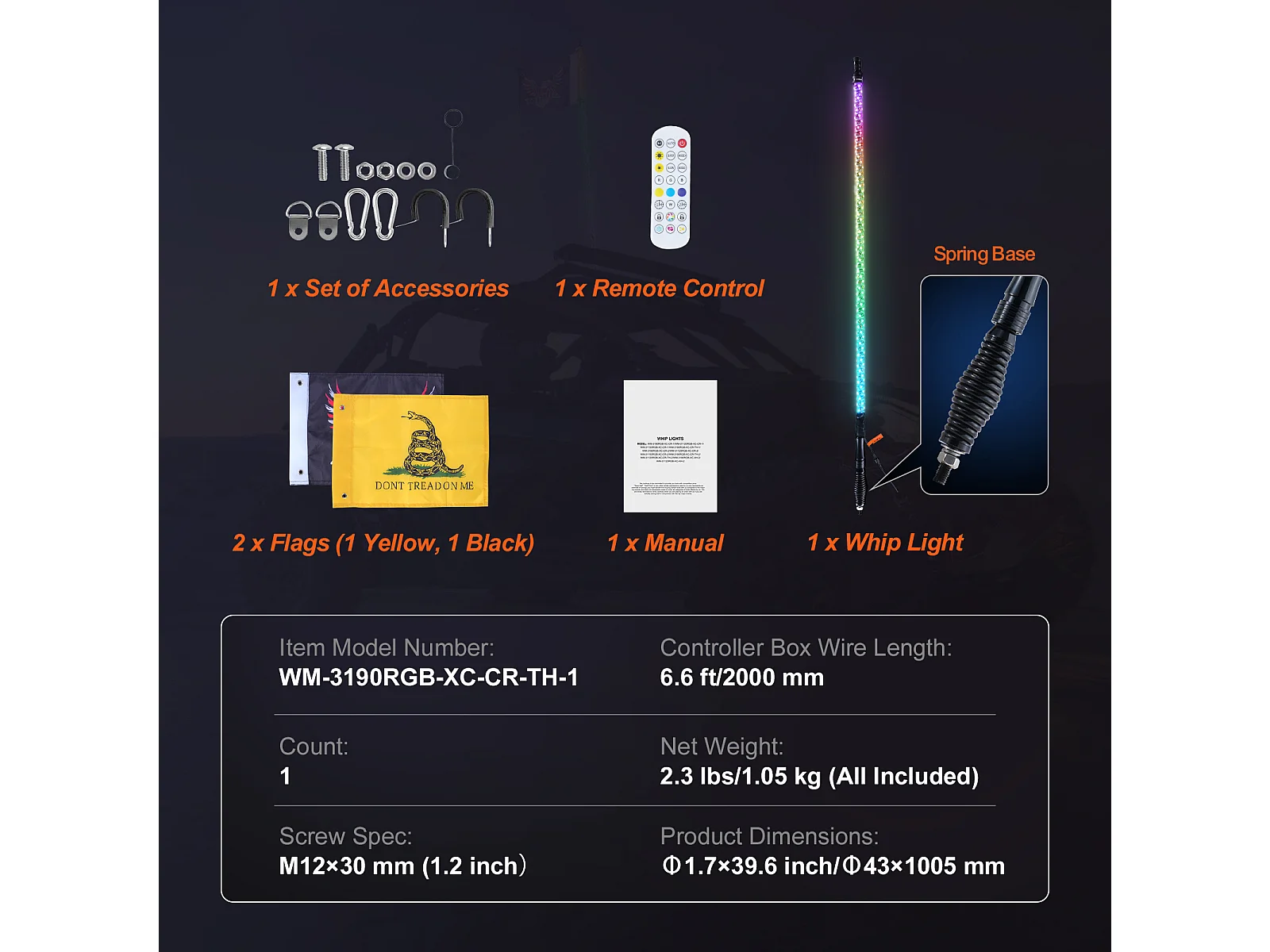 Fouet Lumineux LED SucceBuy Feu de Position à Ressort LED de 92 cm Avec Antenne en Spirale RVB Avec Télécommande et Application 1 Pièce