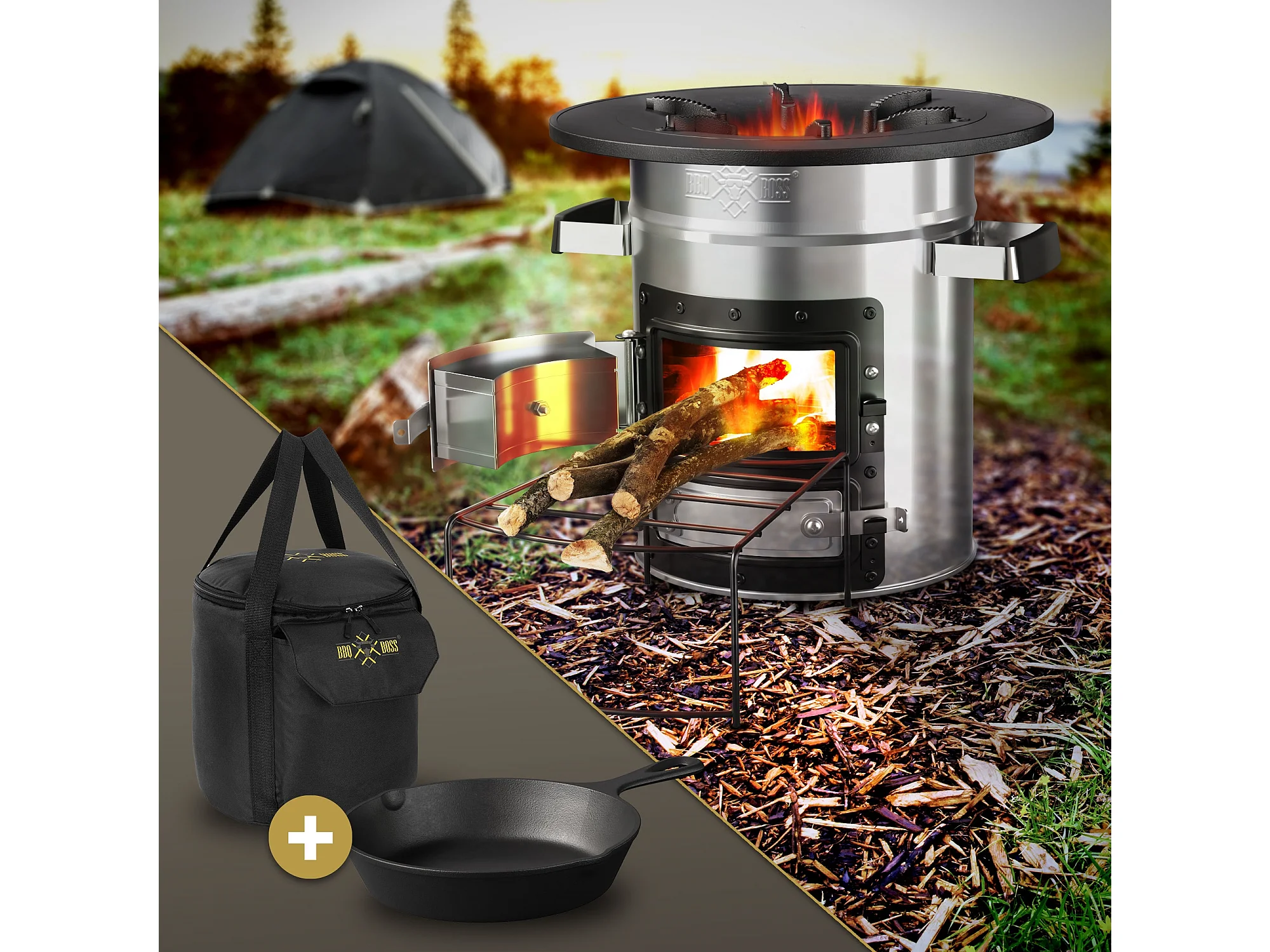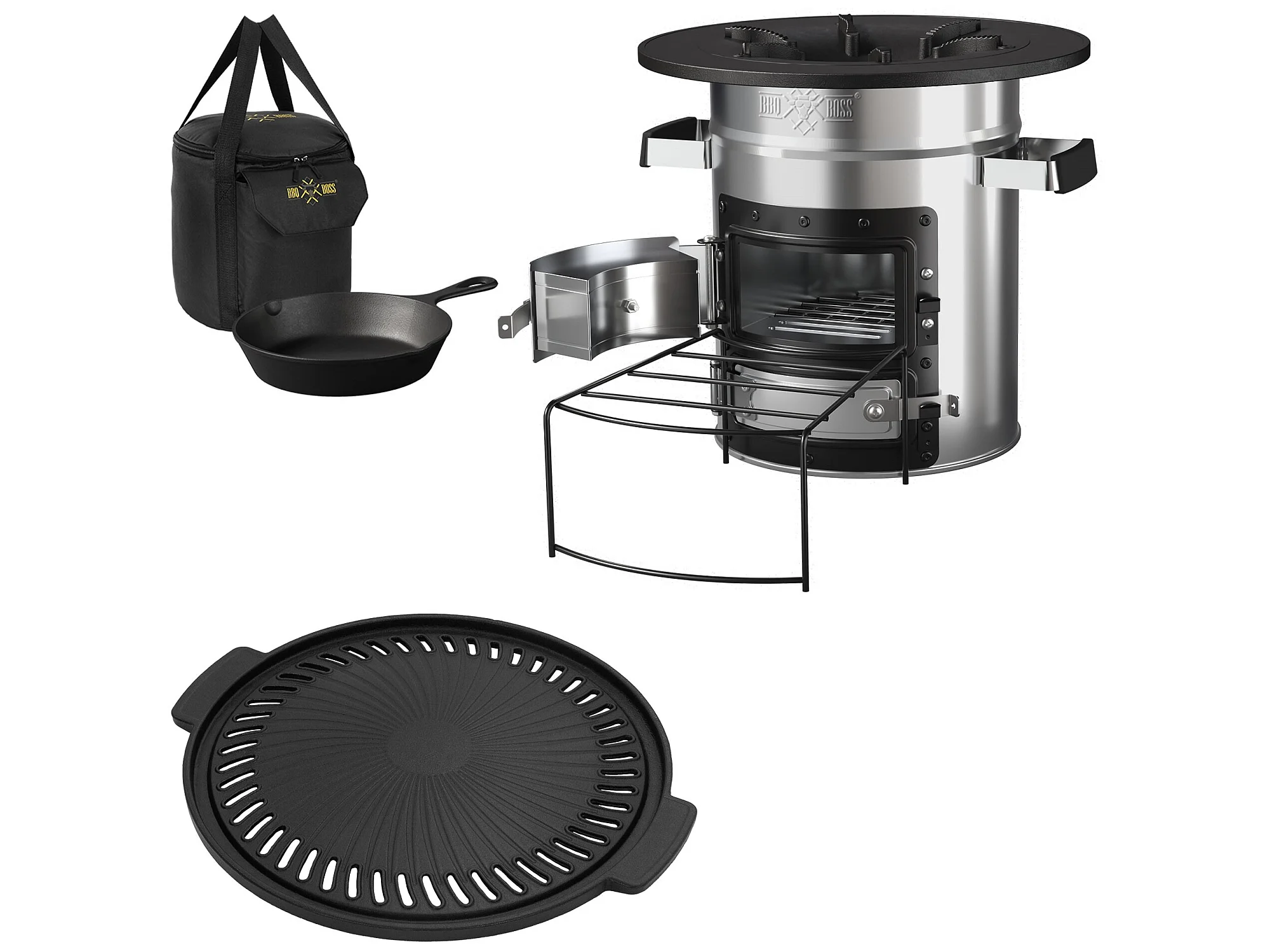 Four à fusée BBQ avec poêle en fonte grill acier noir camping +sac de transport