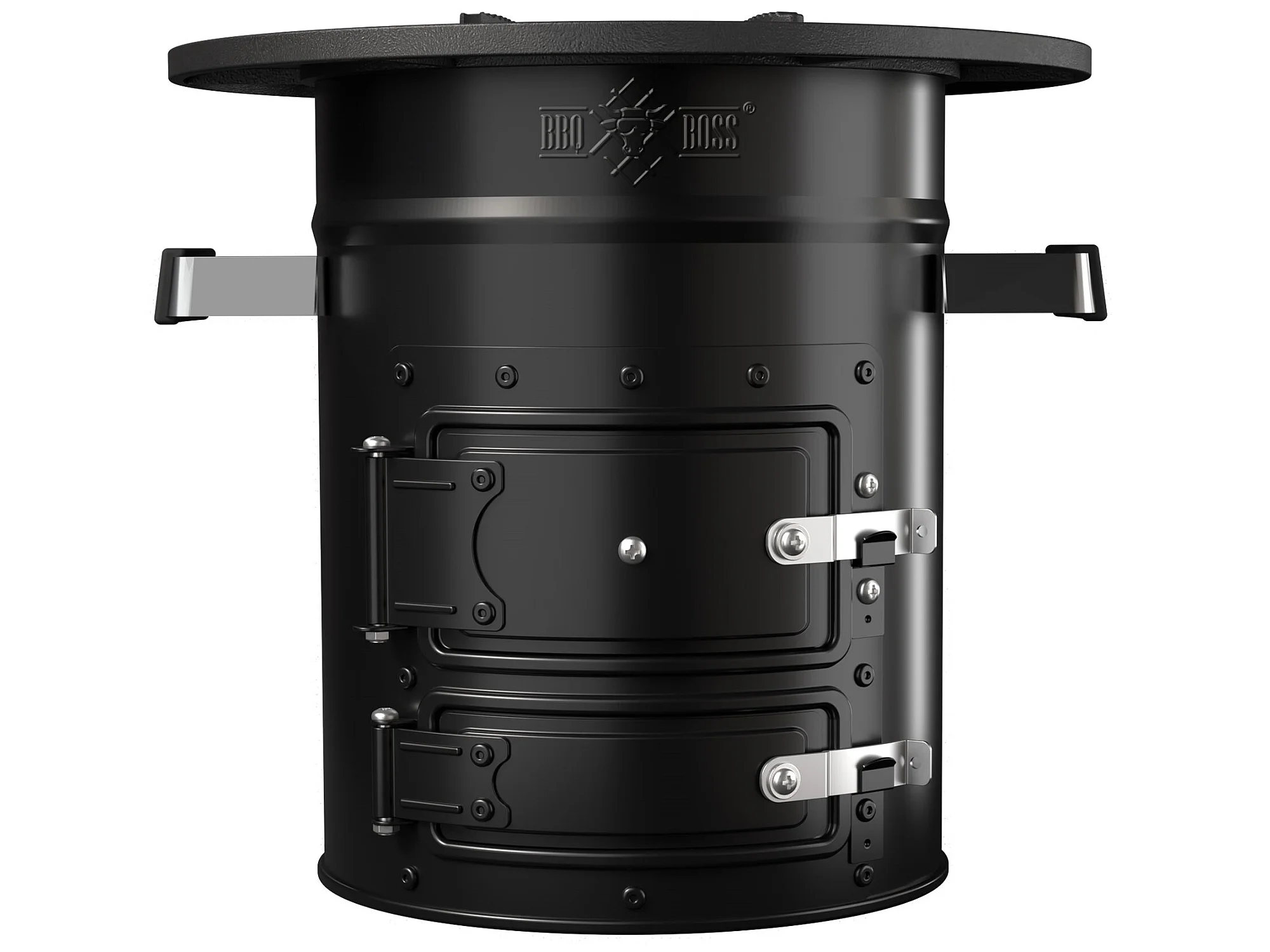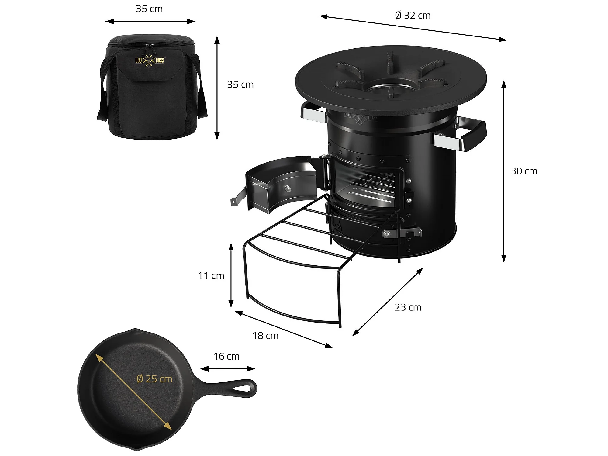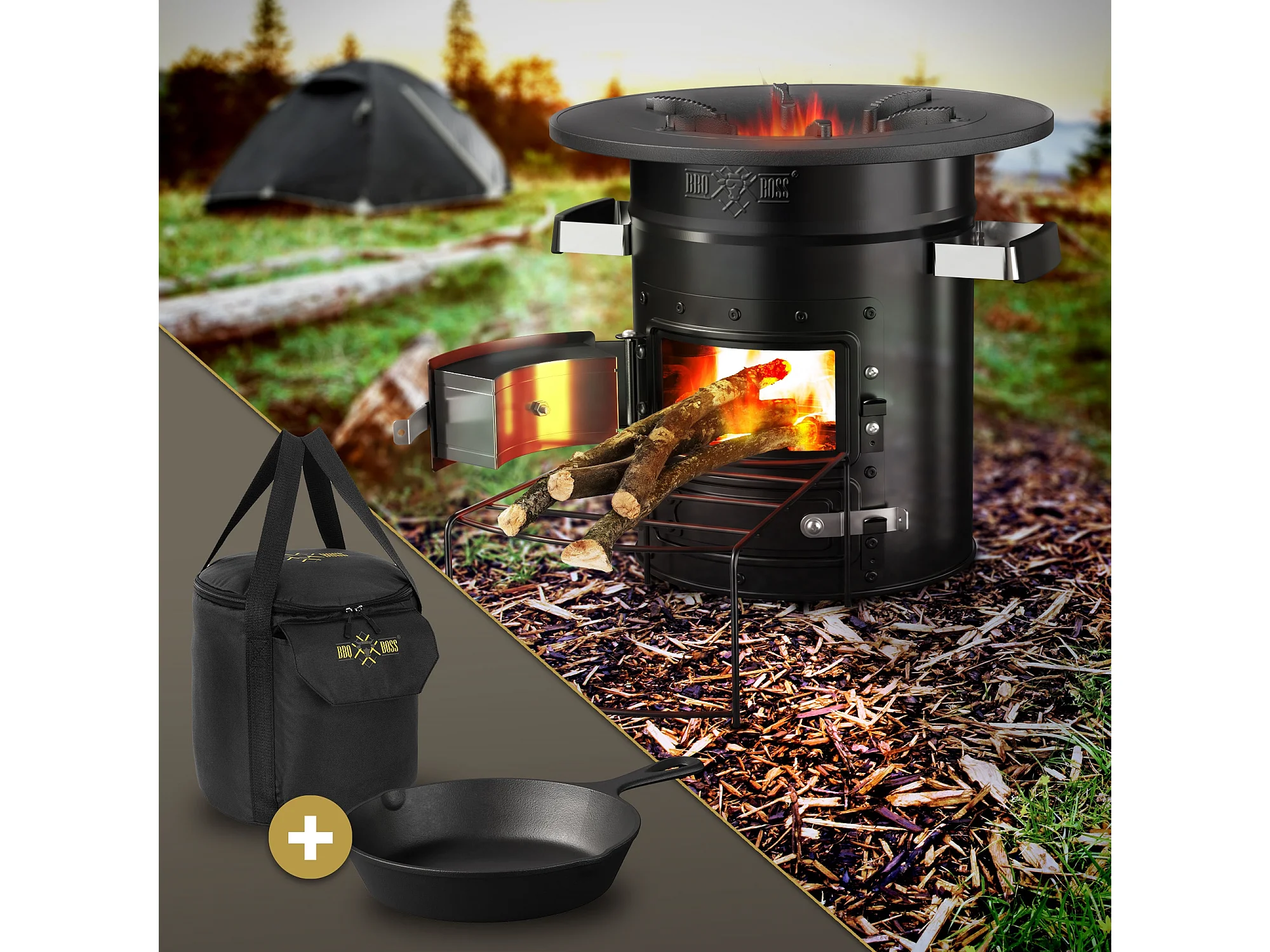 Four à fusée BBQ avec poêle en fonte grill acier noir camping +sac de transport