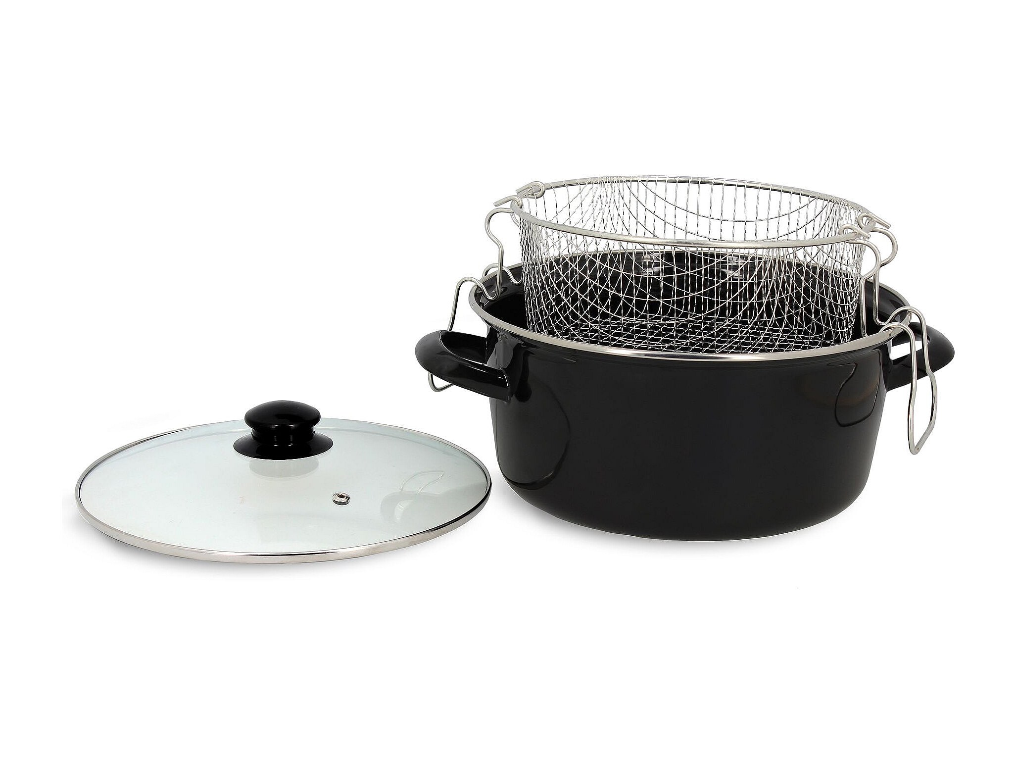 Menastyl - Friteuse 26cm En Acier Emaille Noir Avec Couvercle Et Panier Inox