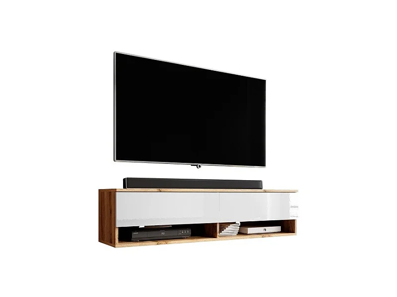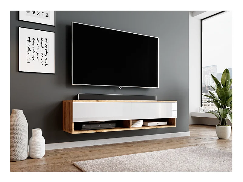 FURNIX meuble tv/ meuble tv suspendu Alyx 140 x 32 x 34 cm style industriel chêne wotan mat/ blanc brillant sans LED