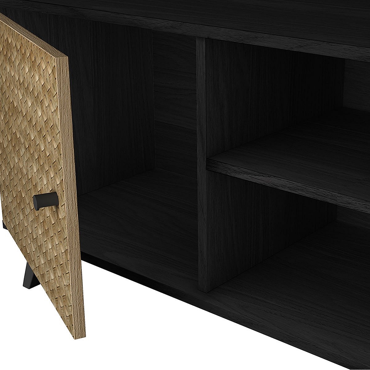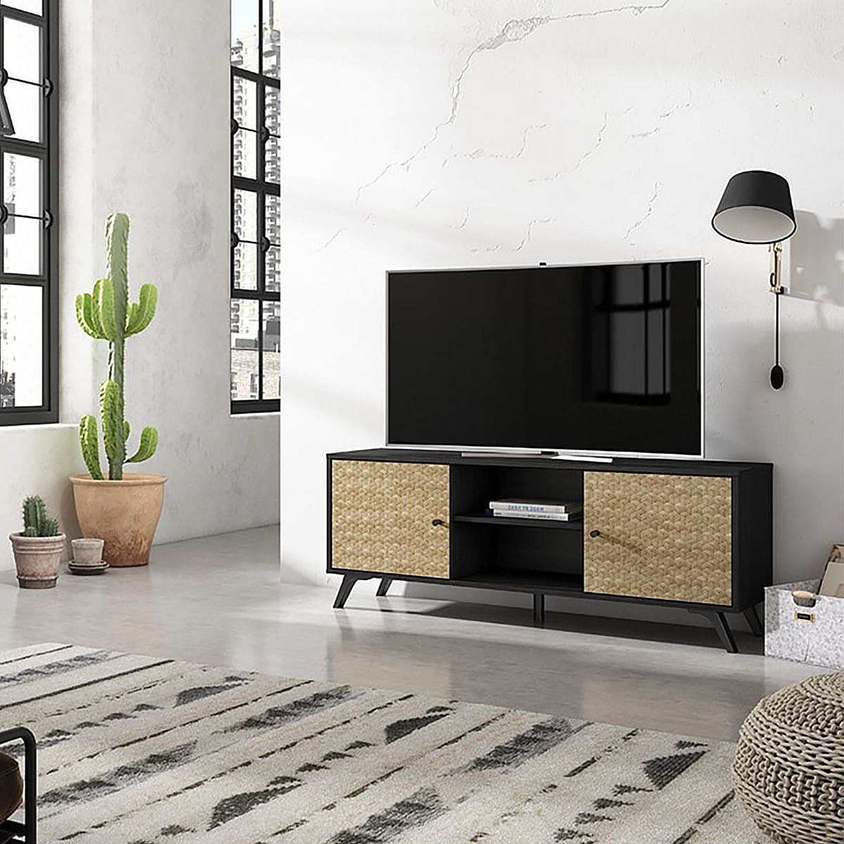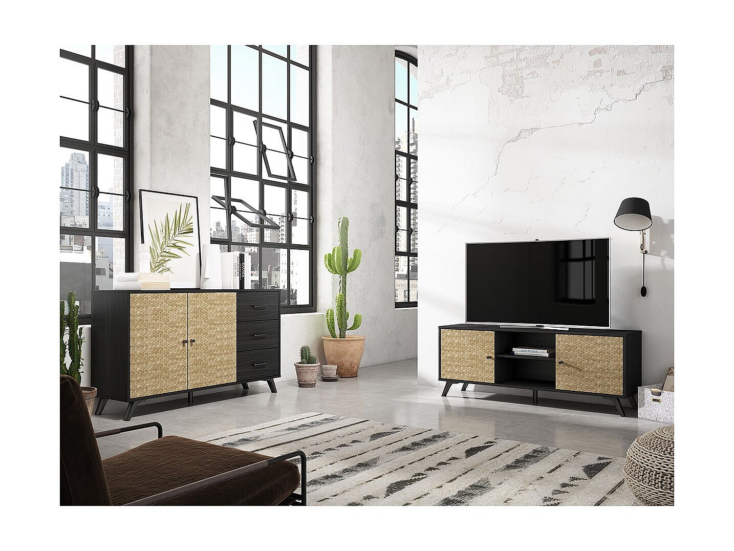 GADDI - Meuble TV 136cm 2 Portes Effet Bois Noir et Bambou Tressé