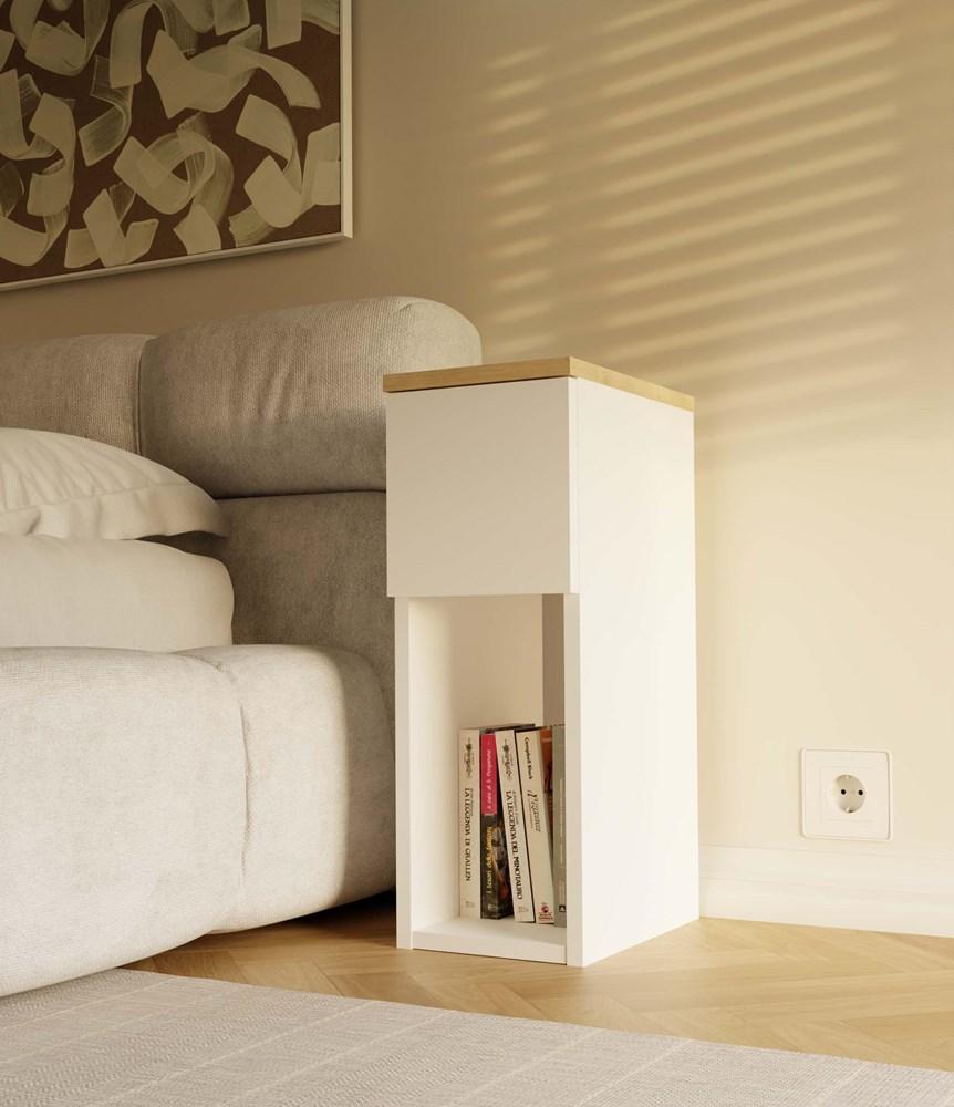 TABLE DE NUIT MODERNE / MEUBLE DE CHEVET AVEC TIROIR Série : GALAX Modèle : GALAX 20 1S Couleur : Corps blanc / plateau chêne artisan La table de nuit GALAX 20 1S allie praticité et esthétique dans un design moderne et minimaliste. Avec une niche ouverte et un tiroir pratique, elle offre un espace fonctionnel pour les objets essentiels comme un livre, un téléphone ou des lunettes. Son plateau en chêne artisan est parfait pour accueillir une lampe de chevet ou des éléments décoratifs. Le contraste élégant entre le blanc et le bois naturel s’intègre harmonieusement dans les intérieurs contemporains comme traditionnels. CARACTÉRISTIQUES : 1 niche ouverte + 1 tiroir Couleur fraîche et universelle Façade sans poignées Conception solide Fabrication en Pologne MATÉRIAUX : Panneau de particules mélaminé 16 mm Tiroir sur glissières à roulettes DIMENSIONS : Hauteur : 55 cm Largeur : 20 cm Profondeur : 30 cm ENTRETIEN : Nettoyer avec un chiffon doux et humide Éviter les produits chimiques abrasifs CONTENU DU COLIS : Table de nuit GALAX 20 1S en kit Notice de montage Accessoires de fixation inclus