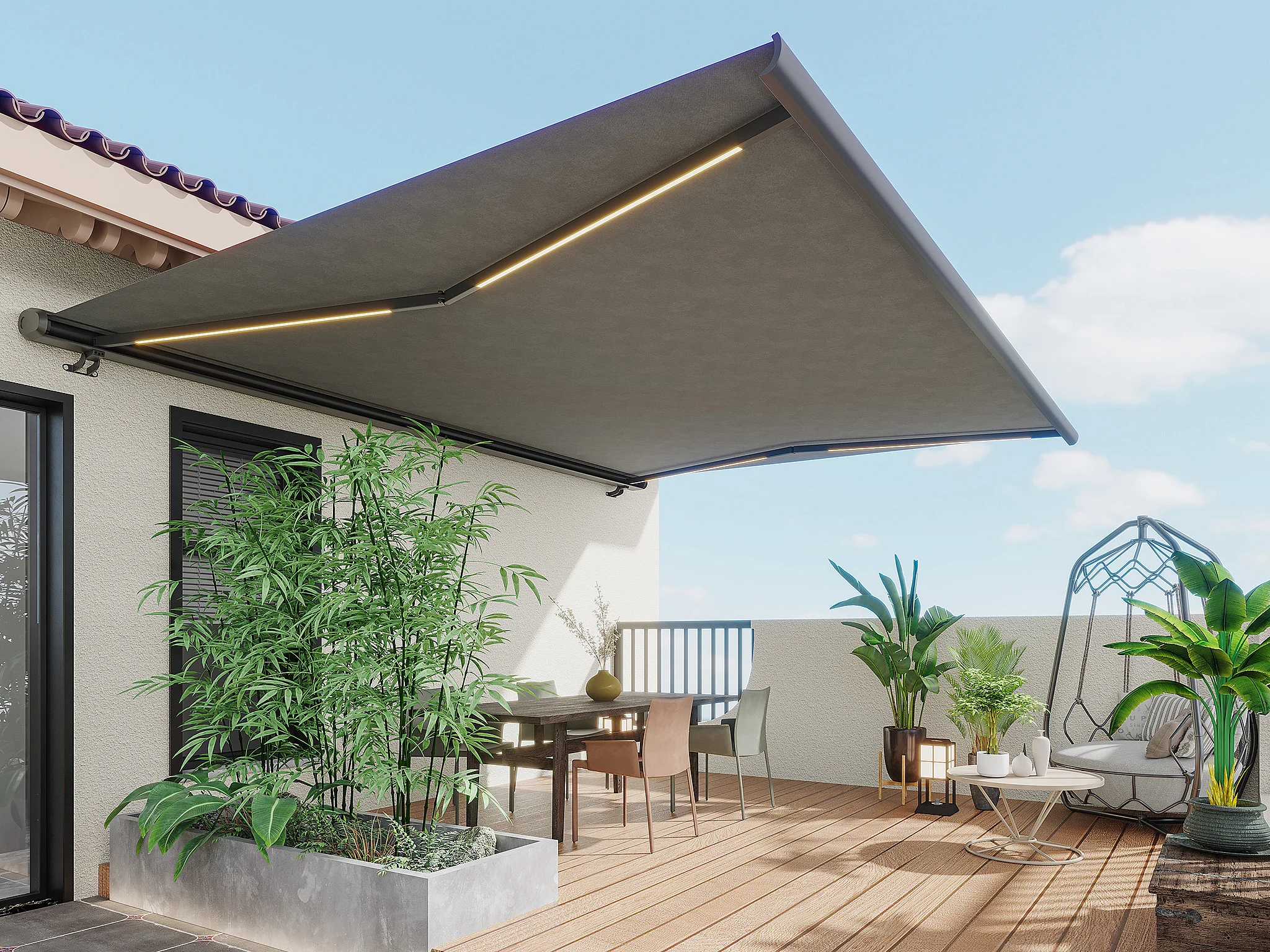 Store banne motorisé à leds avec coffre intégral et capteur de vent 4 x 3,5 m toile acrylique anthracite - GALAXA