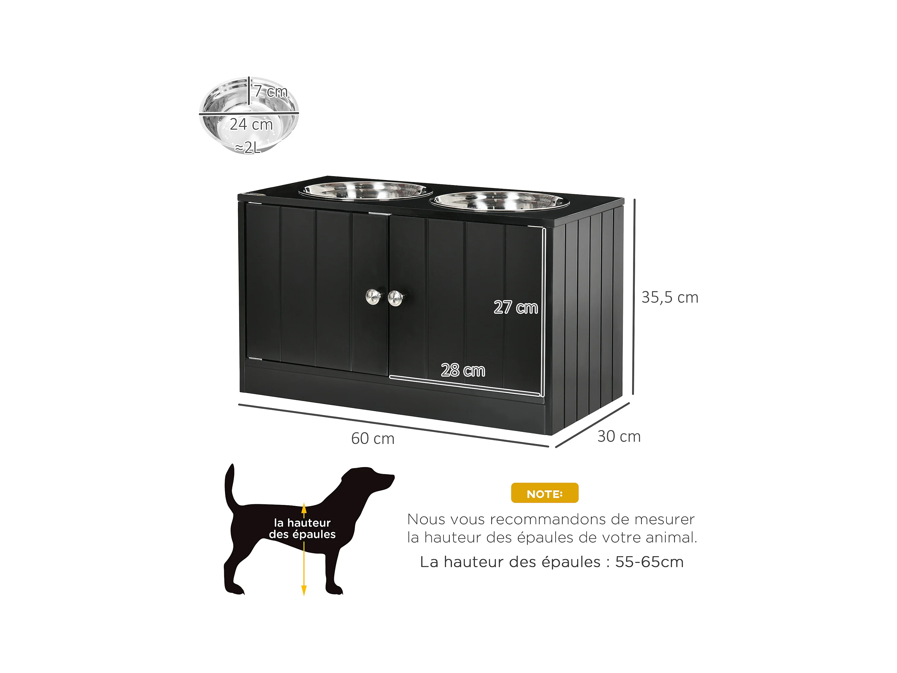 Gamelle double chien chat - porte-gamelles surélevé armoire 2 en 1 - 2 portes, 2 gamelles - acier inox. MDF noir