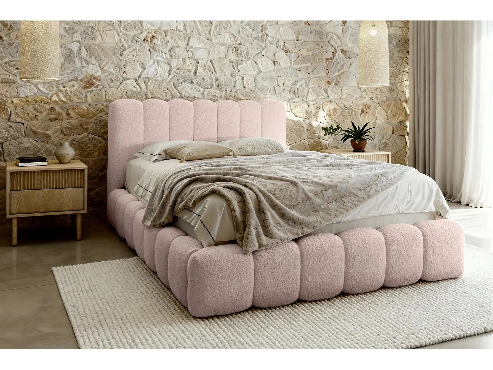 GARANCE - Lit coffre tissu chenille 140x200cm - Rose