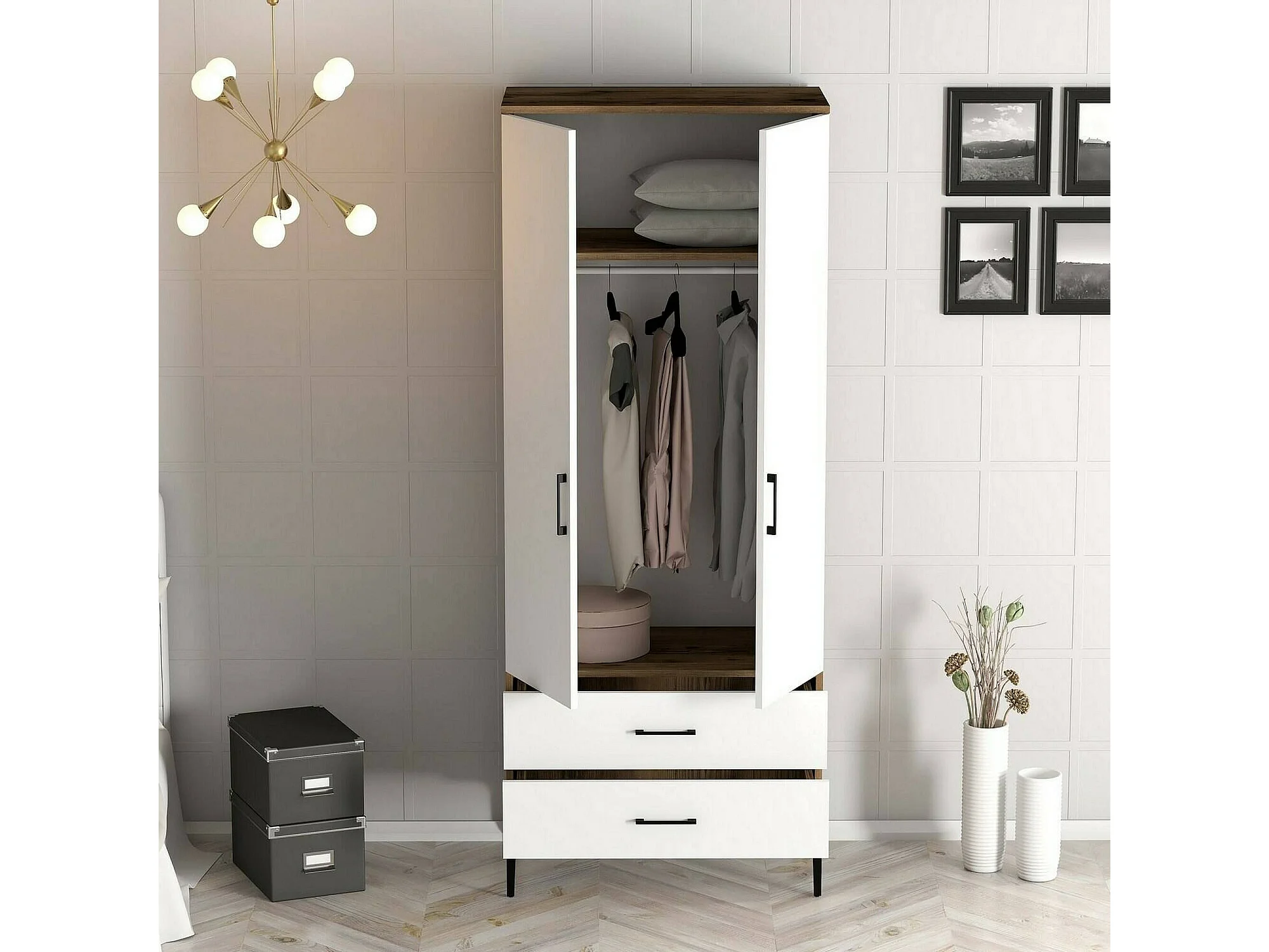 Garde-robe 2 portes Dpan, Meubles de chambre, Penderie de plain-pied, Placard à vêtements, 80x201h48 cm, Noyer et Blanc