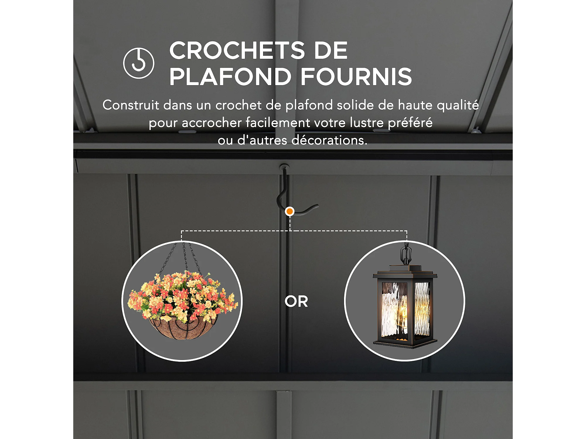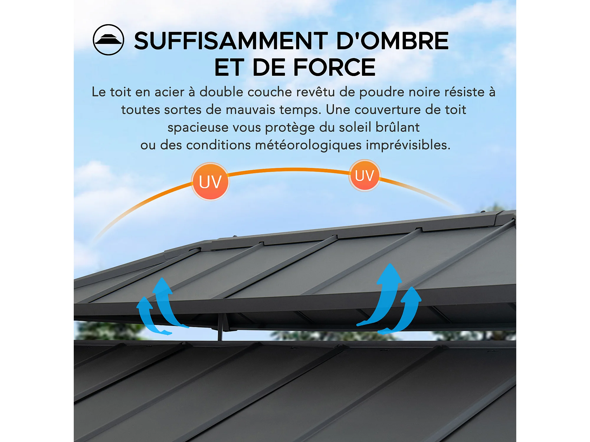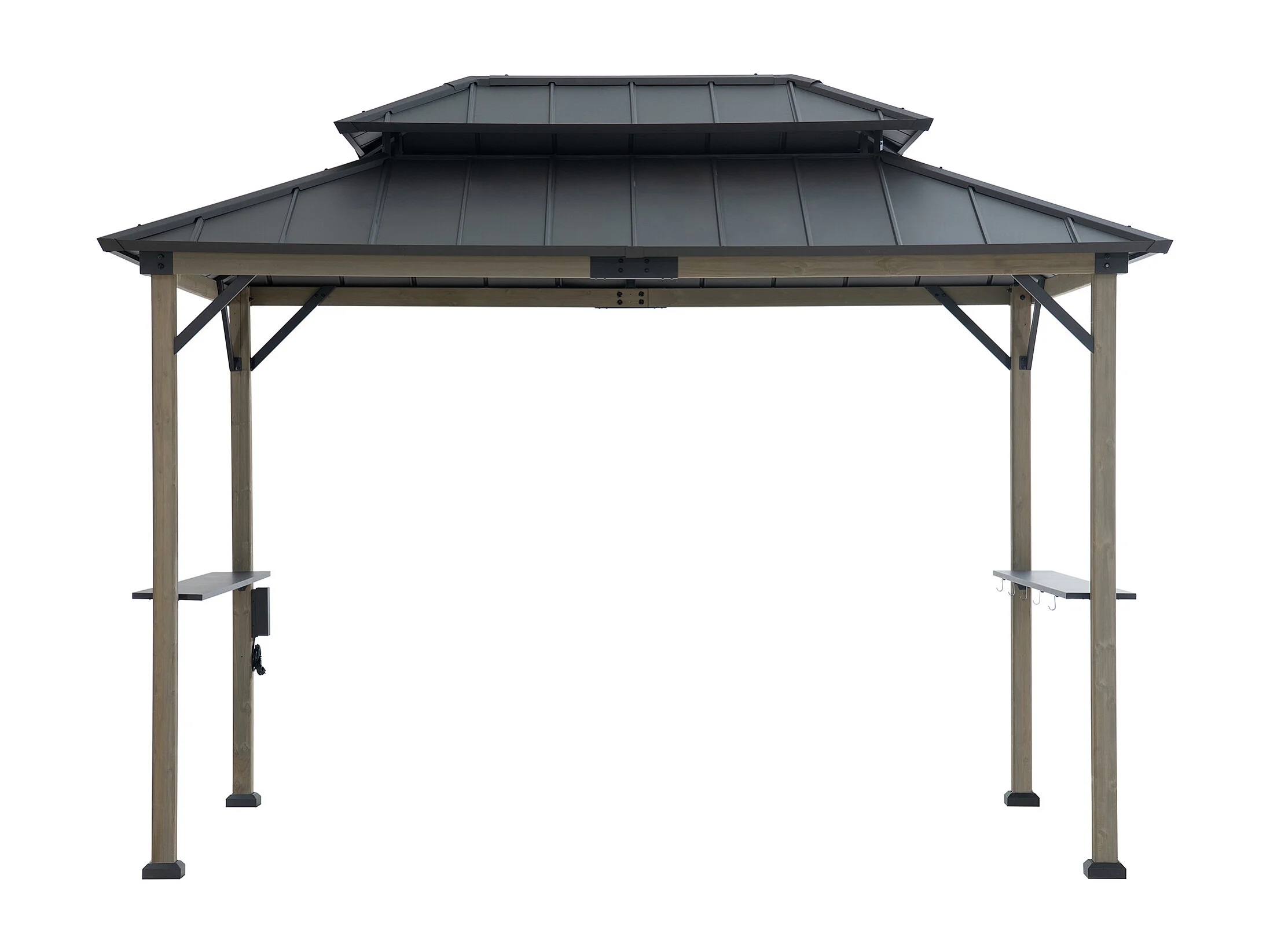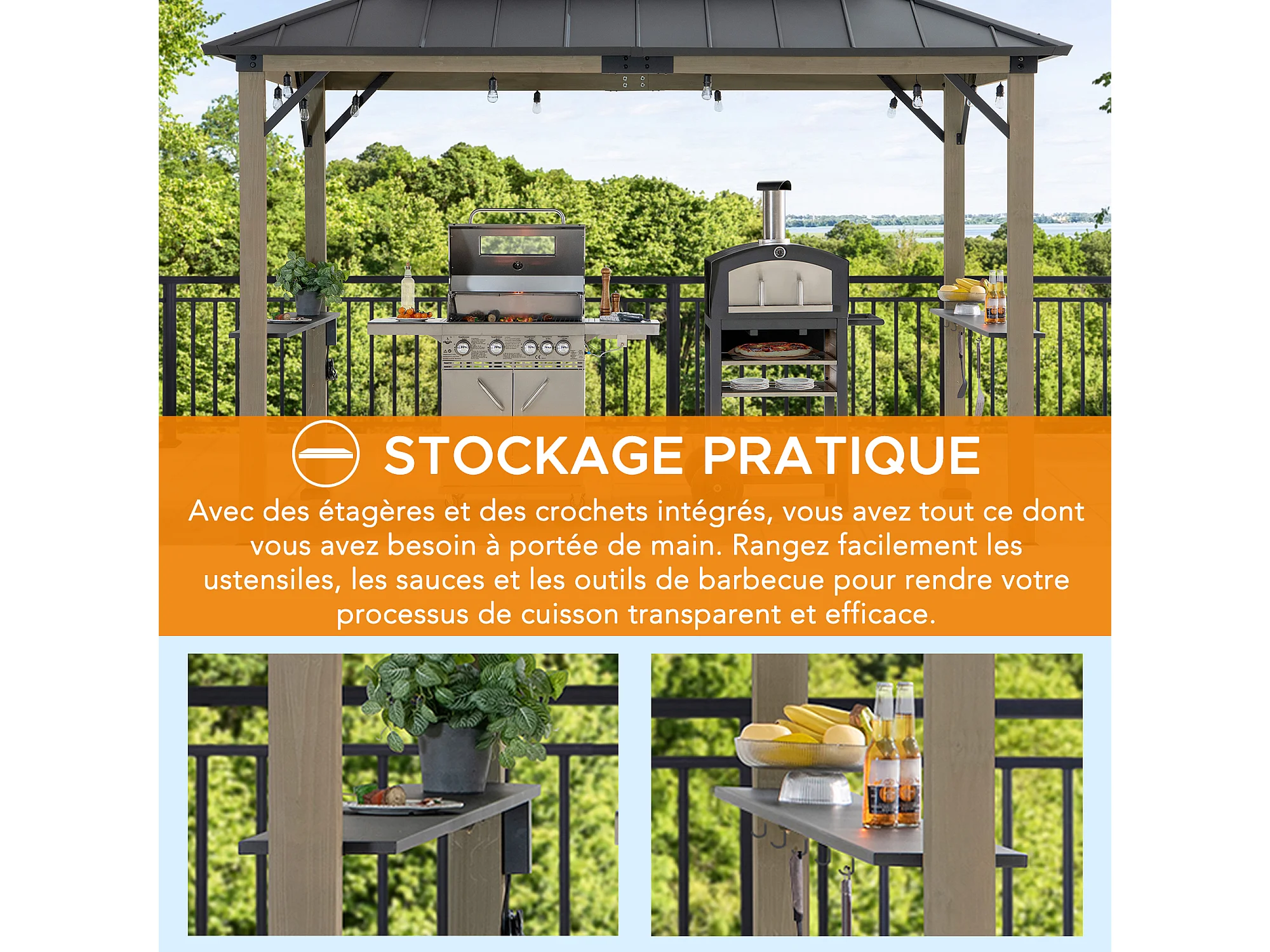 Gazebo pour barbecue ZUPO 360 cm x 240 cm, structure en bois, toit rigide, avec prises électriques et étagères, toit marron.