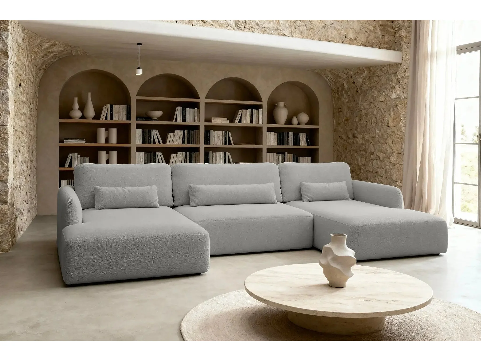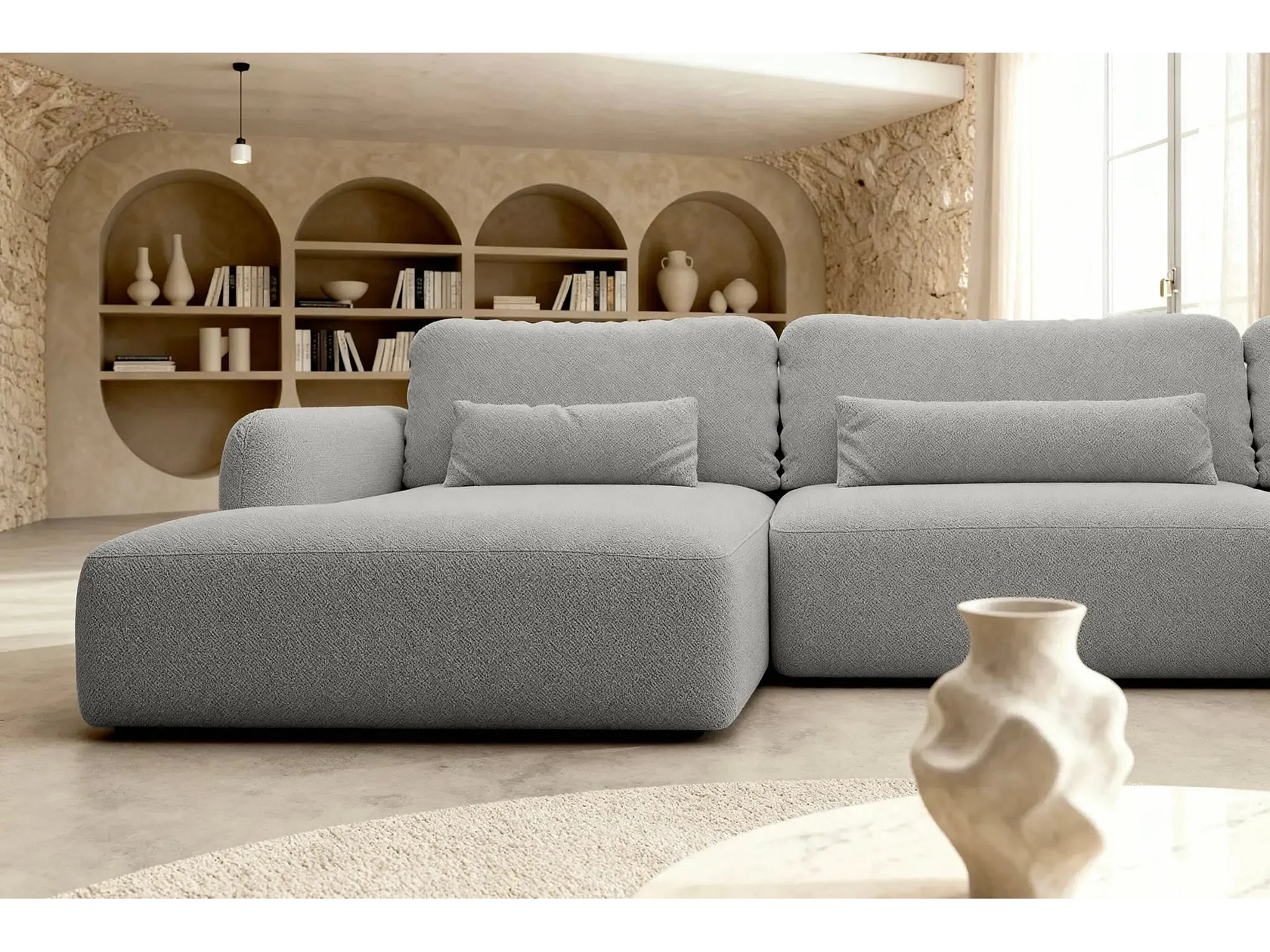 GIGI - Canapé panoramique convertible tissu bouclette 5 places - Gris clair
