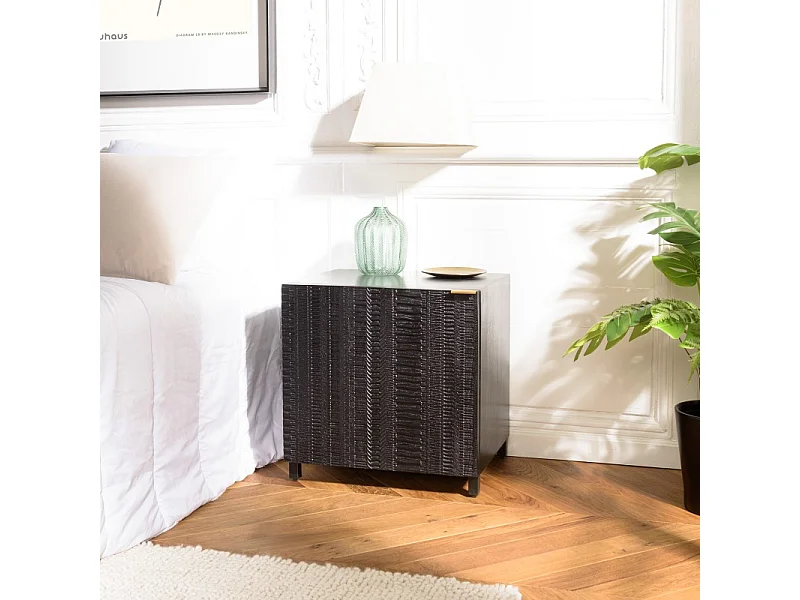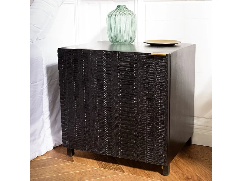 GLORIA - Table de chevet en bois de manguier 1 porte sculptée noir