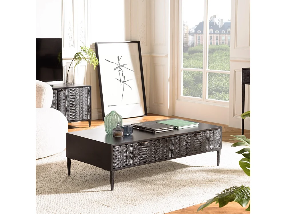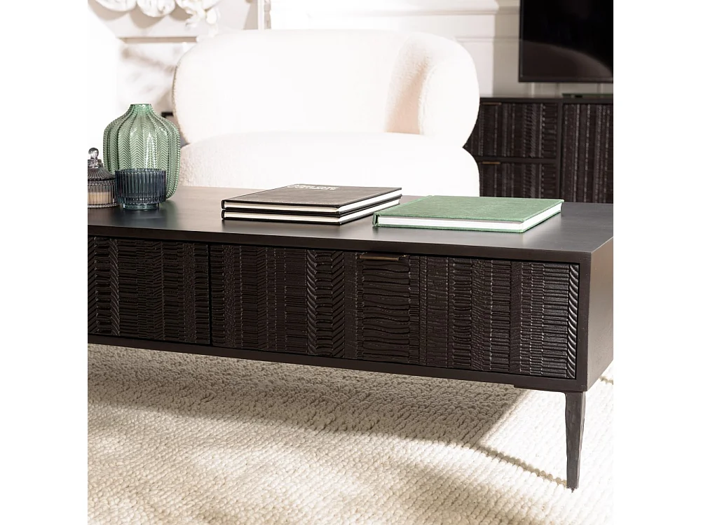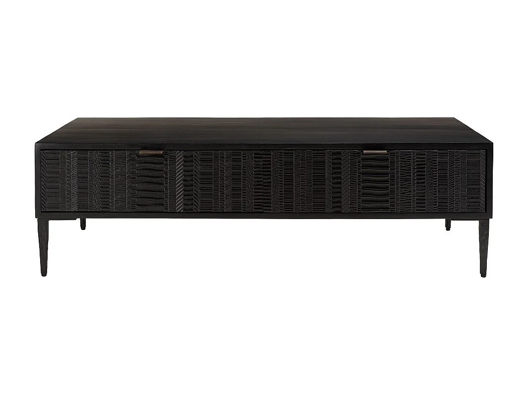 GLORIA - Table basse en bois de manguier 2 tiroirs sculptés noir