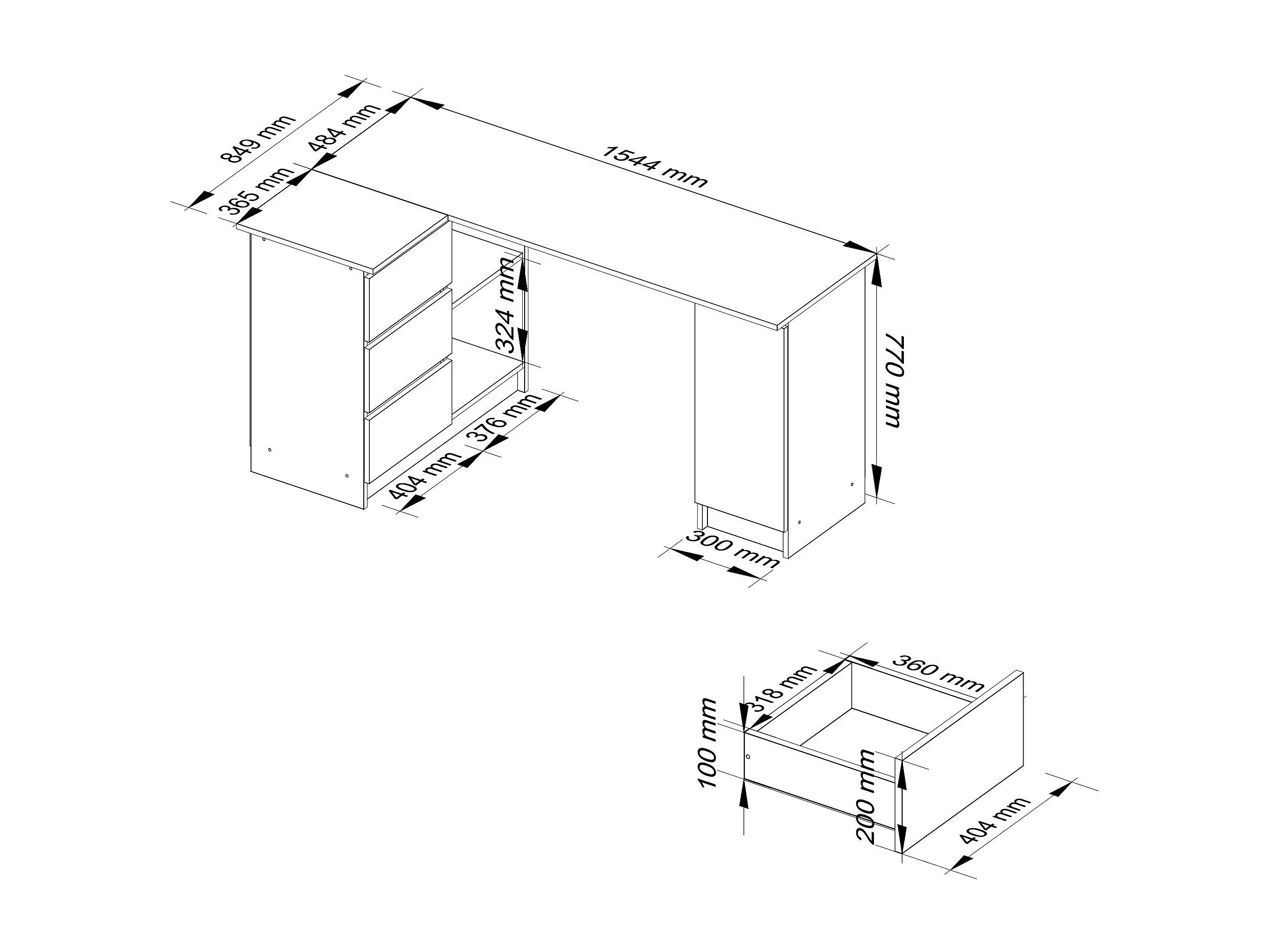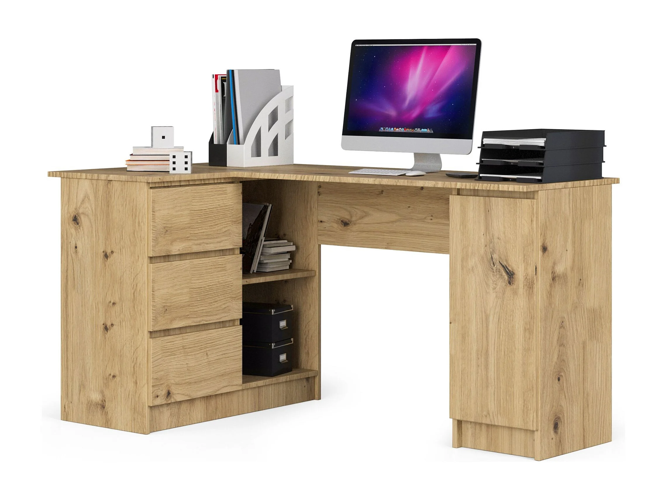 Grand bureau d'angle AKORD gauche B20 Chêne Artisan 155 cm 1 porte 3 tiroirs façade Chêne Artisan 4 étagères 155x85x77 cm