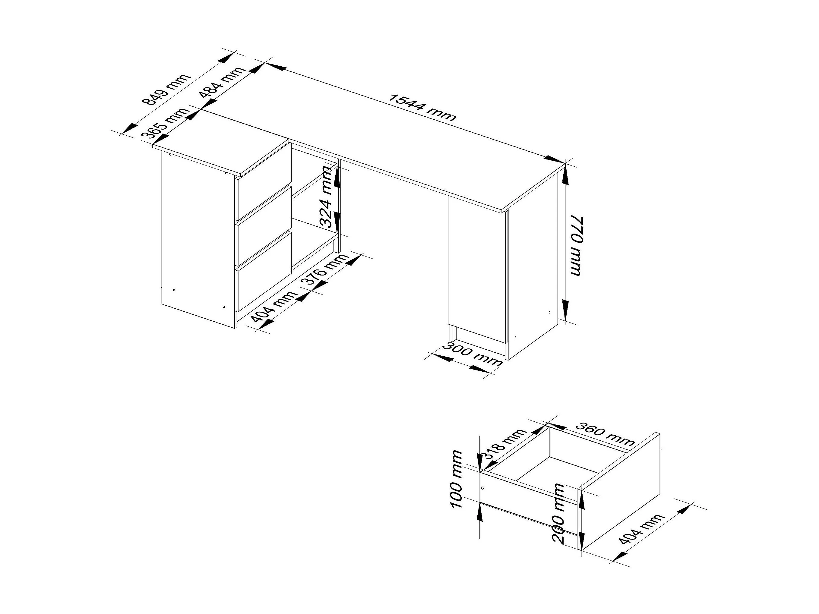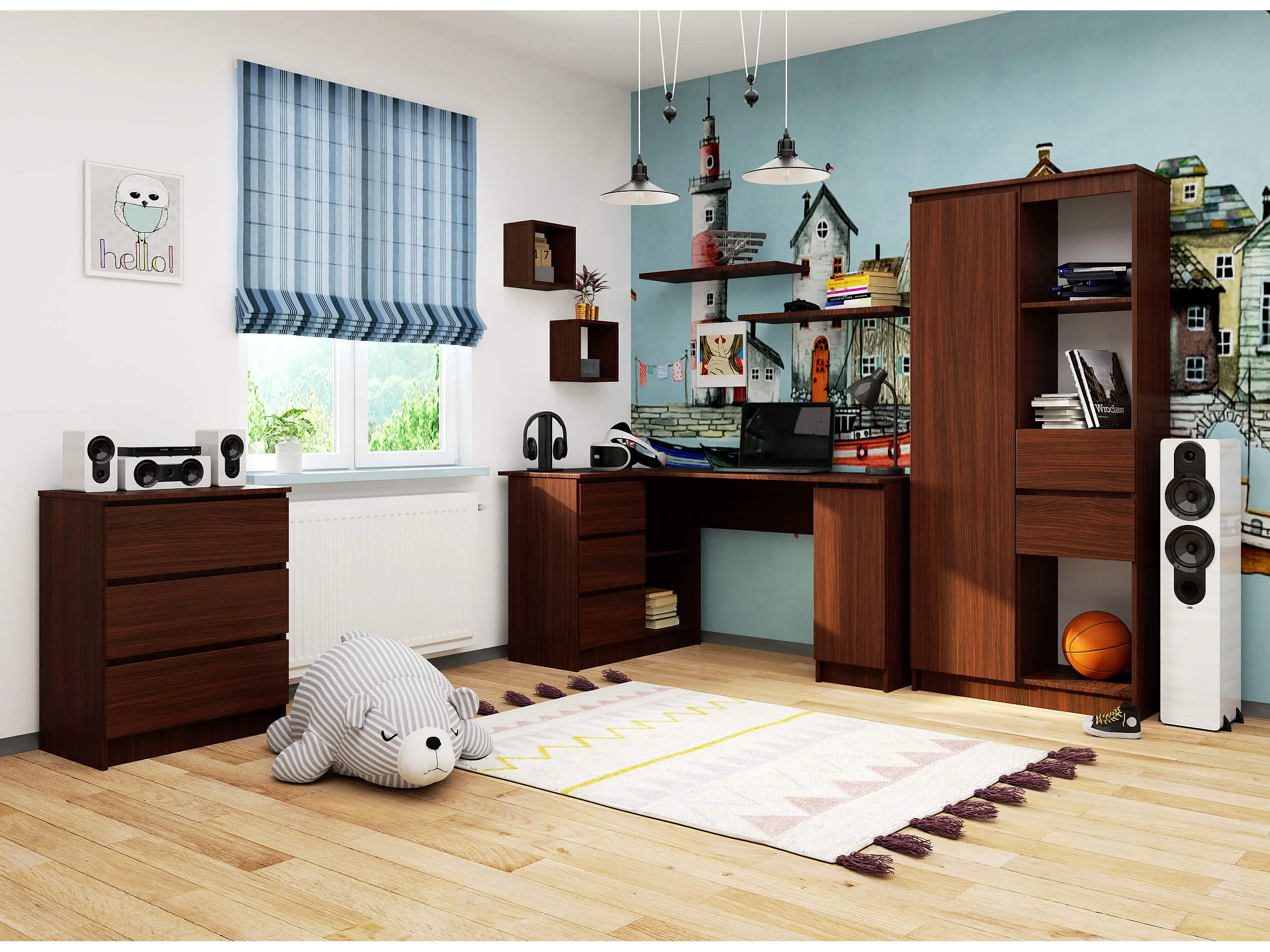 Grand bureau d'angle AKORD gauche B20 Wengé 155 cm 1 porte 3 tiroirs façade Wengé 4 étagères 155x85x77 cm