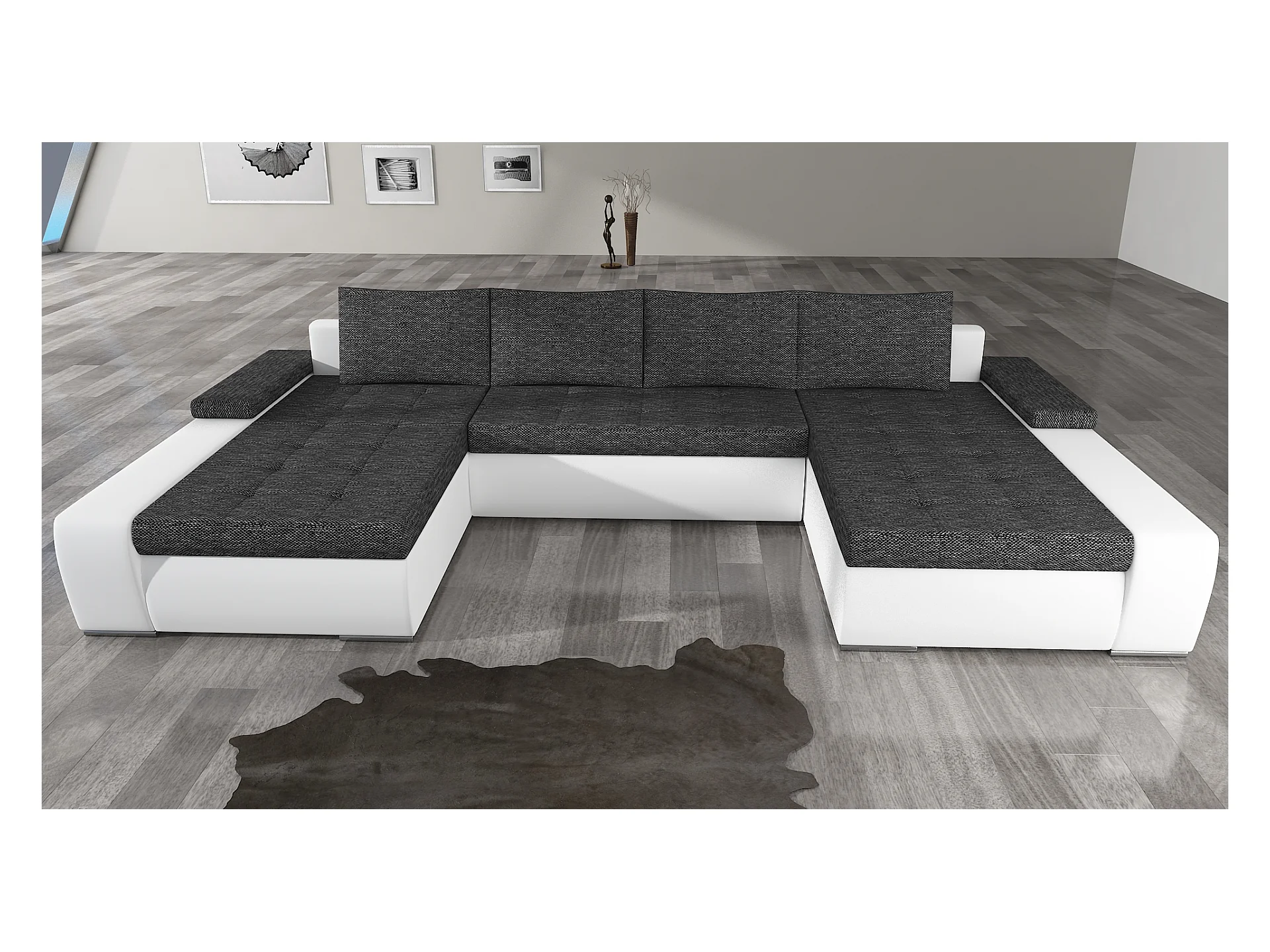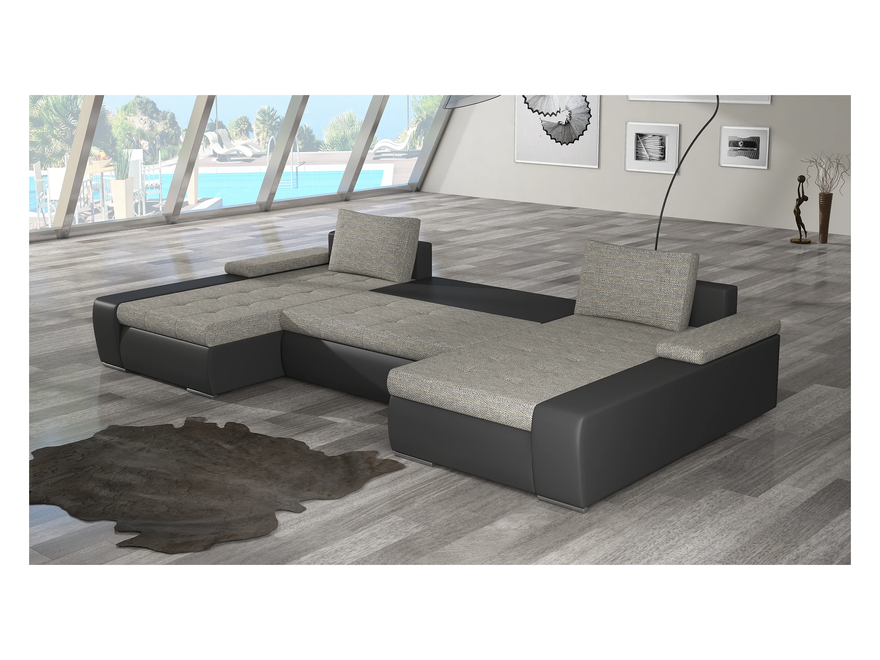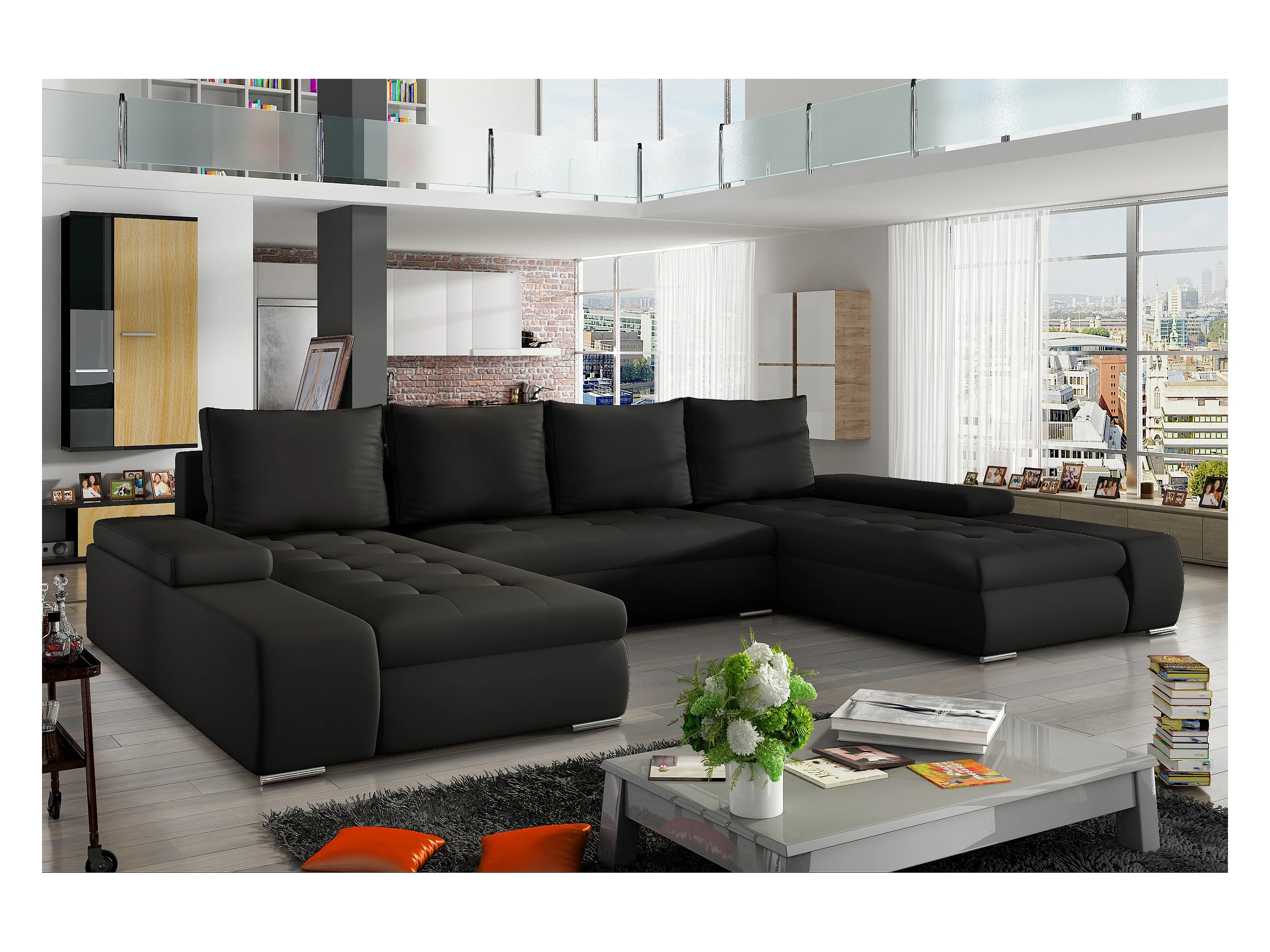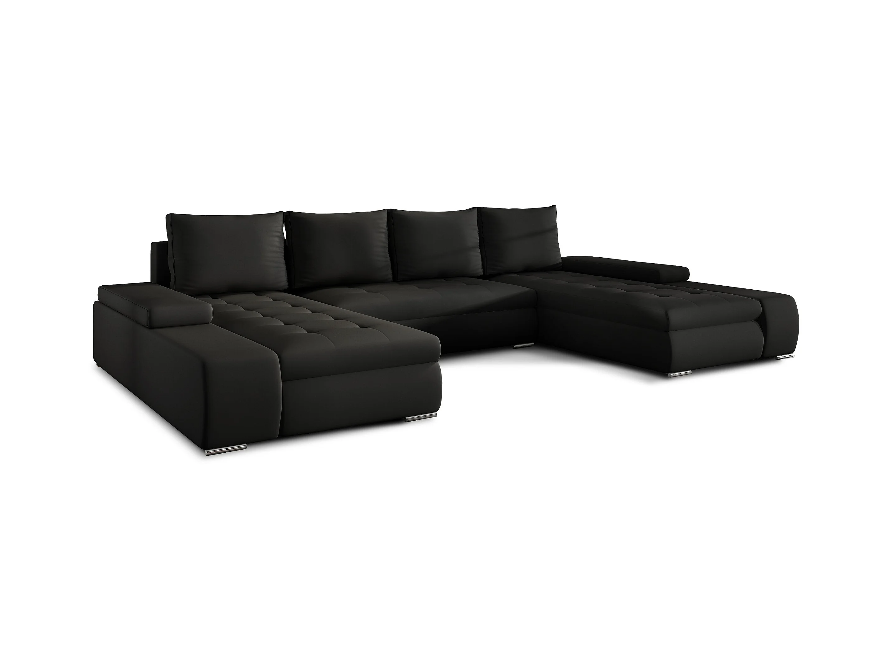 Grand canapé convertible panoramique design simili cuir noir avec coffre de rangement Tino 363cm