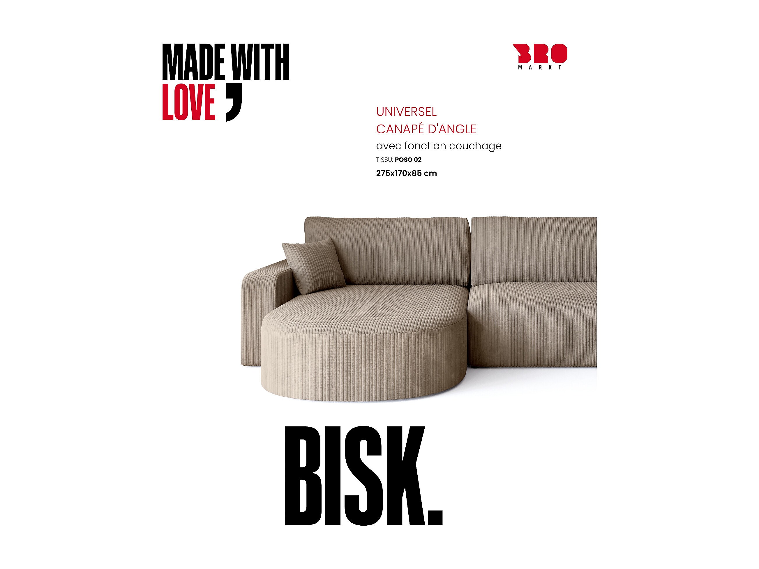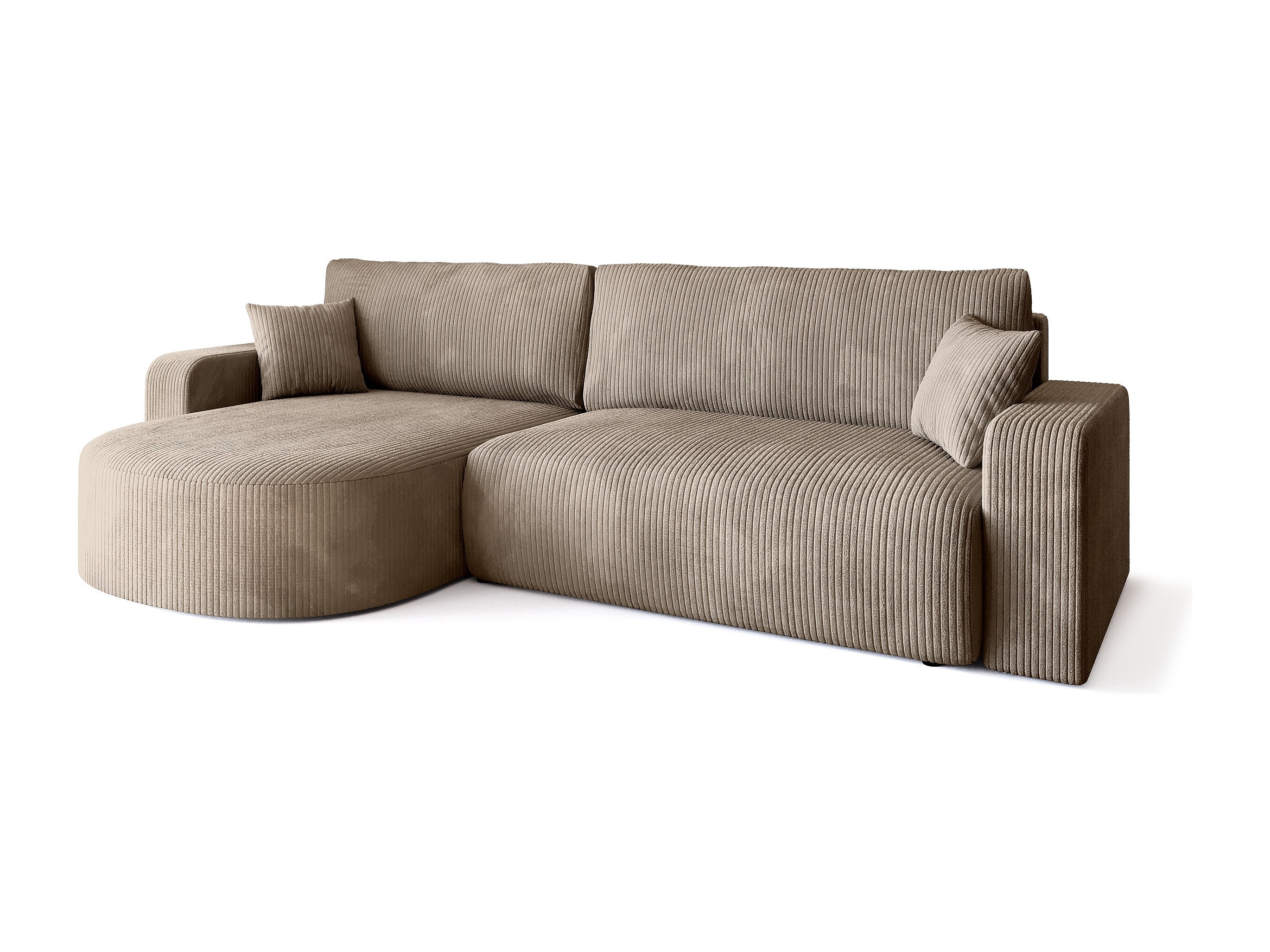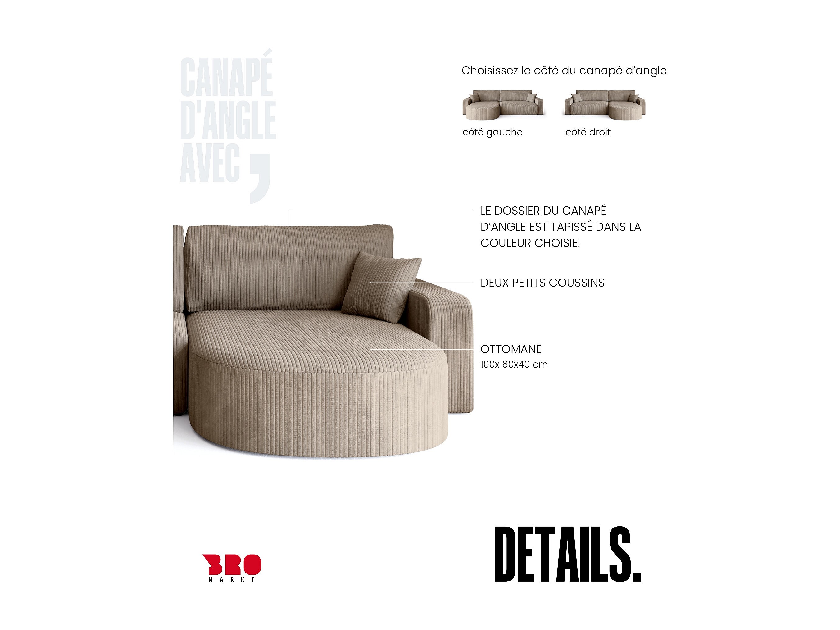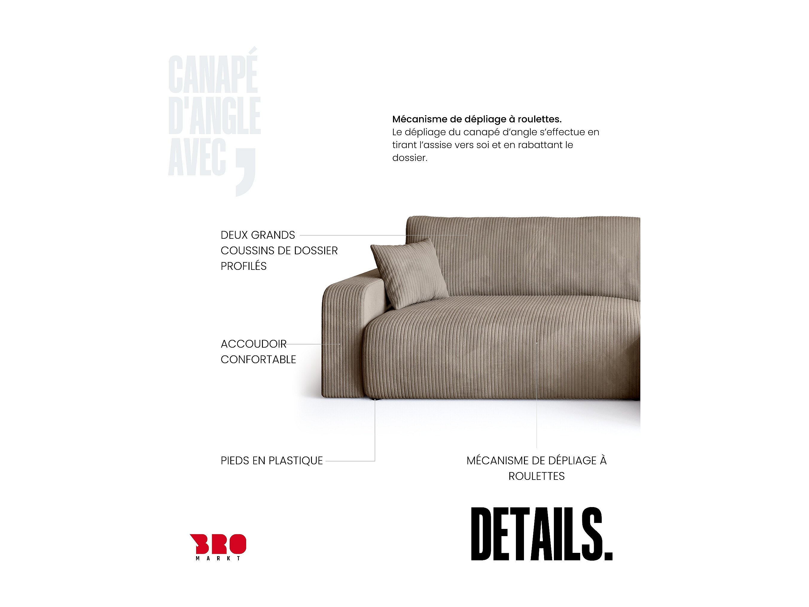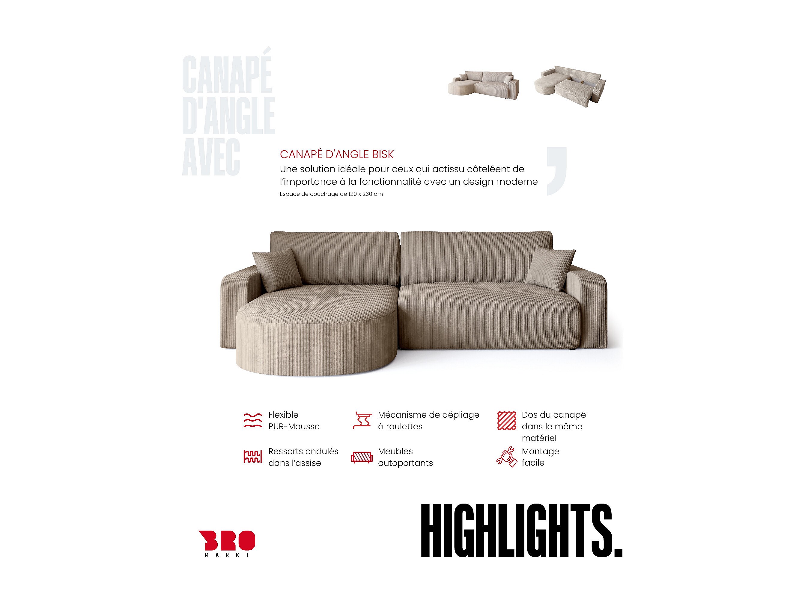 Grand canapé d'angle convertible, en velours côtelé beige BISK