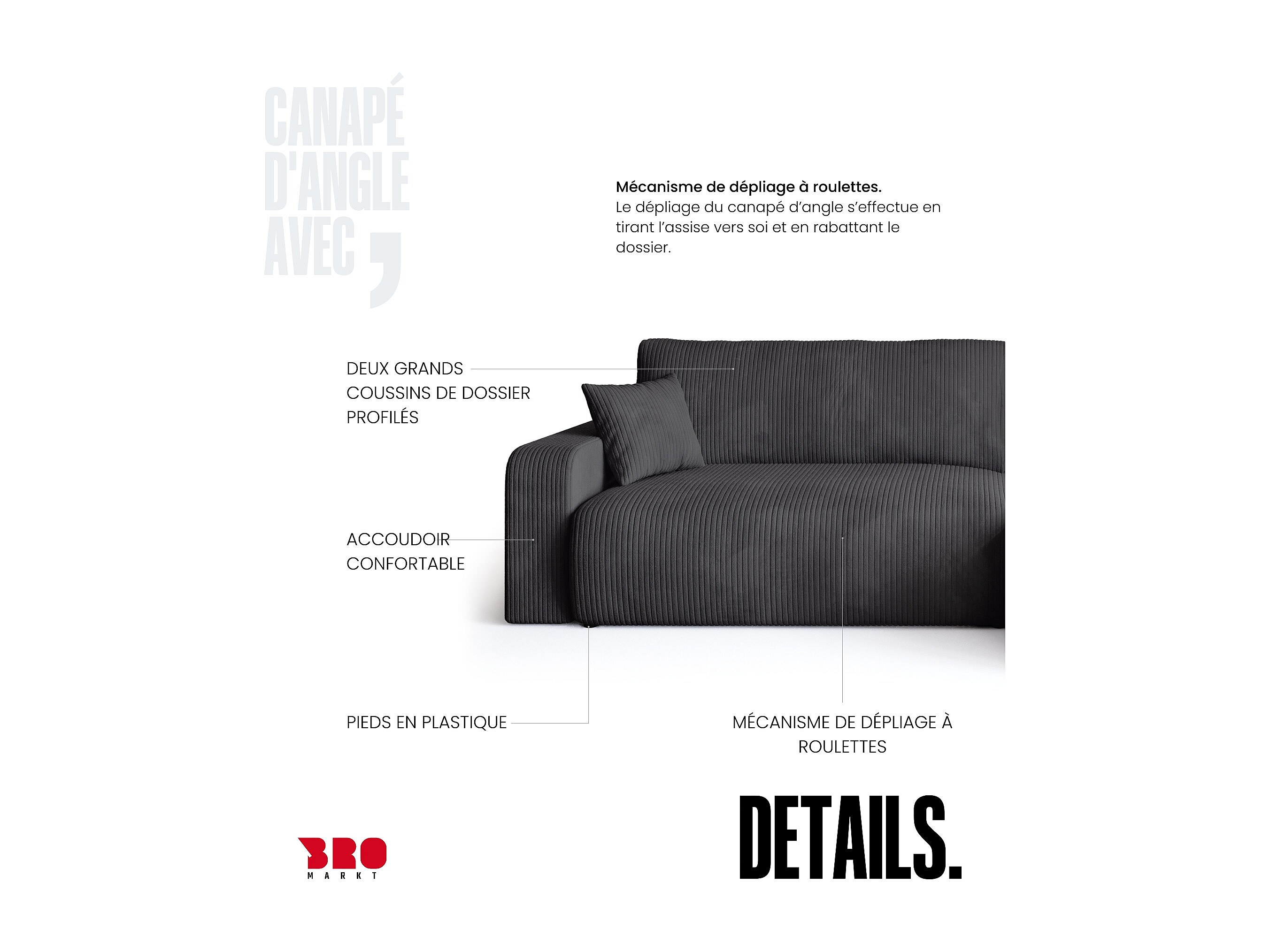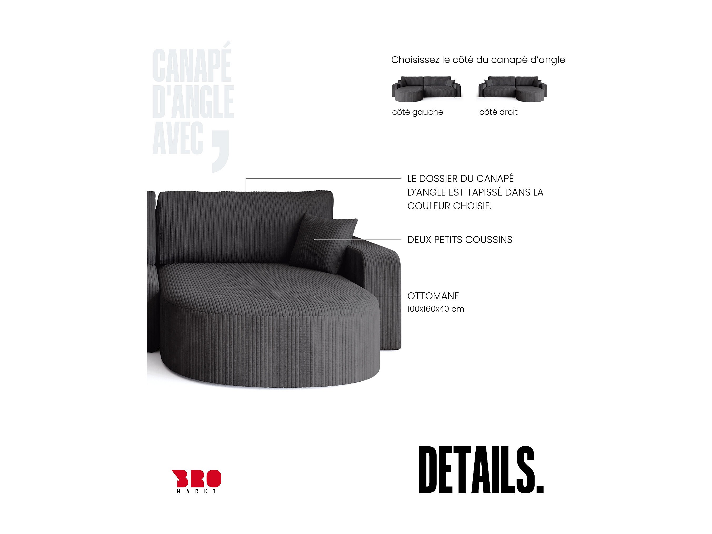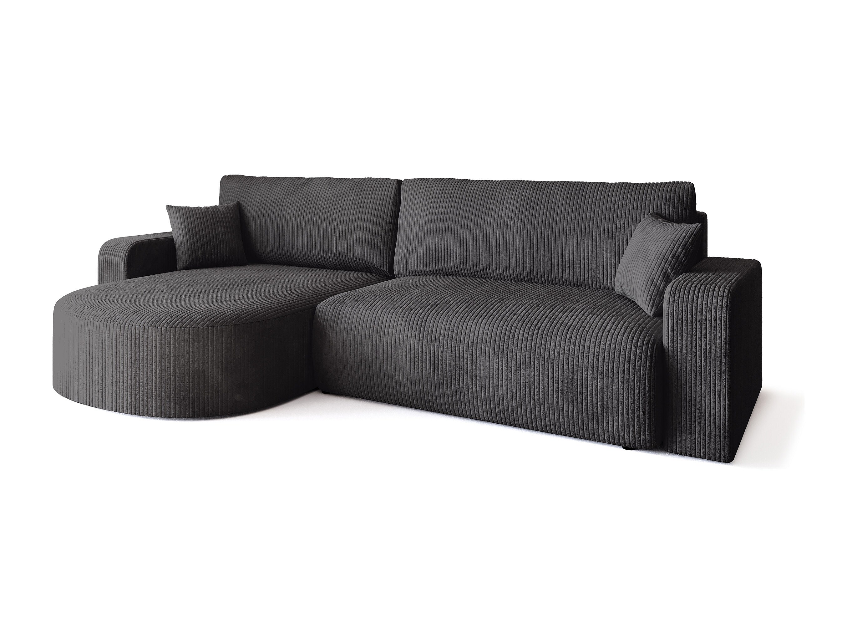 Grand canapé d'angle convertible, en velours côtelé gris BISK