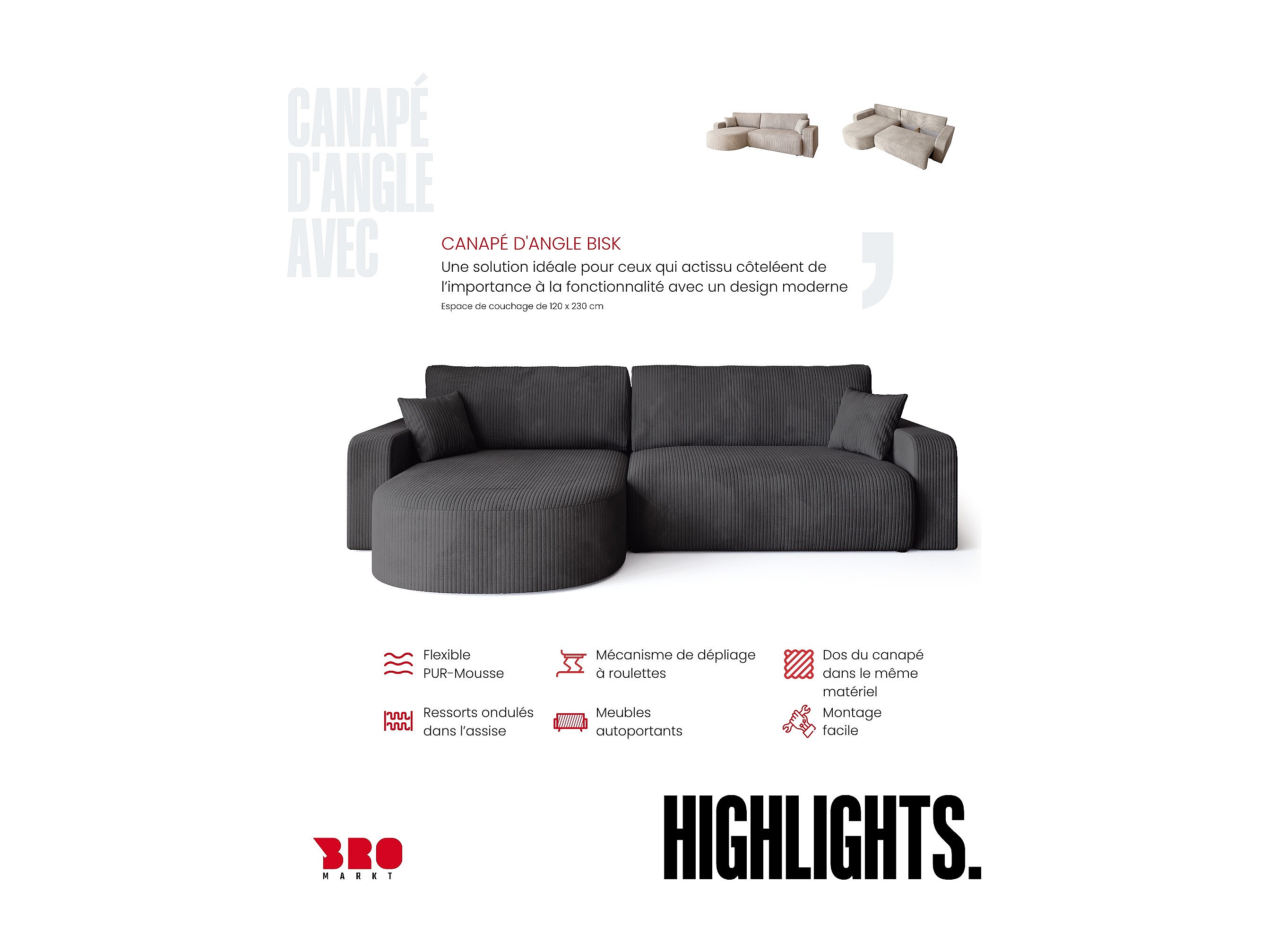 • Fonction de couchage 120×230 cm – transformez votre canapé en lit confortable pour deux personnes en quelques secondes