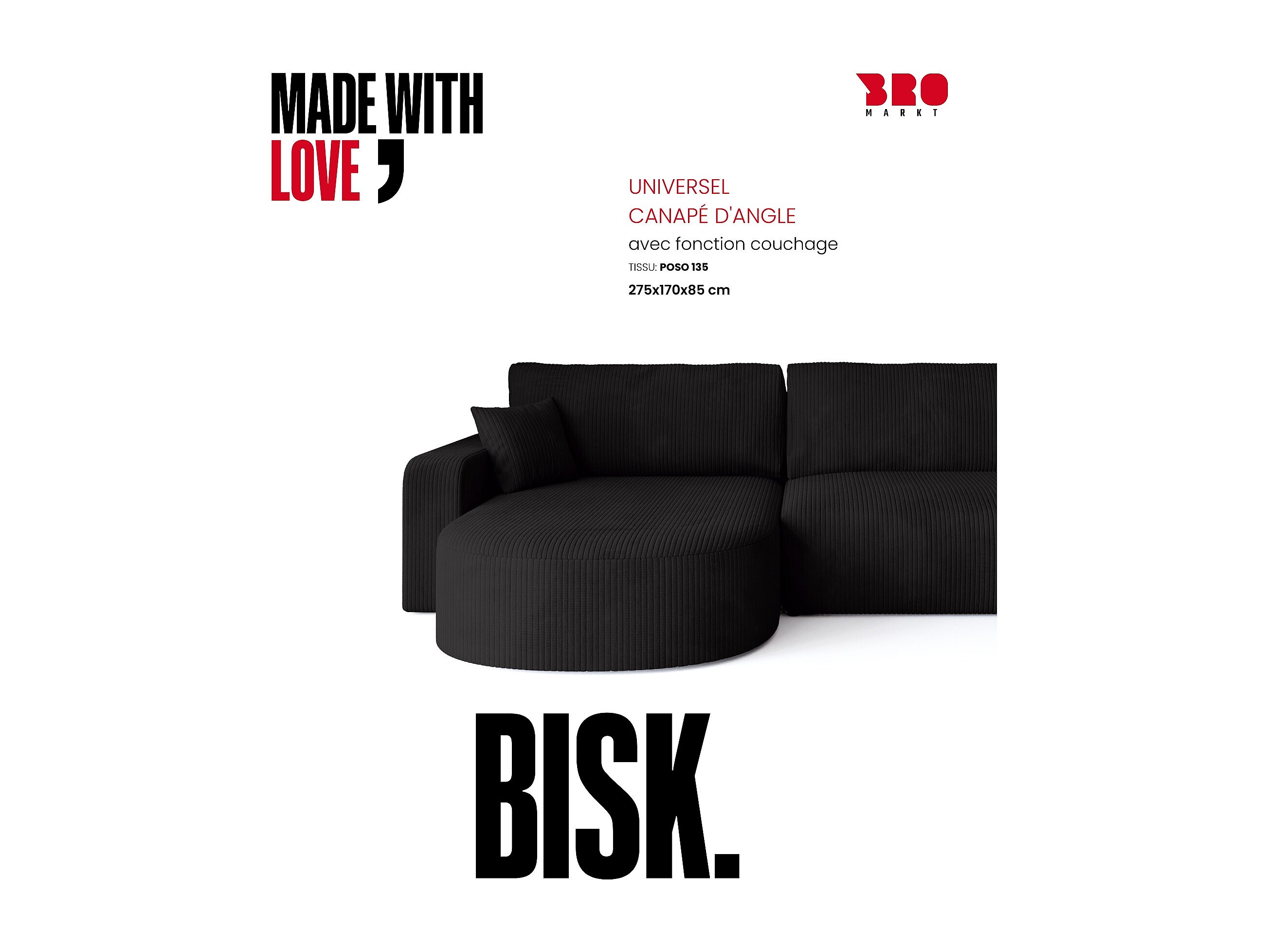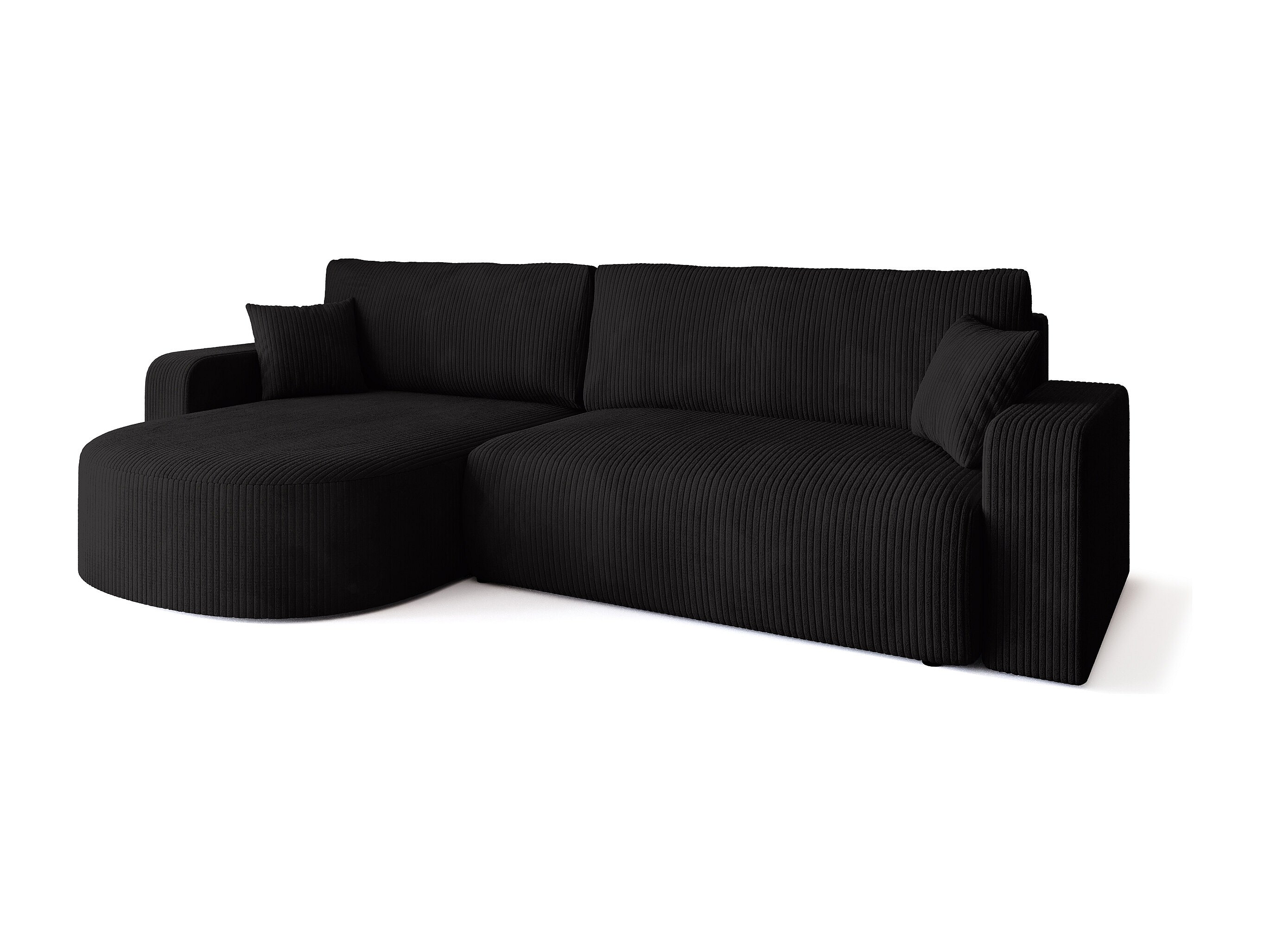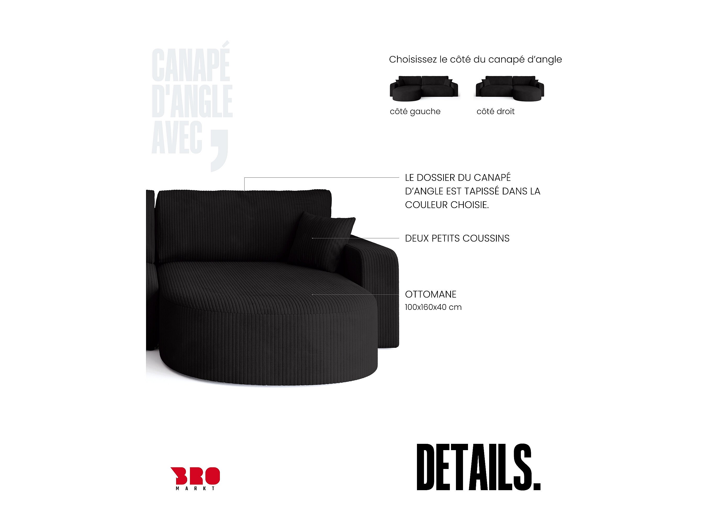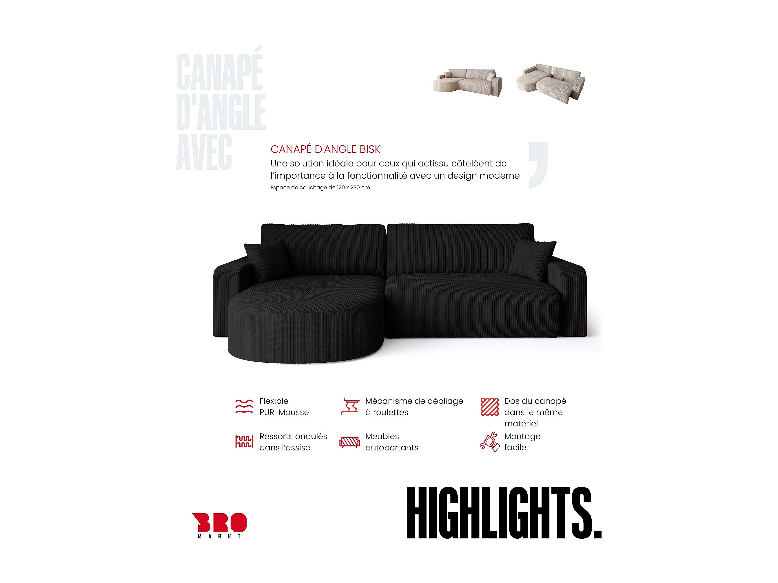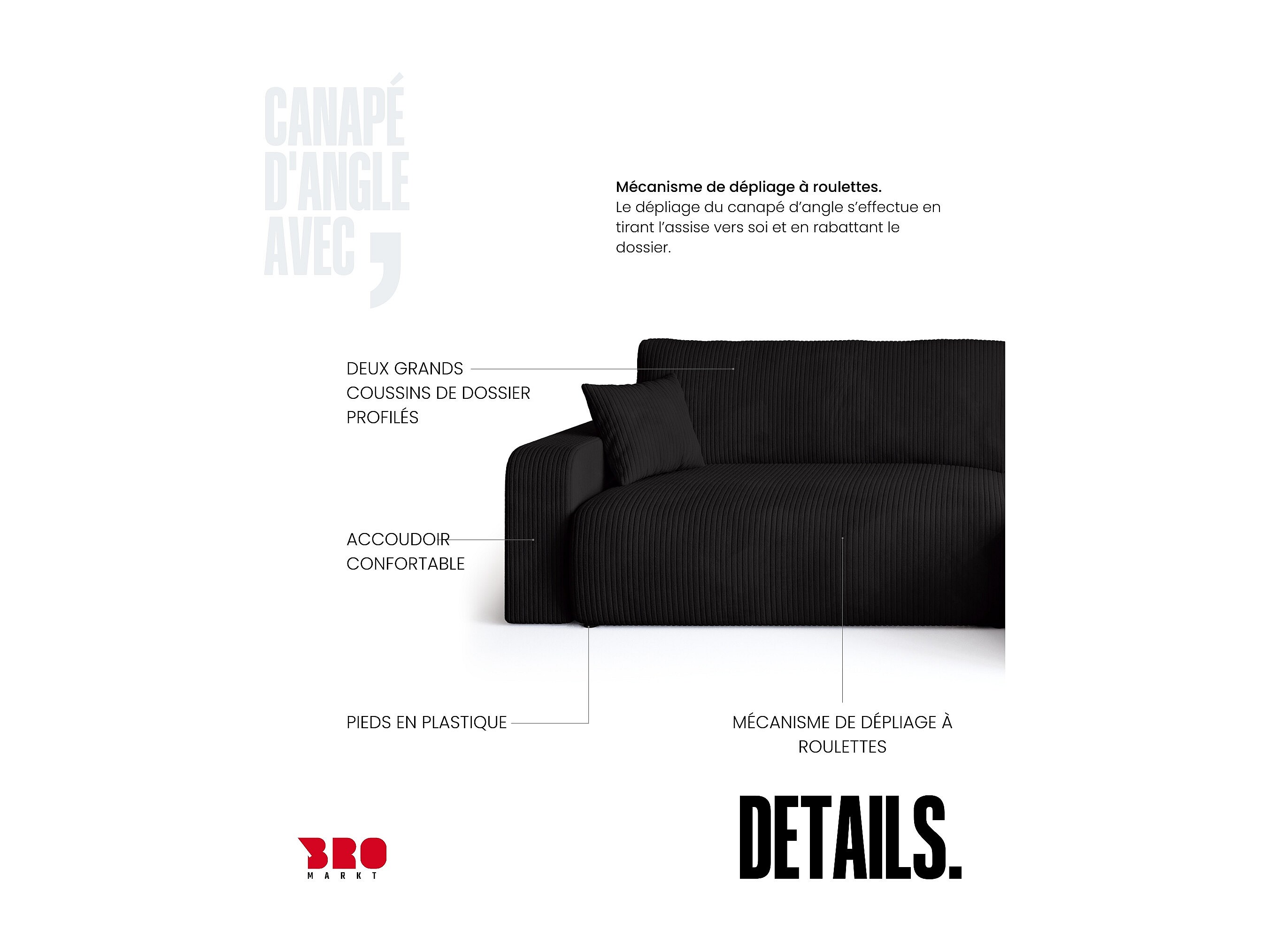 Grand canapé d'angle convertible, en velours côtelé noir BISK