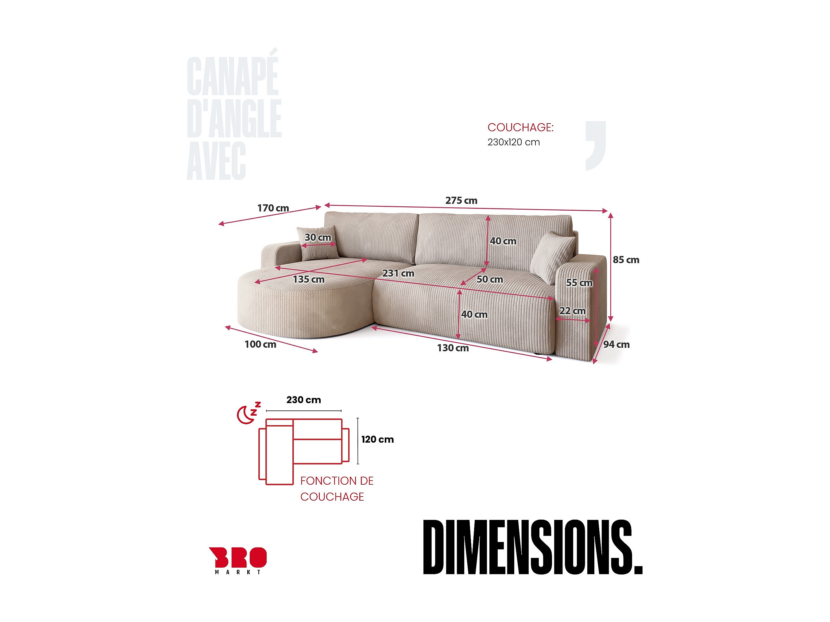 Ce canapé d’angle a été conçu pour allier le confort au quotidien et un design contemporain. Grâce à ses dossiers moelleux, sa grande surface de couchage et son revêtement en velours côtelé agréable au toucher, il devient en un instant le cœur de votre salon. La fonction de couchage et le coffre intégré en font un choix idéal pour celles et ceux qui recherchent fonctionnalité, élégance et convivialité.