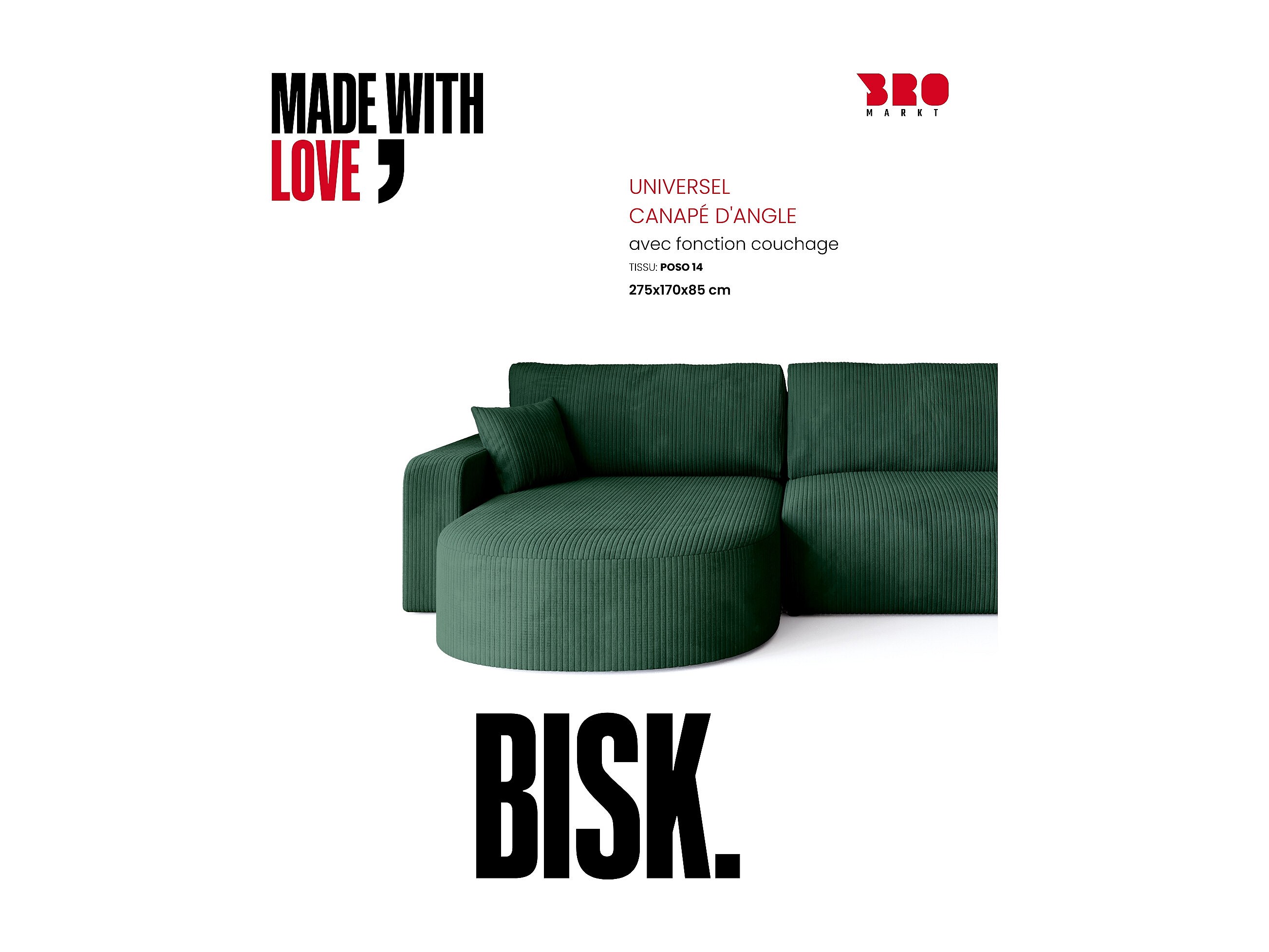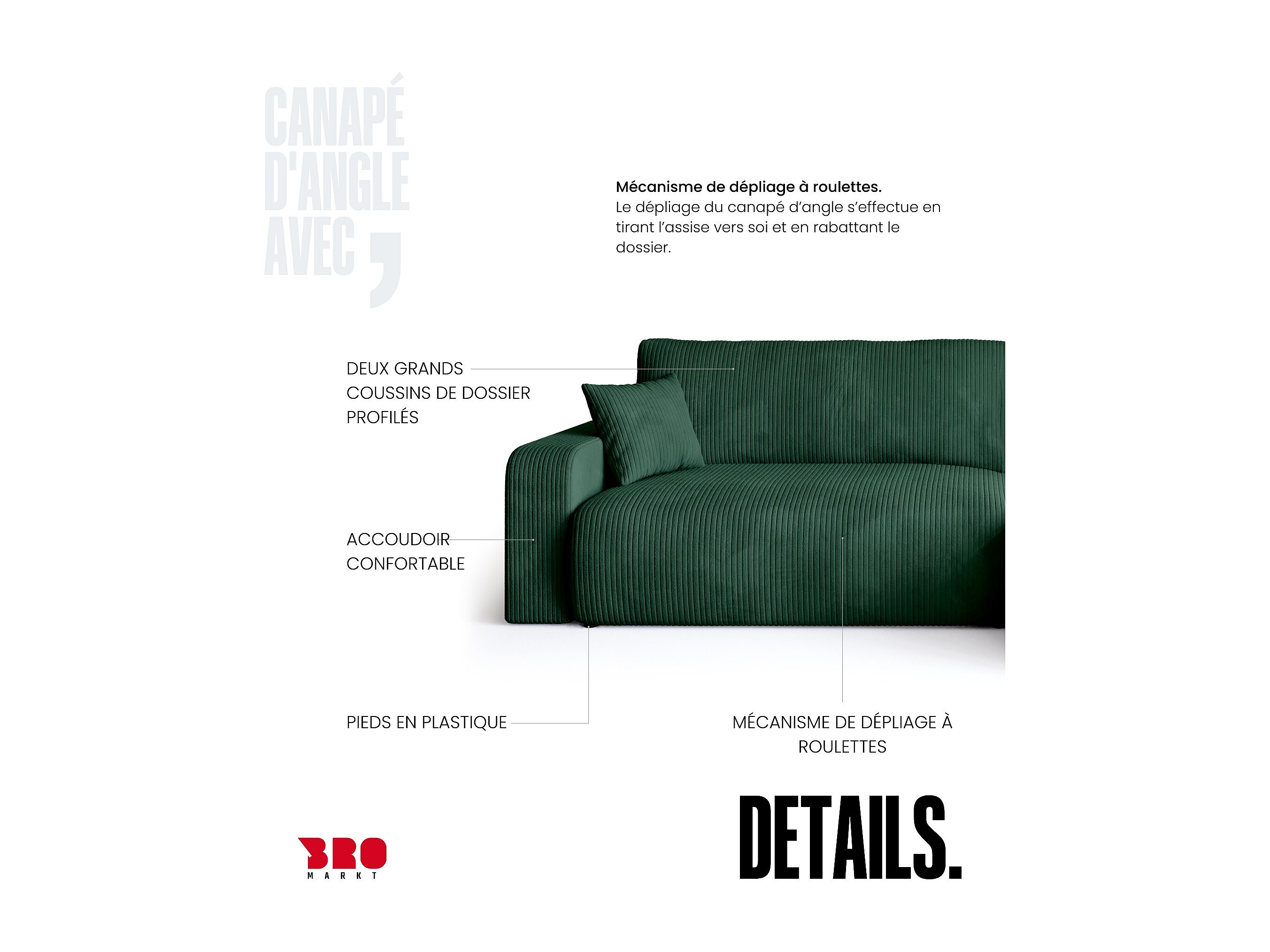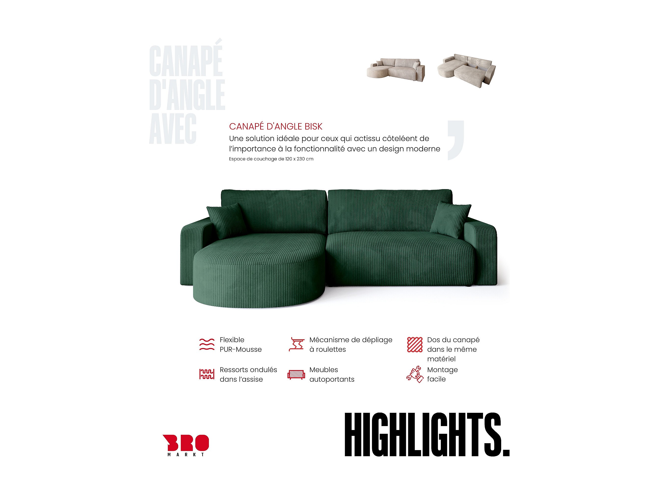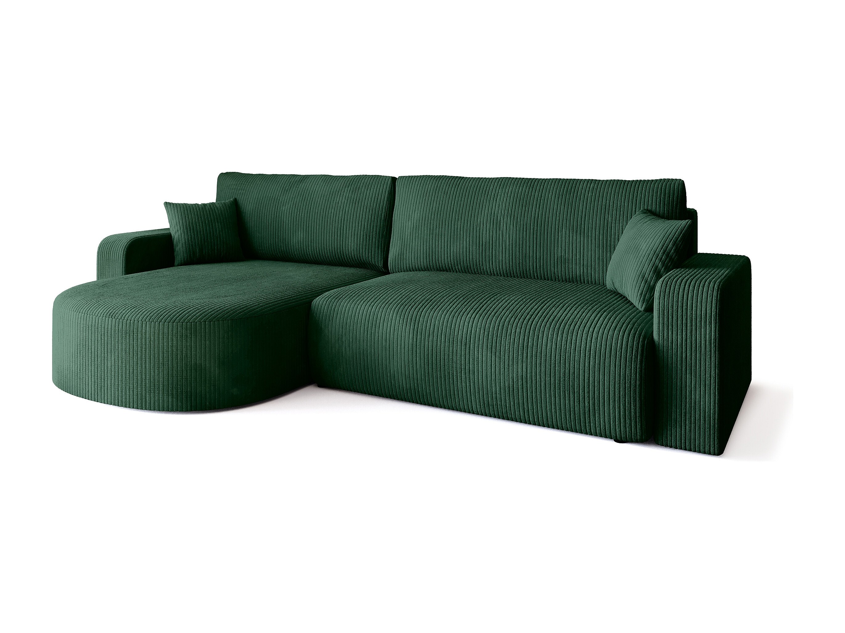 Grand canapé d'angle convertible, en velours côtelé vert BISK