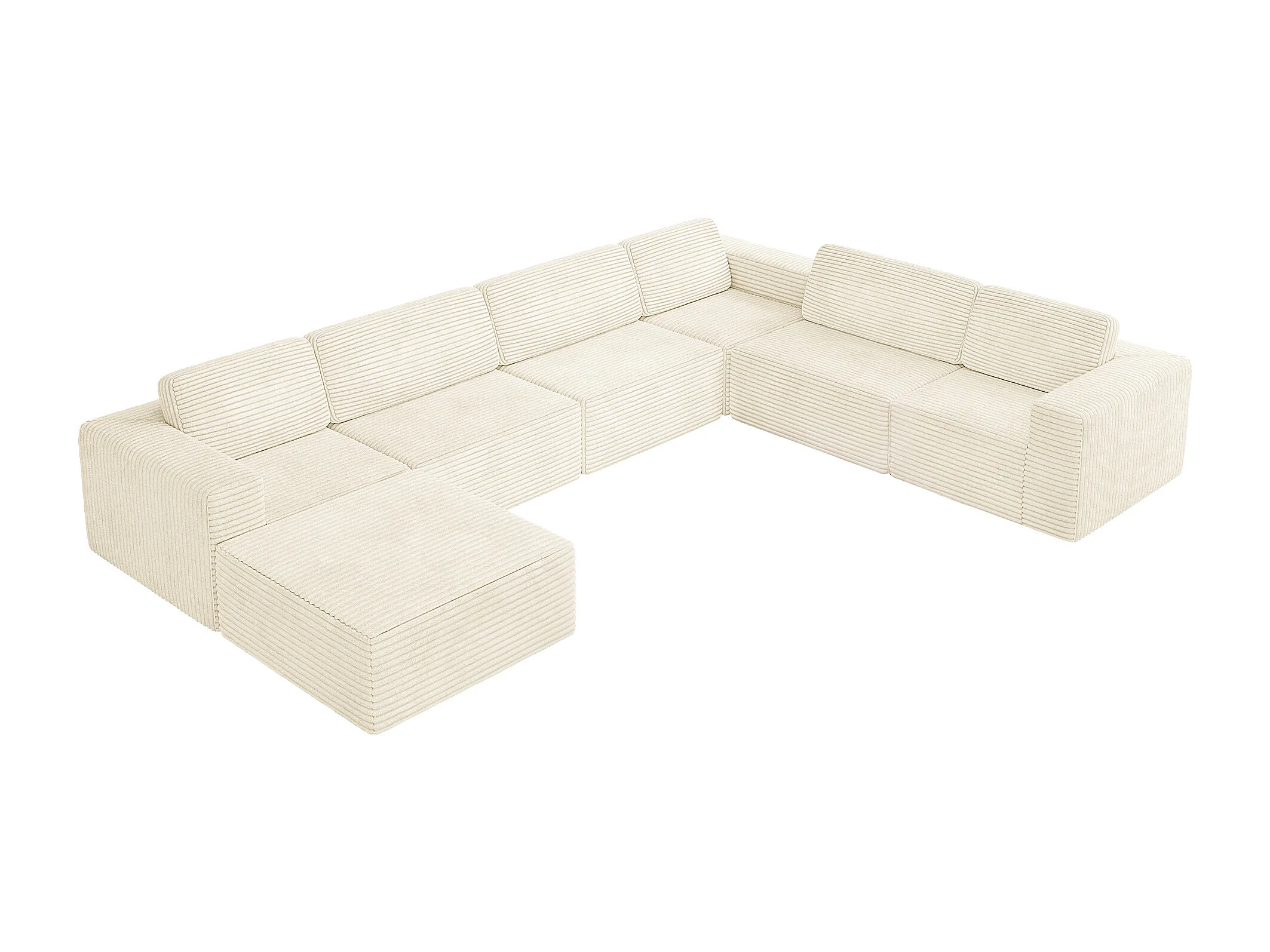 Grand canapé d'angle droit modulable panoramique en Velours Côtelé, avec pouf, 404x303x82cm, Beige