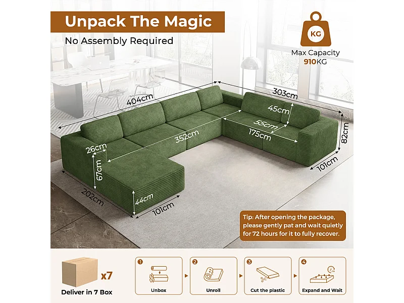 Grand canapé d'angle droit modulable panoramique en Velours Côtelé, avec pouf, 404x303x82cm, Vert