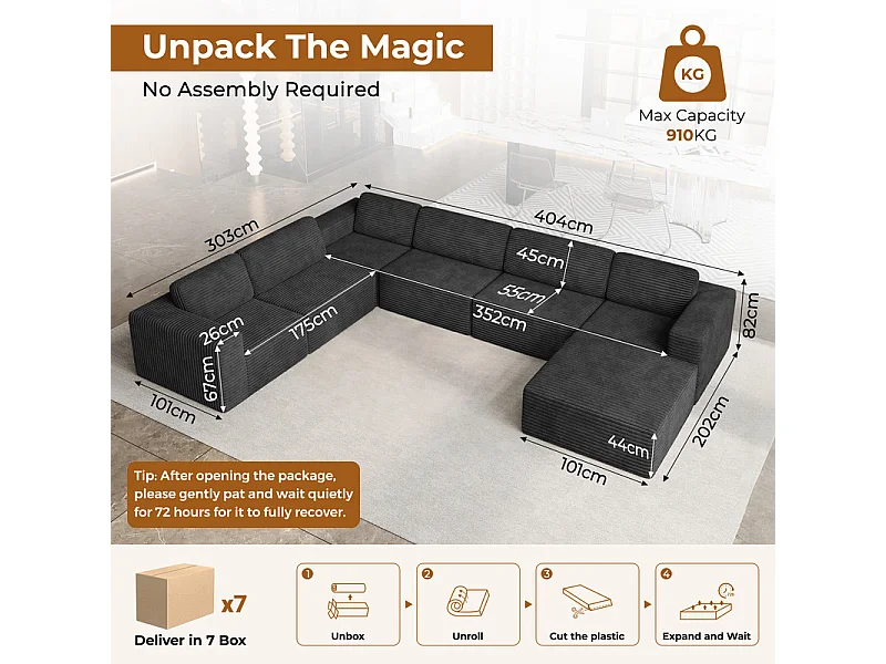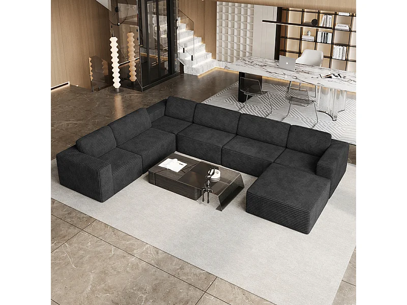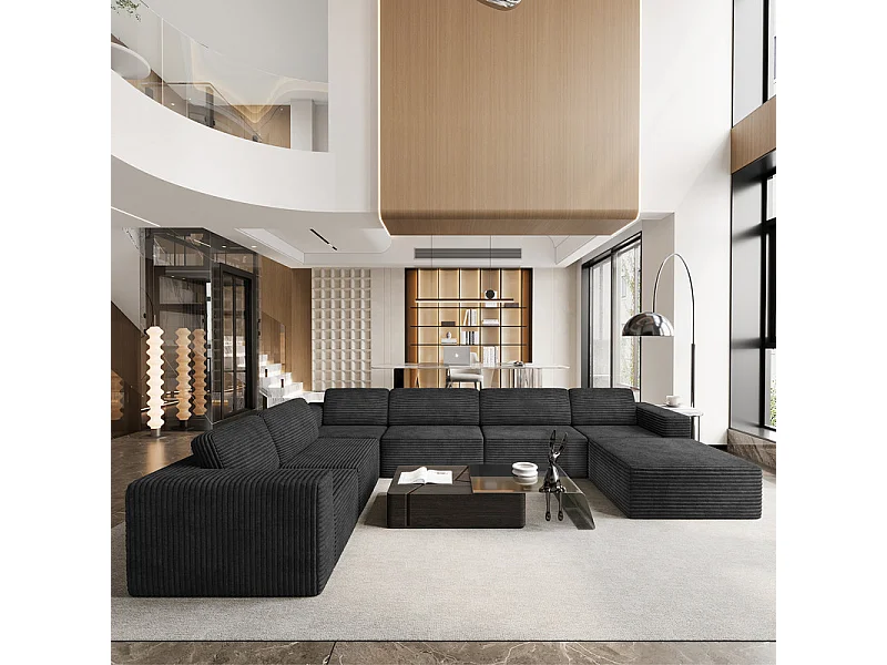 Grand canapé d'angle gauche modulable panoramique en Velours Côtelé, avec pouf, 404x303x82cm, Noir
