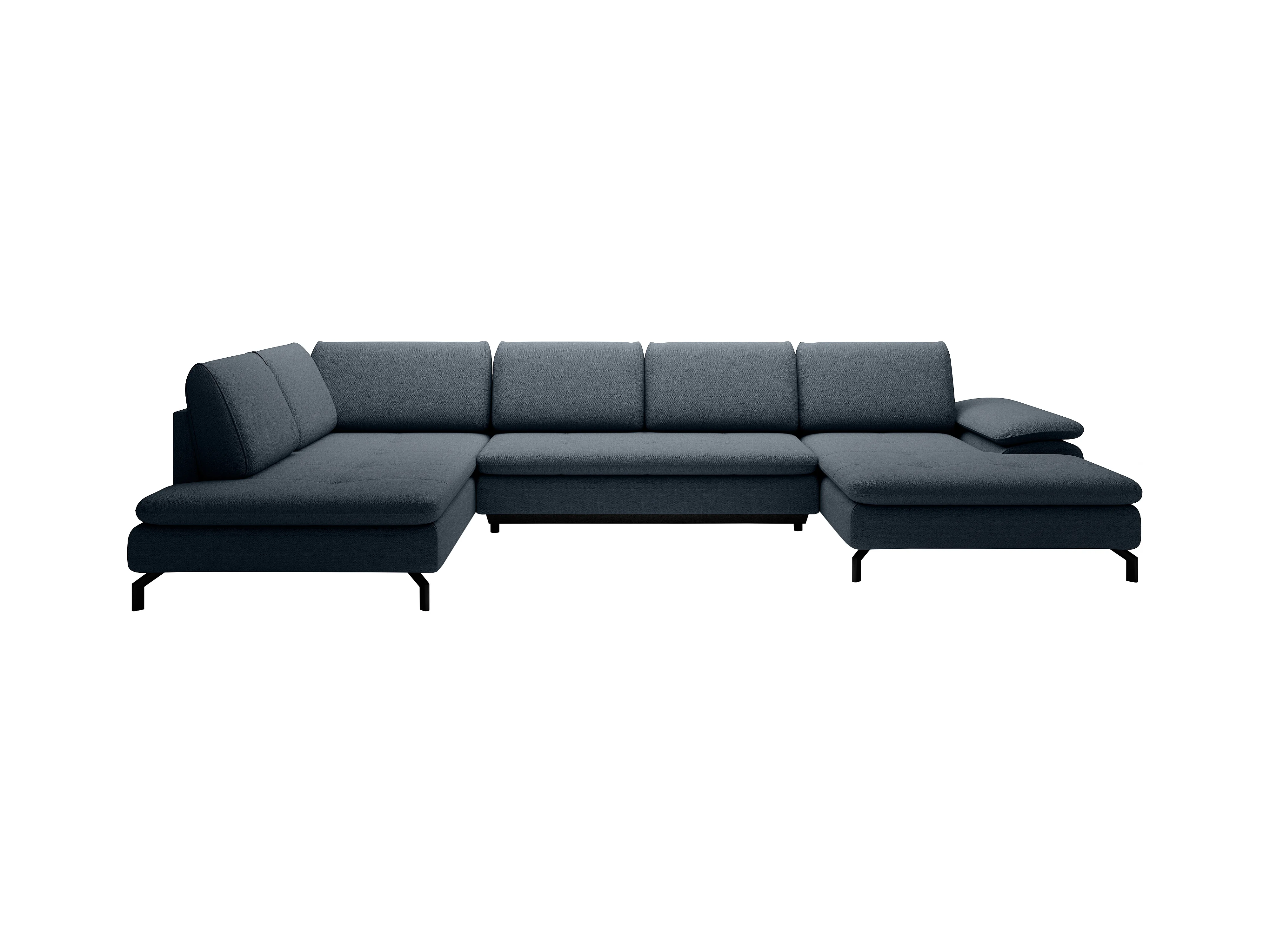 Grand canapé d'angle gauche panoramique convertible en tissu texturé bleu ARCHIBALD