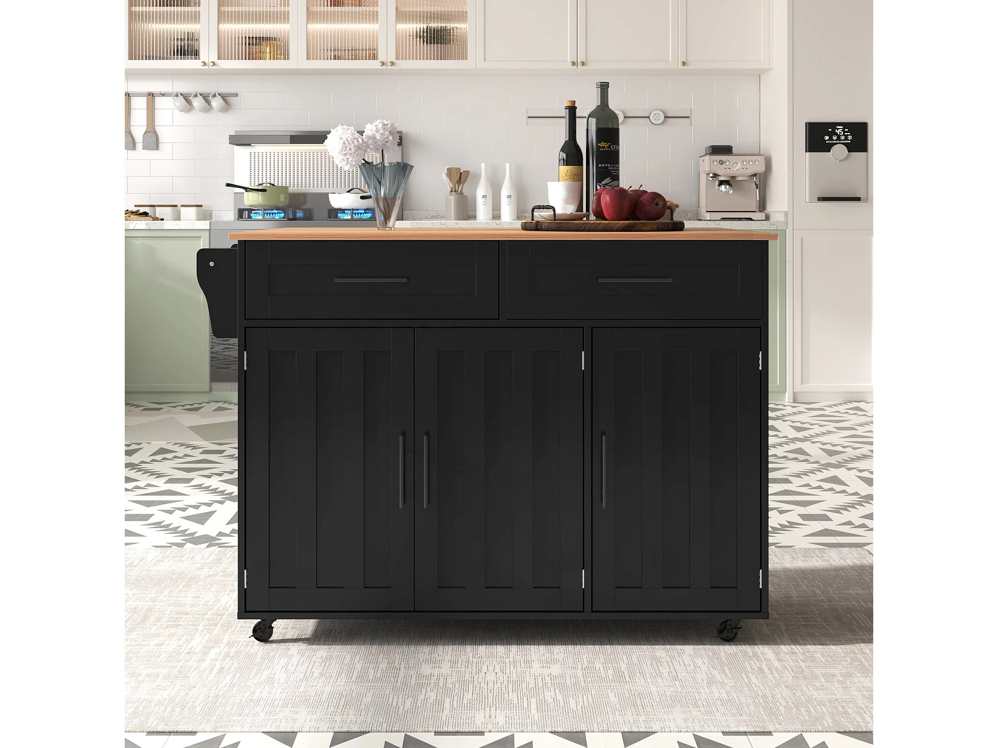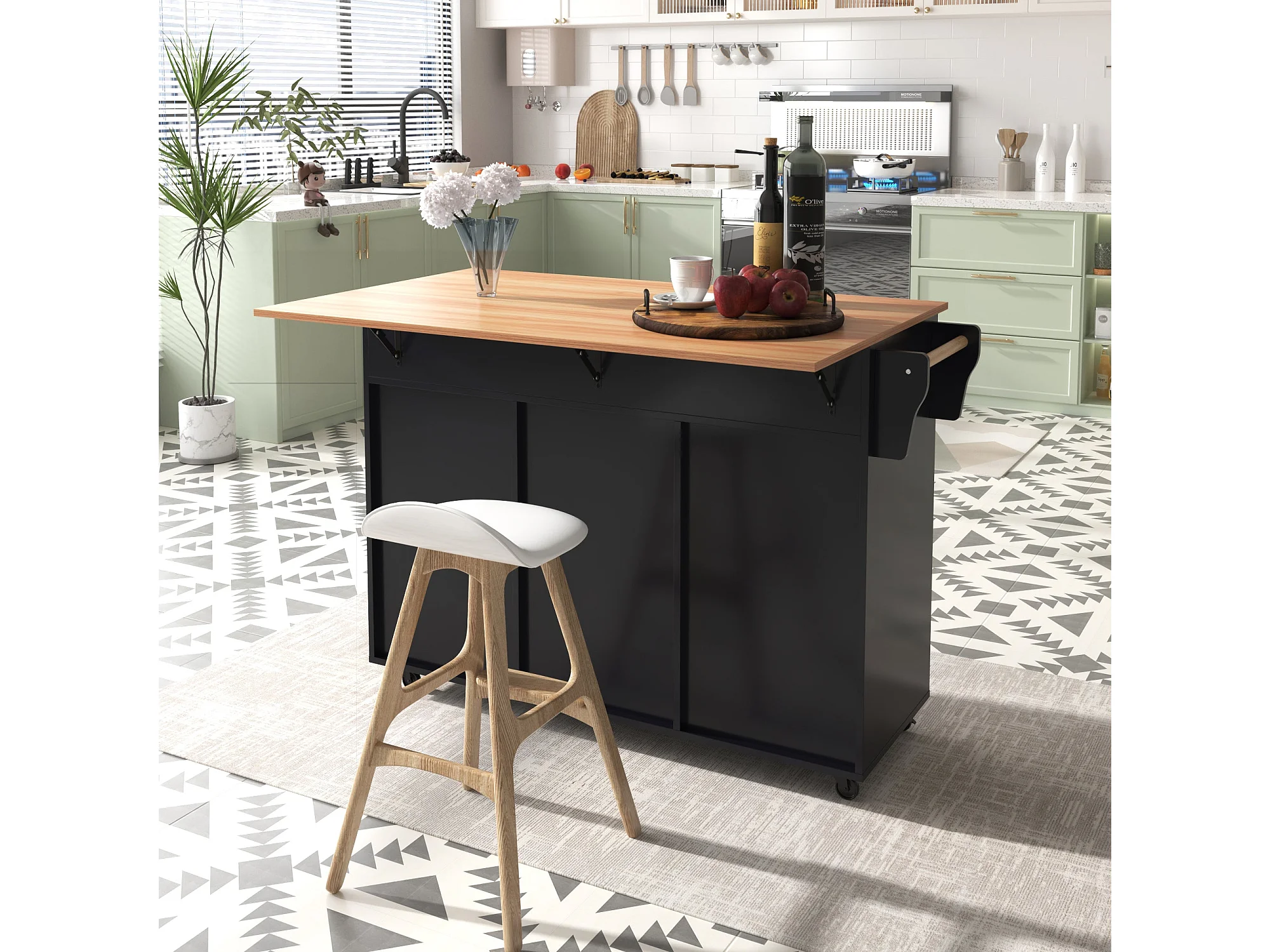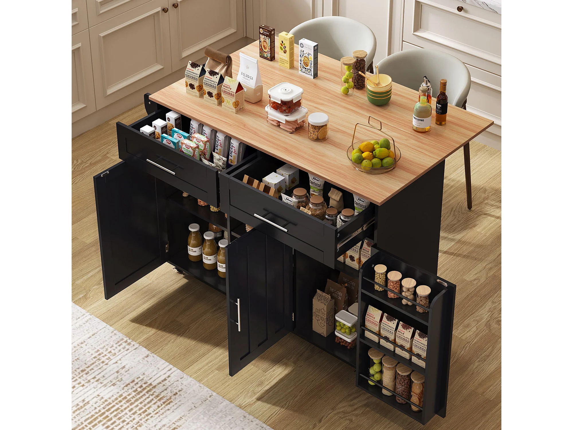 Grand chariot de salle à manger noir 129 x 46(71) x 91,5 cm, buffet, plan de travail en bois massif, plateau rabattable, roulettes / pieds en bois massif