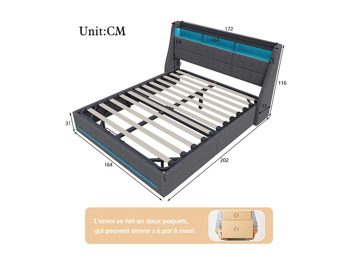 Grand Lit 160x200 avec Rangement Hydraulique, LED RGB et Ports USB - Tête de Lit Gris en Tissu, Design Moderne