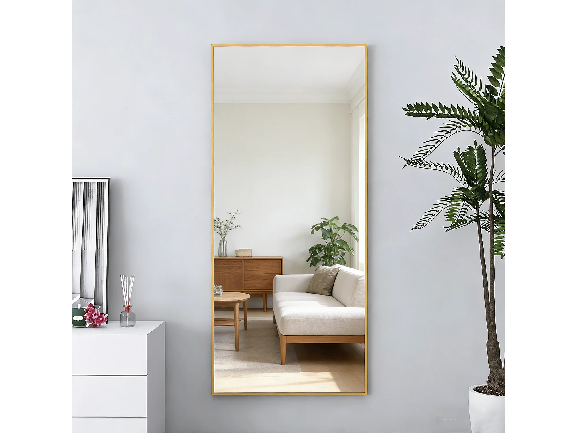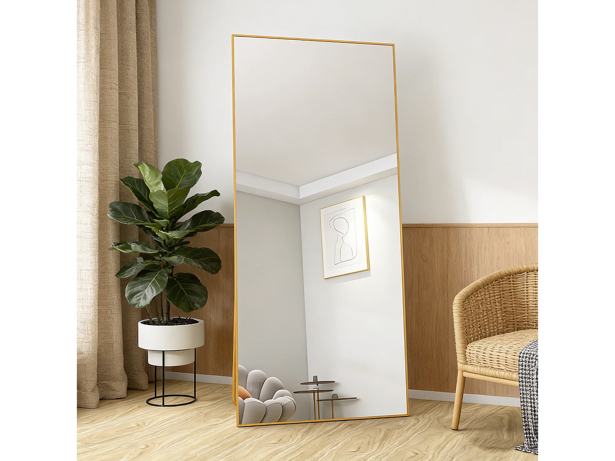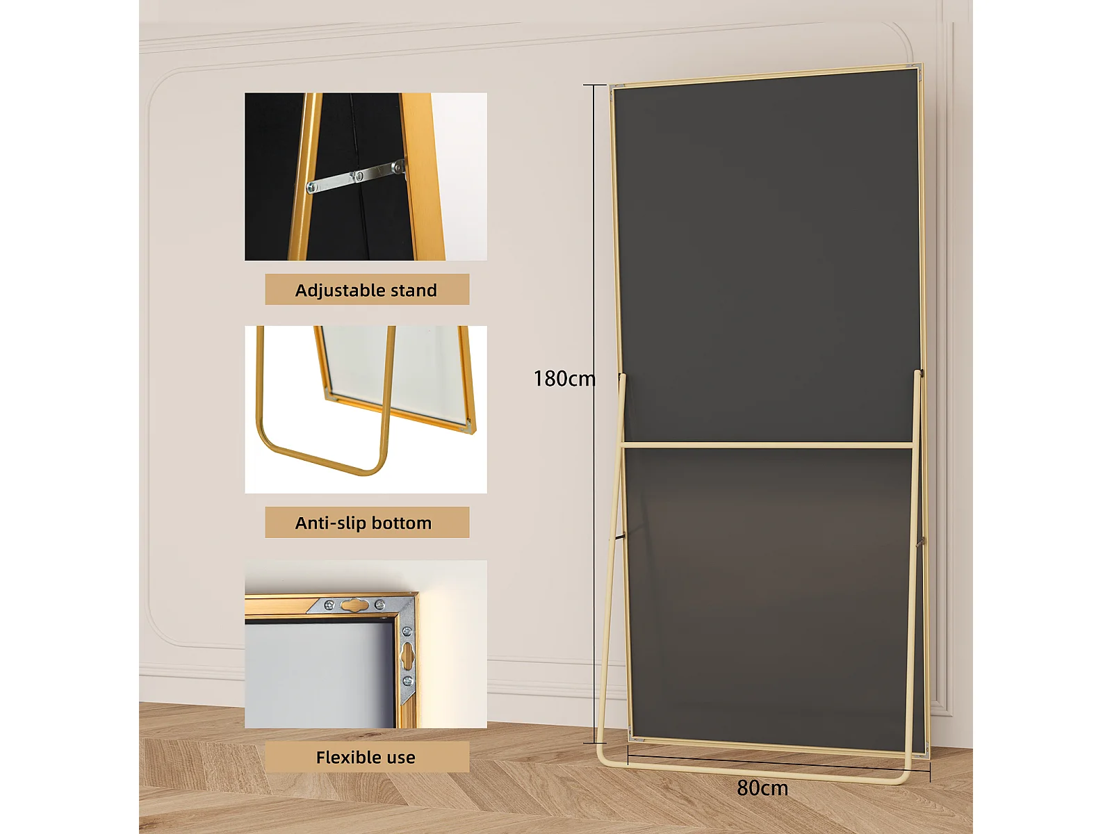 Grand miroir sur pied et mural, rectangulaire plein corps en verre trempé, Miroir Plein Corps Polyvalent pour salon et à la chambre, 80Lx180H cm, doré