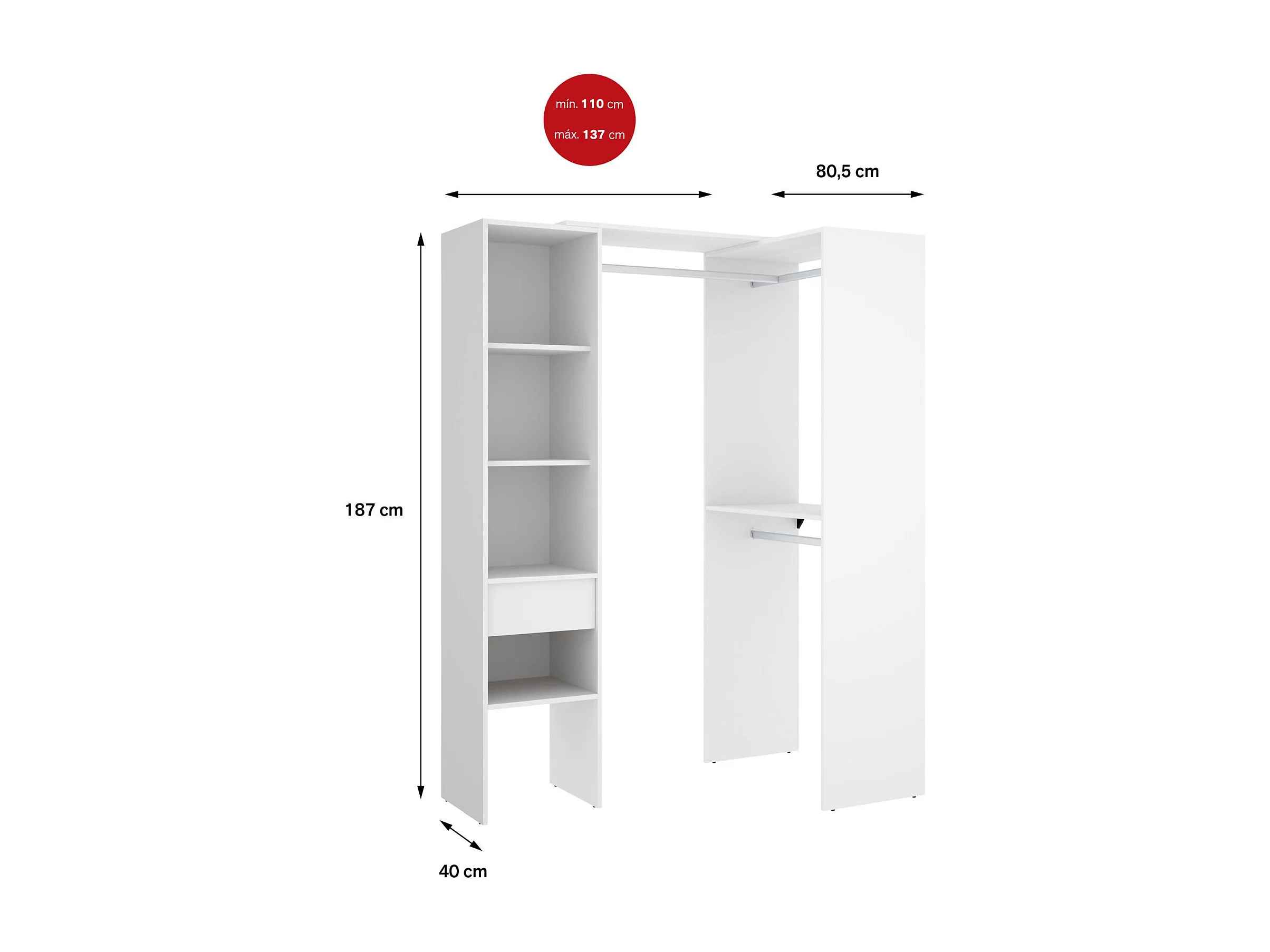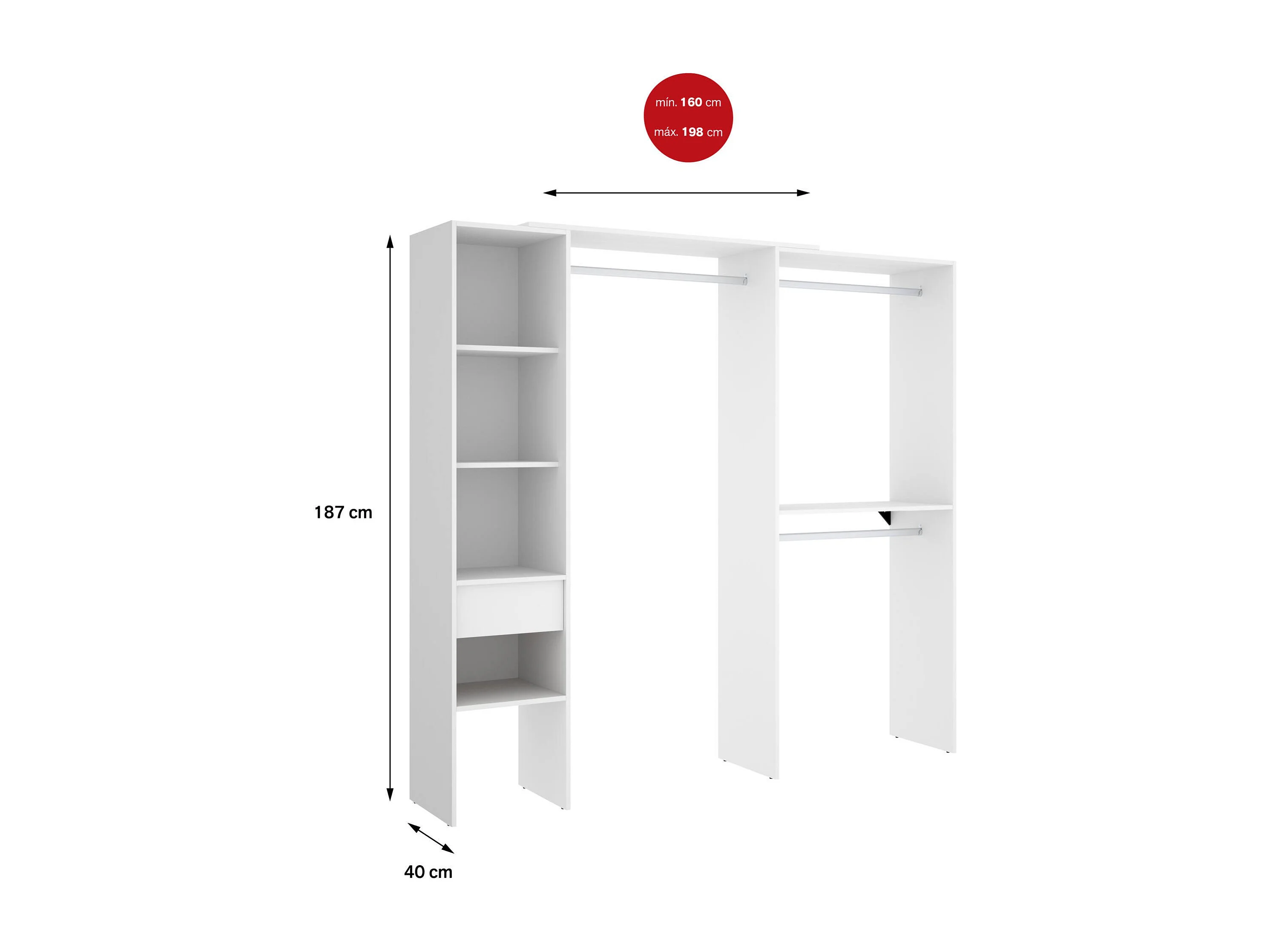 Grande Garde-robe Dburn, Meubles de chambre, Penderie de plain-pied, Placard à vêtements, 98x42 h187 cm, Blanc