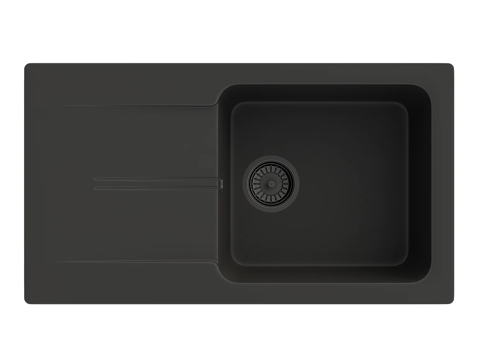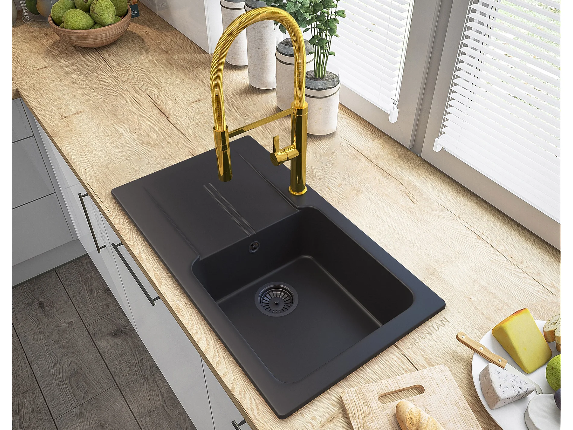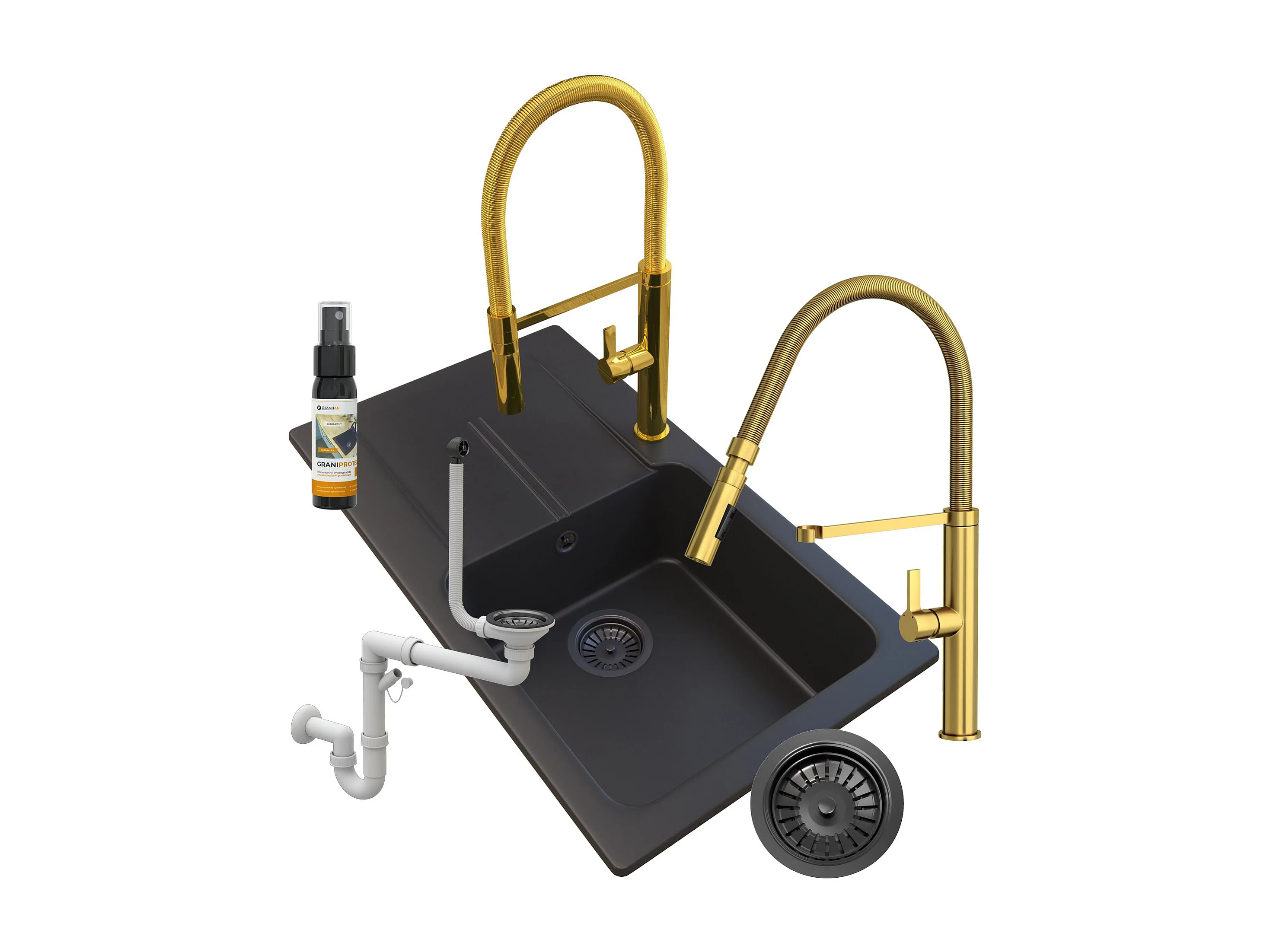 GRANIT NOIR ÉVIER TASOS + ROBINETTERIE OR + SIPHON