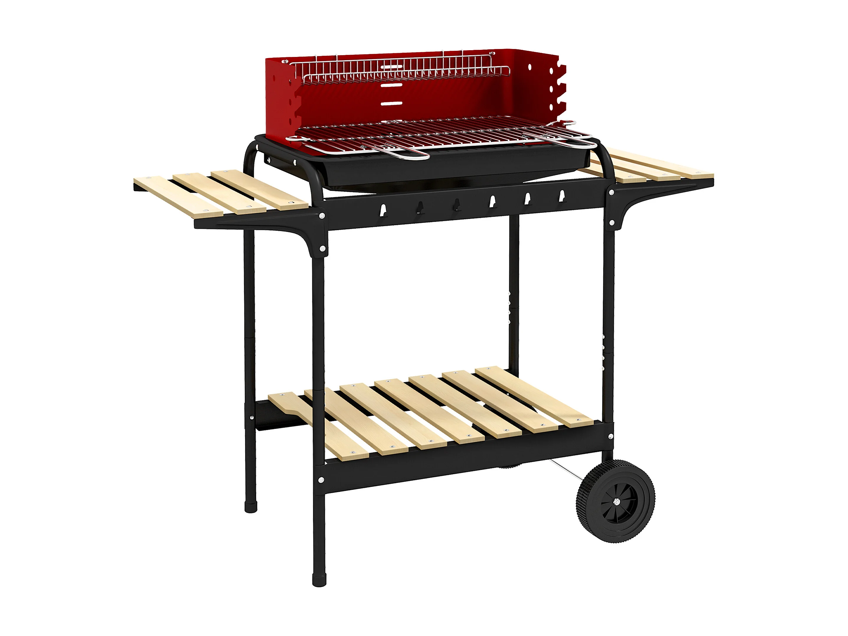 Grill BBQ en métal avec roues, grille réglable en hauteur, étagère en bois, chariot mobile pour barbecue, gris (103x47x95 cm)