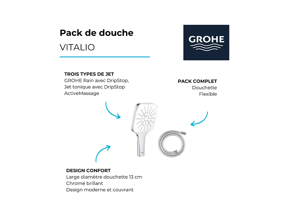 Pack Douchette GROHE Vitalio 3 jets Smartactive rectangulaire + Flexible 150 cm chromé