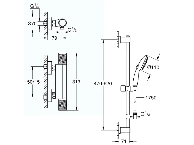 Mitigeur douche thermostatique mural Precision Feel + Ensemble de douche 2 jets avec barre Vitalio Start 100 GROHE Chrome