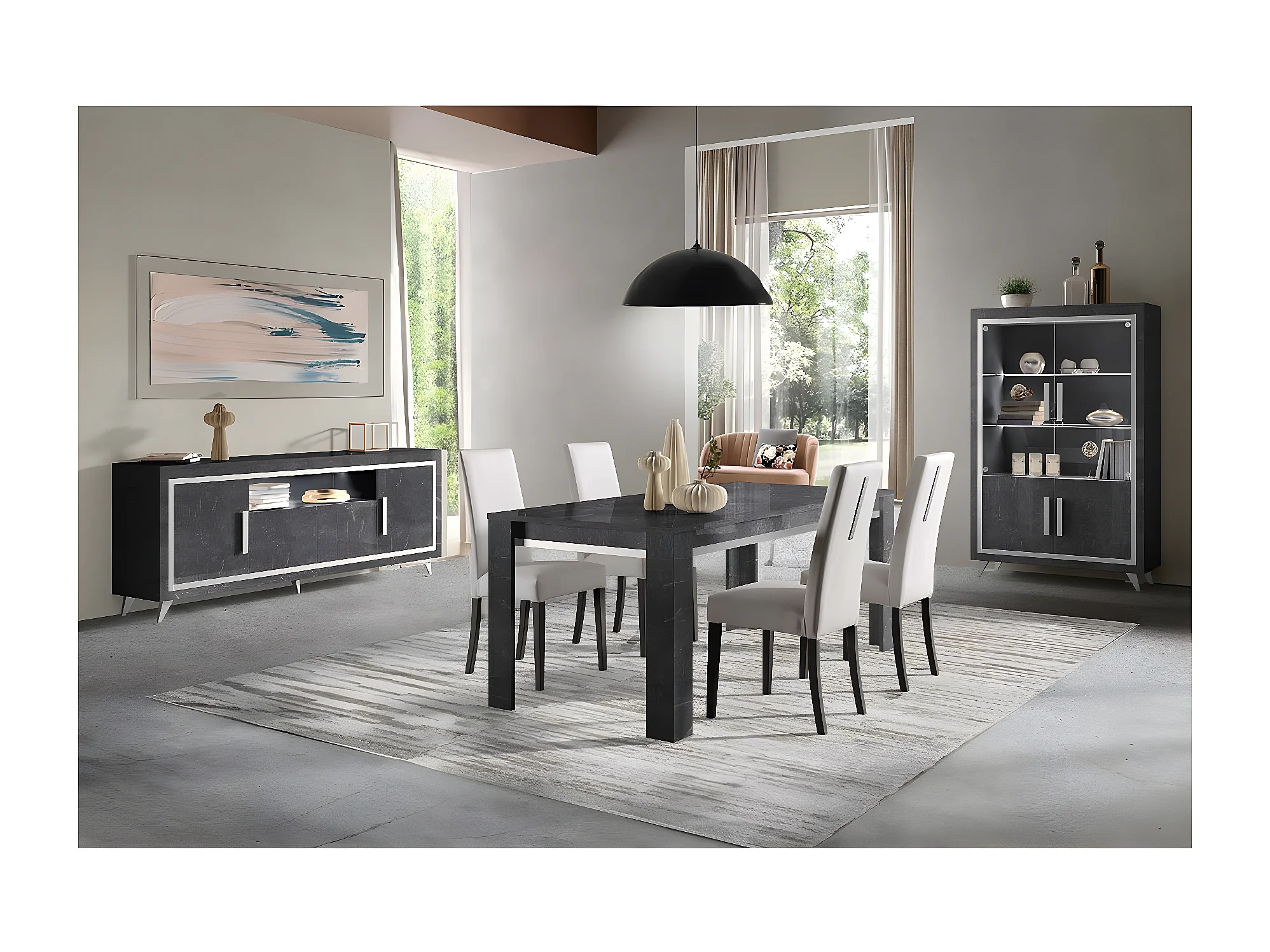 GUEDA - Buffet 4 Portes Effet Marbre Anthracite Finition Argent avec Leds