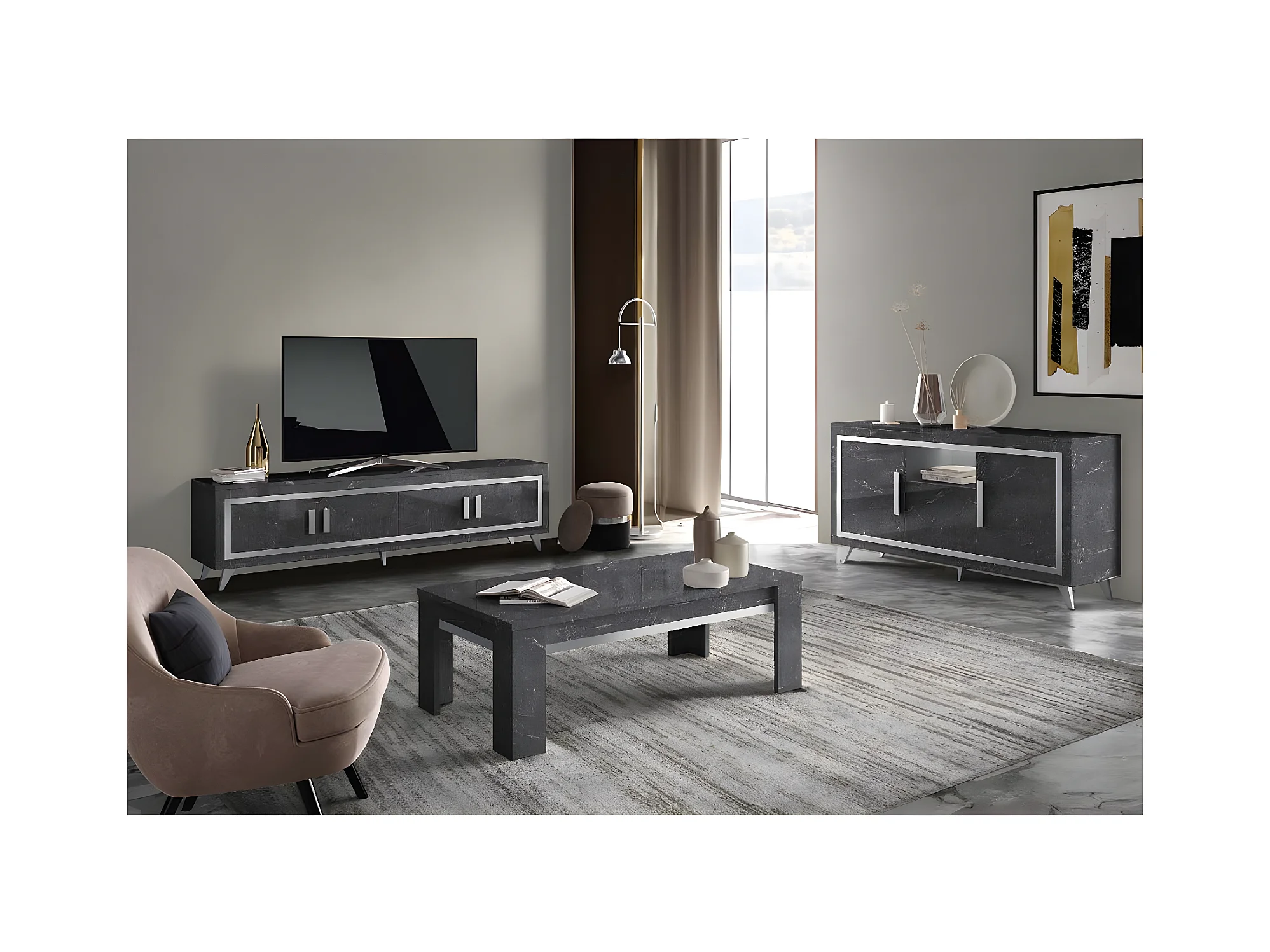 GUEDA - Table Basse Effet Marbre Anthracite Finition Argent