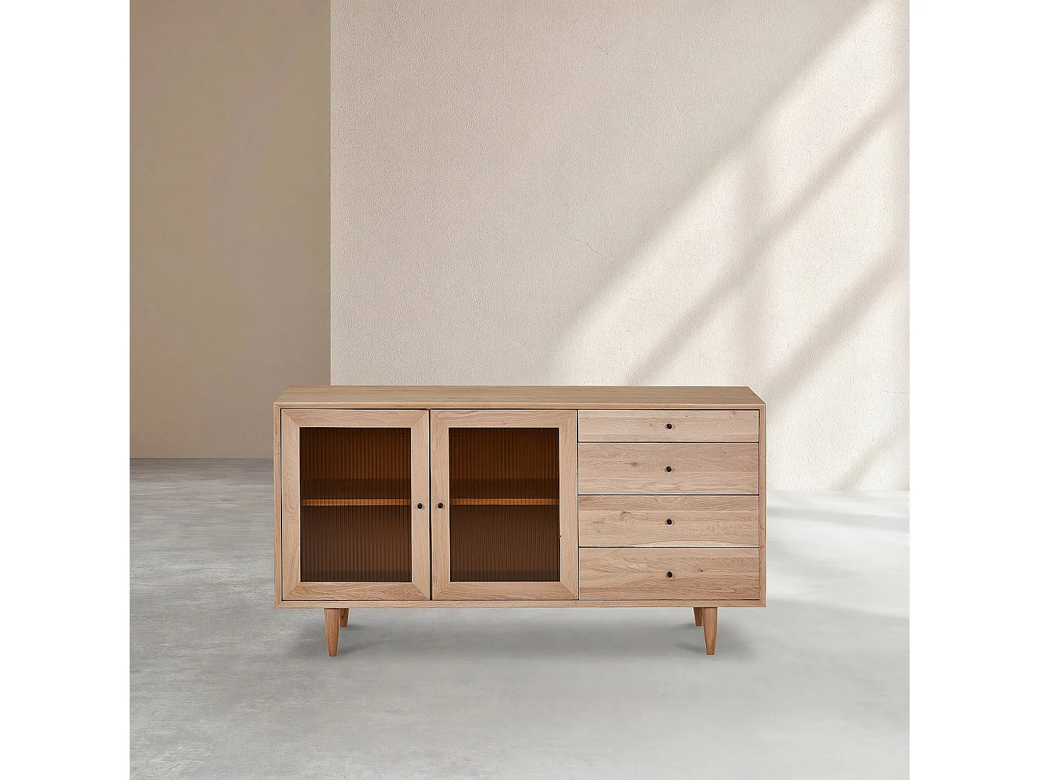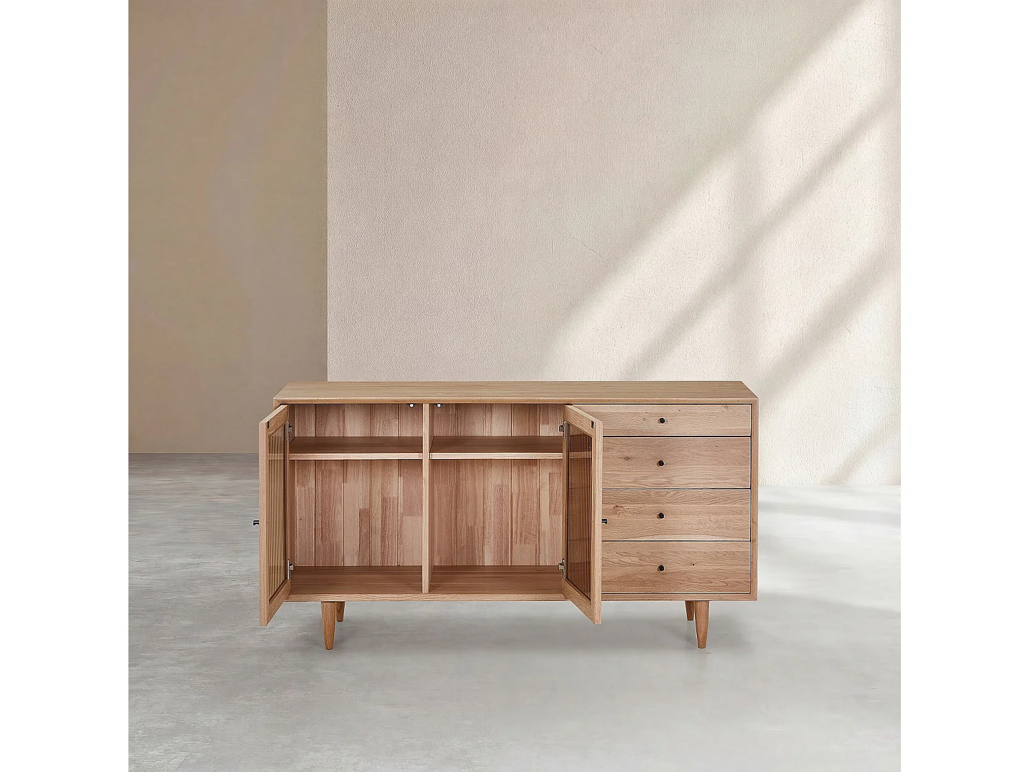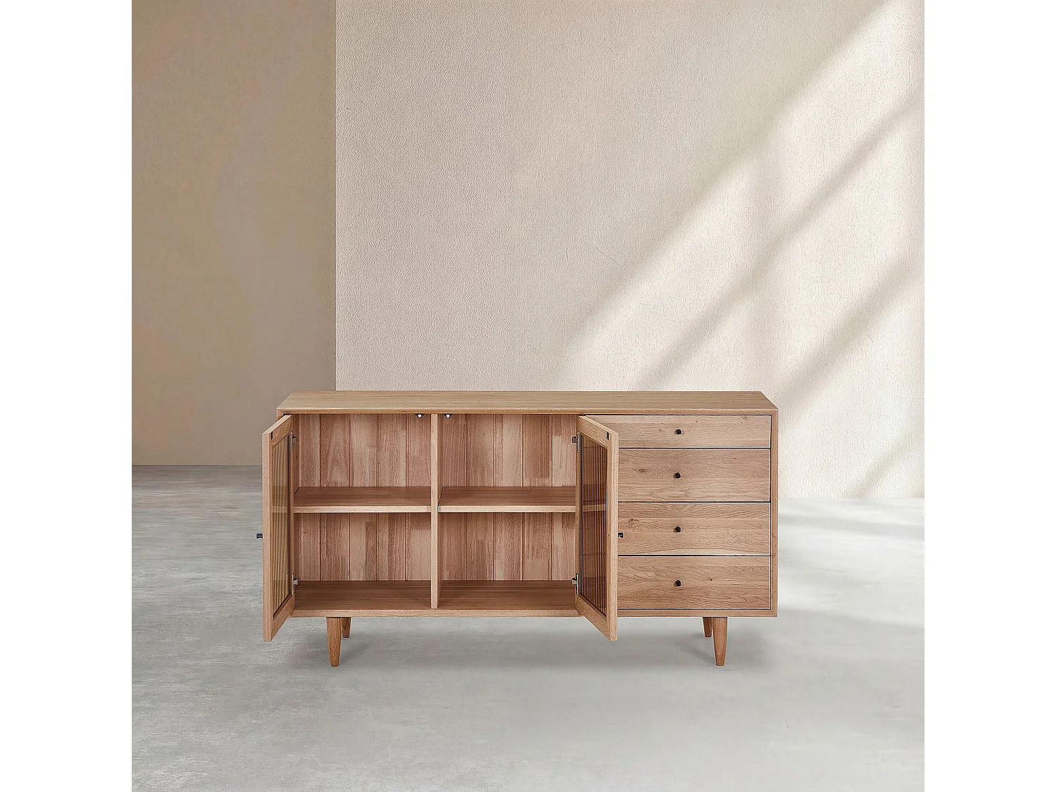 Buffet bas 2 portes en verre et 4 tiroirs en chêne massif - Naturel