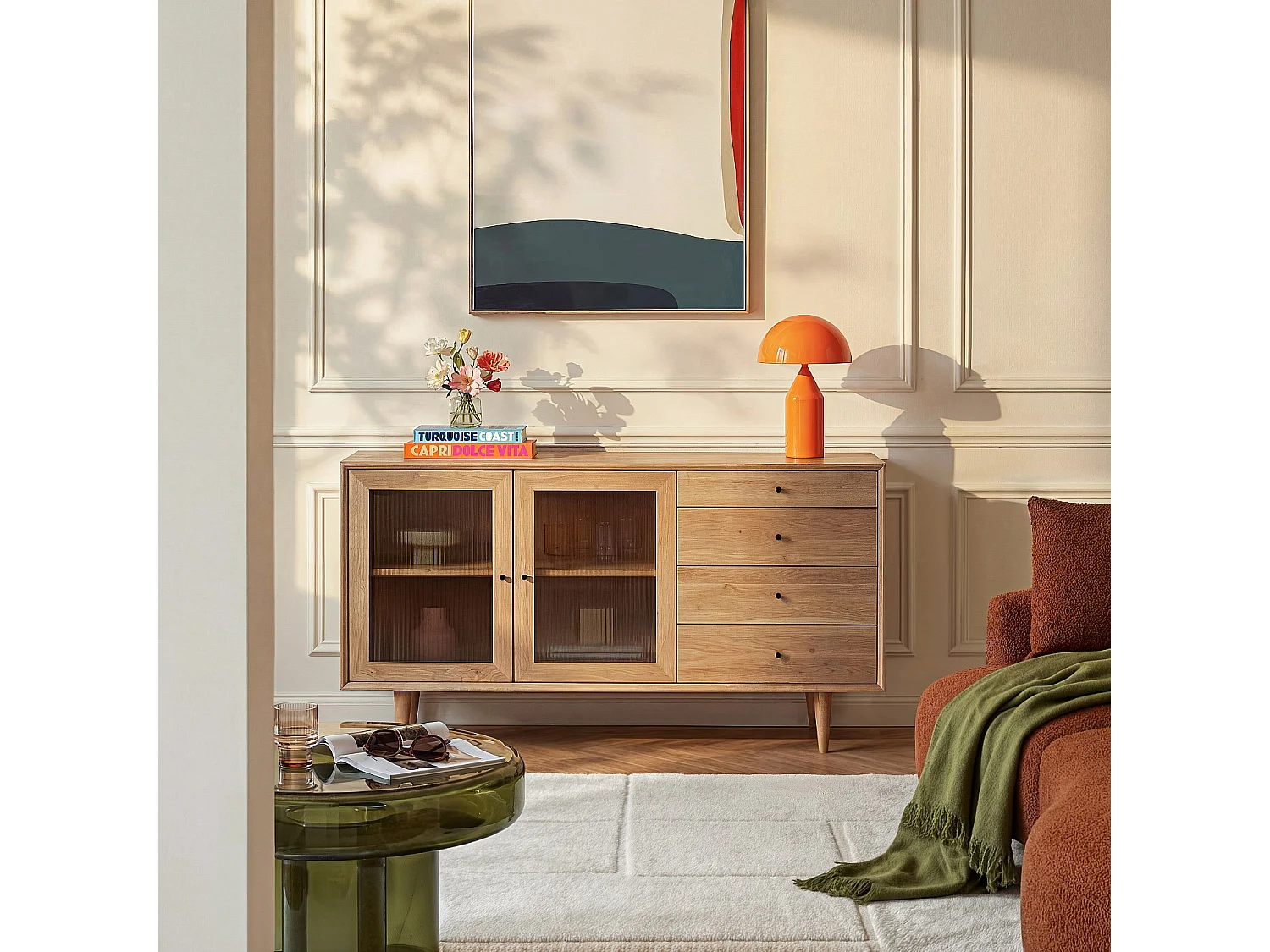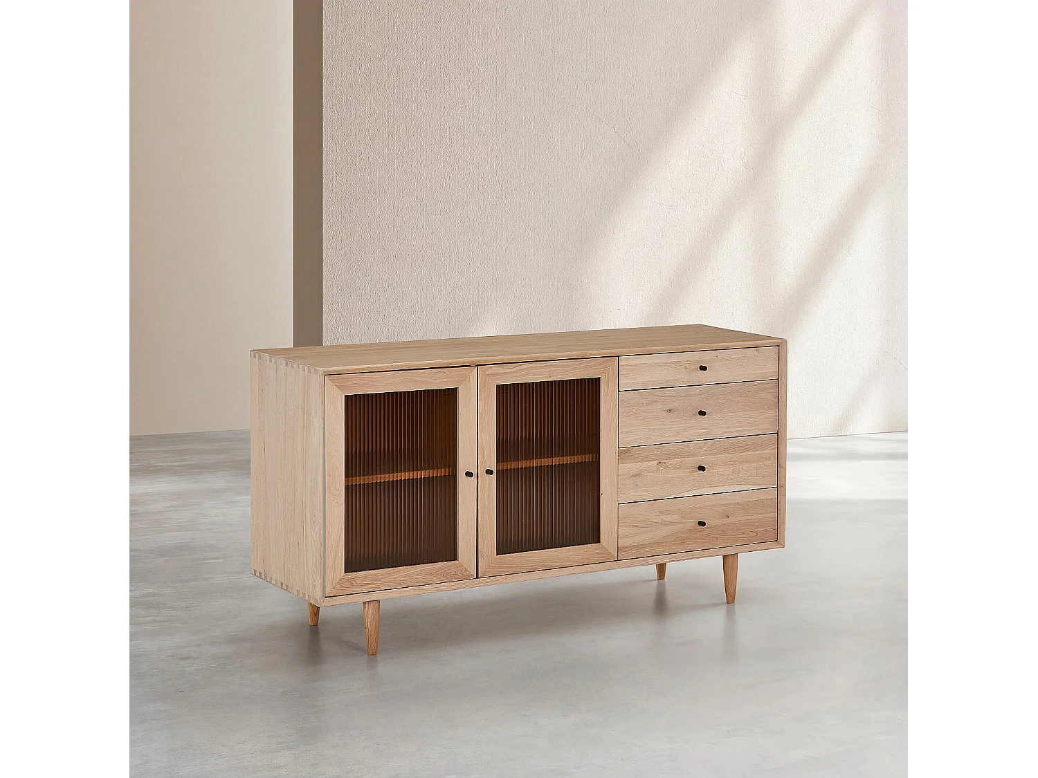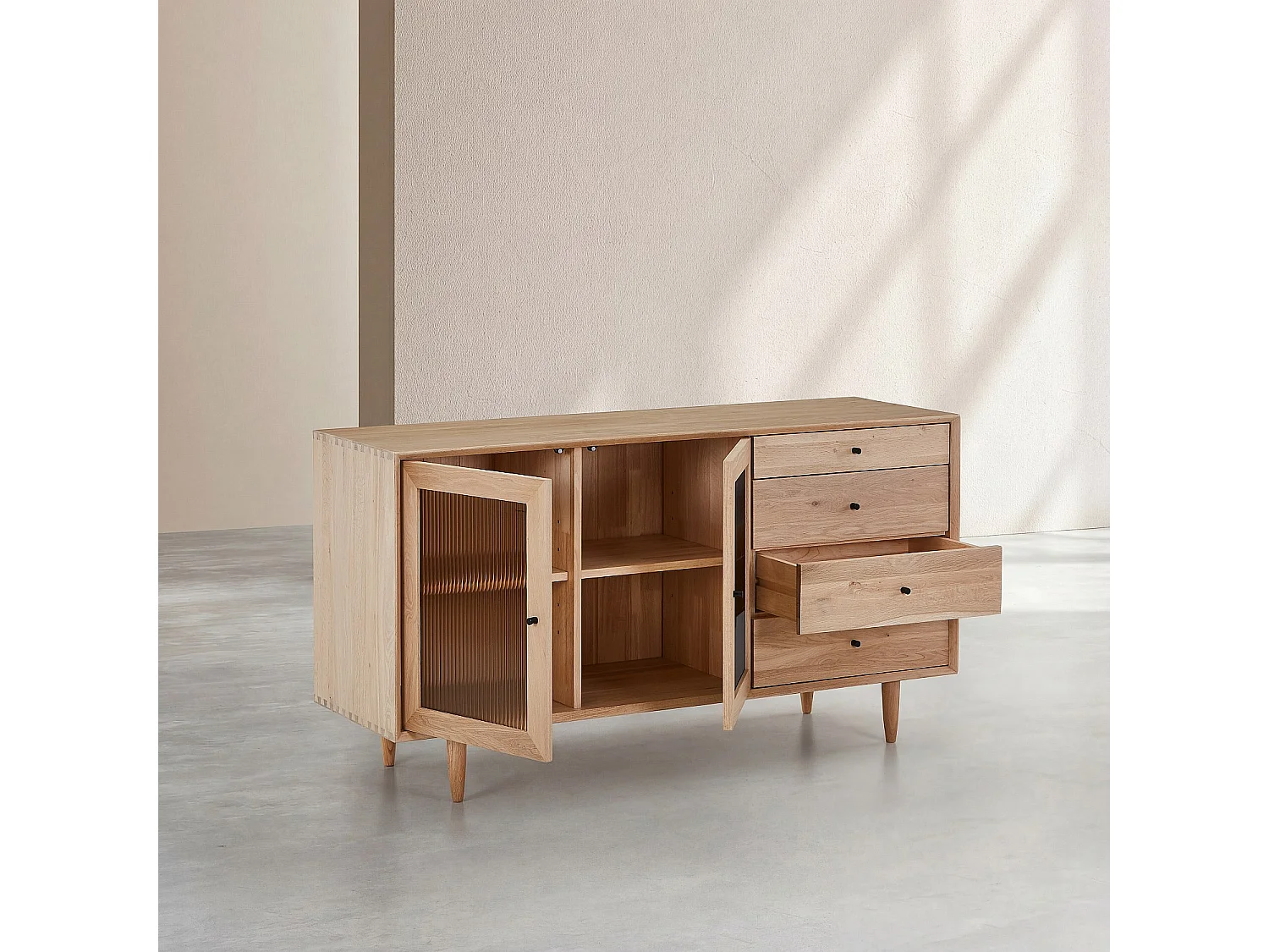 Buffet bas 2 portes en verre et 4 tiroirs en chêne massif - Naturel
