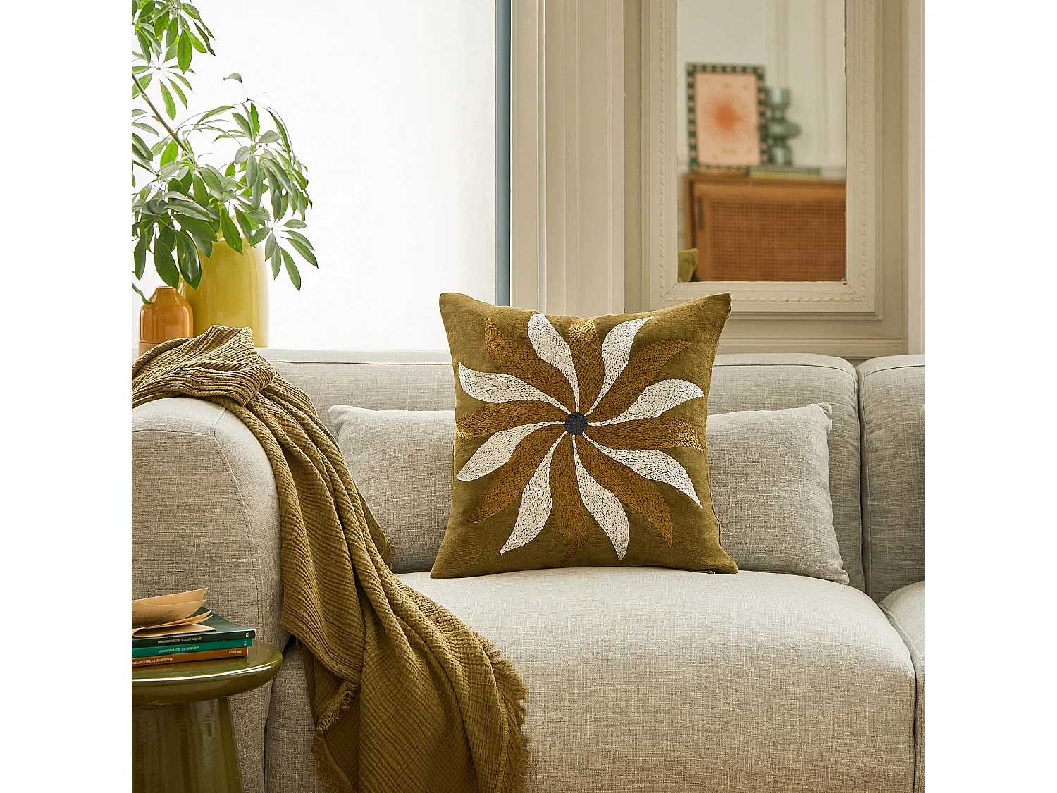 Habitat - Coussin brodé en lin et coton - 30 x 70 cm - Vert, bronze et jaune - Design by Floriane Jacques - Castille