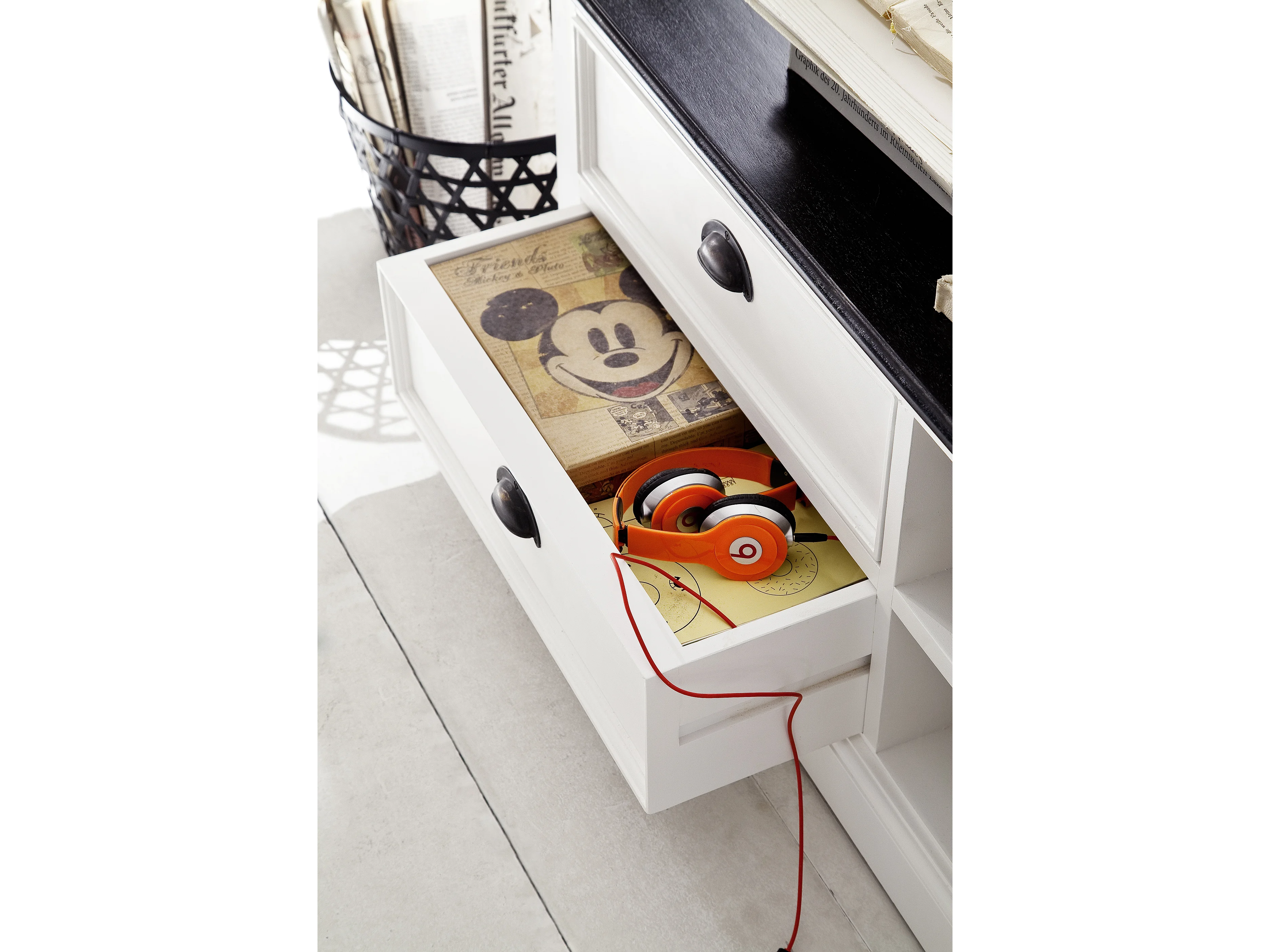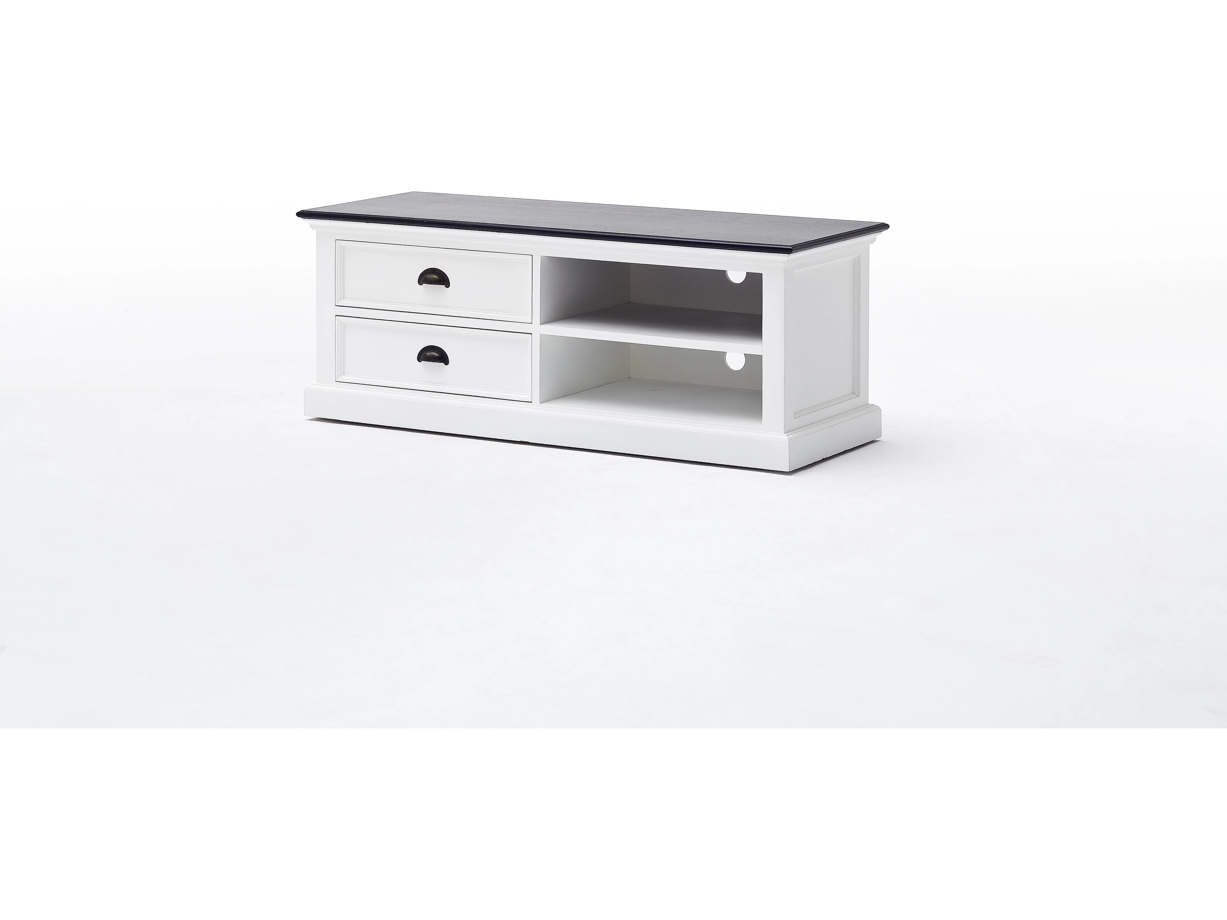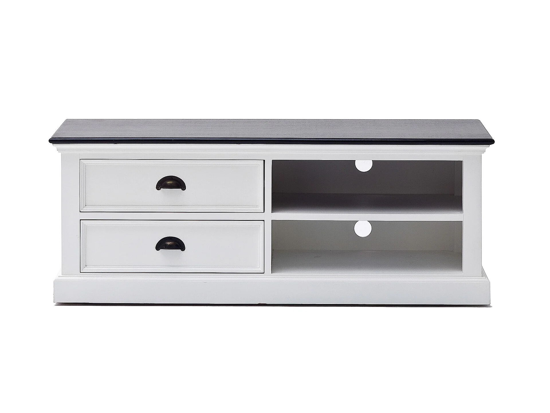 HalifaxContrast Meuble TV avec 2 tiroirs et 1 tablette de rangement blancs avec plateau supérieur noir.