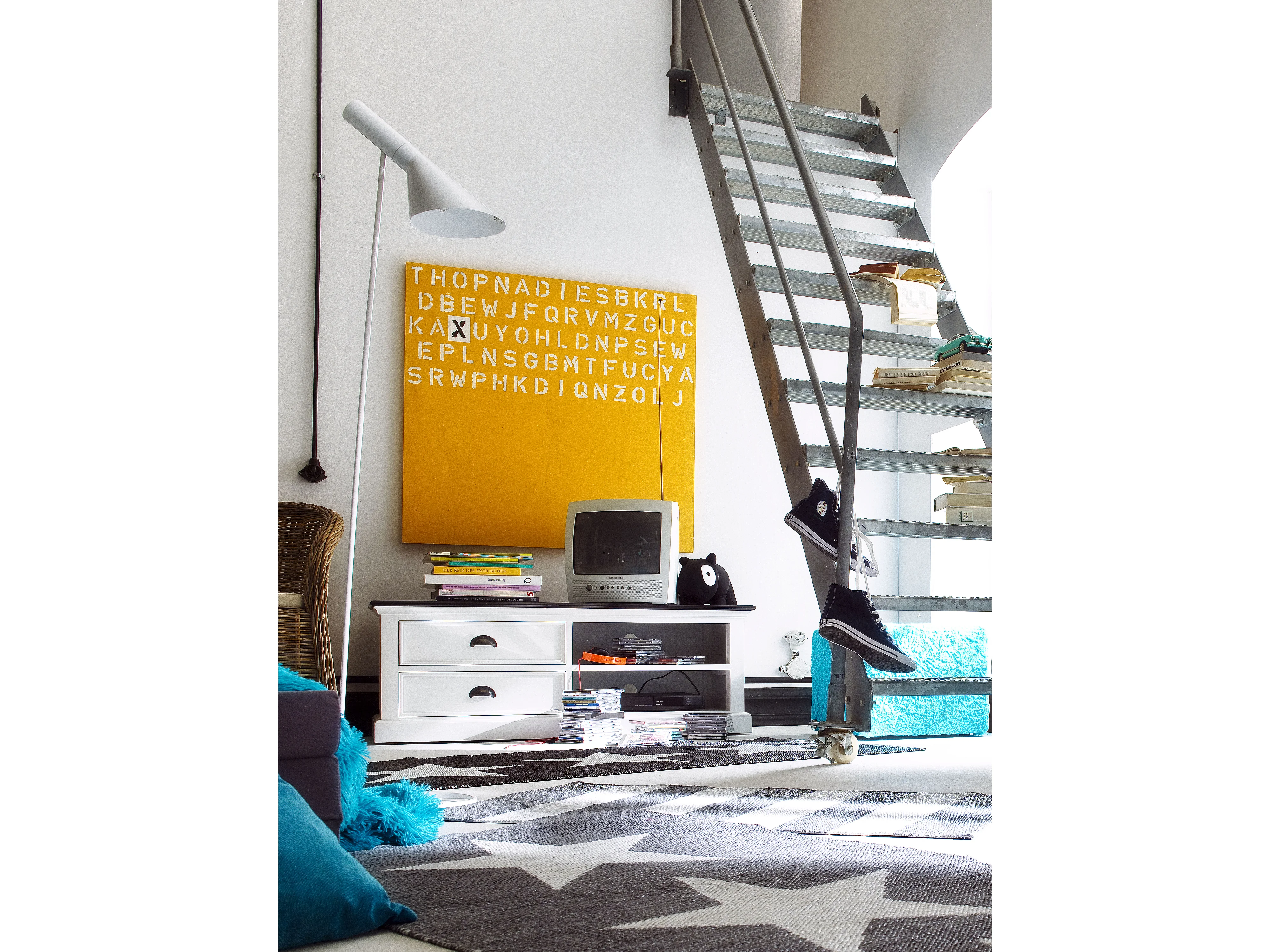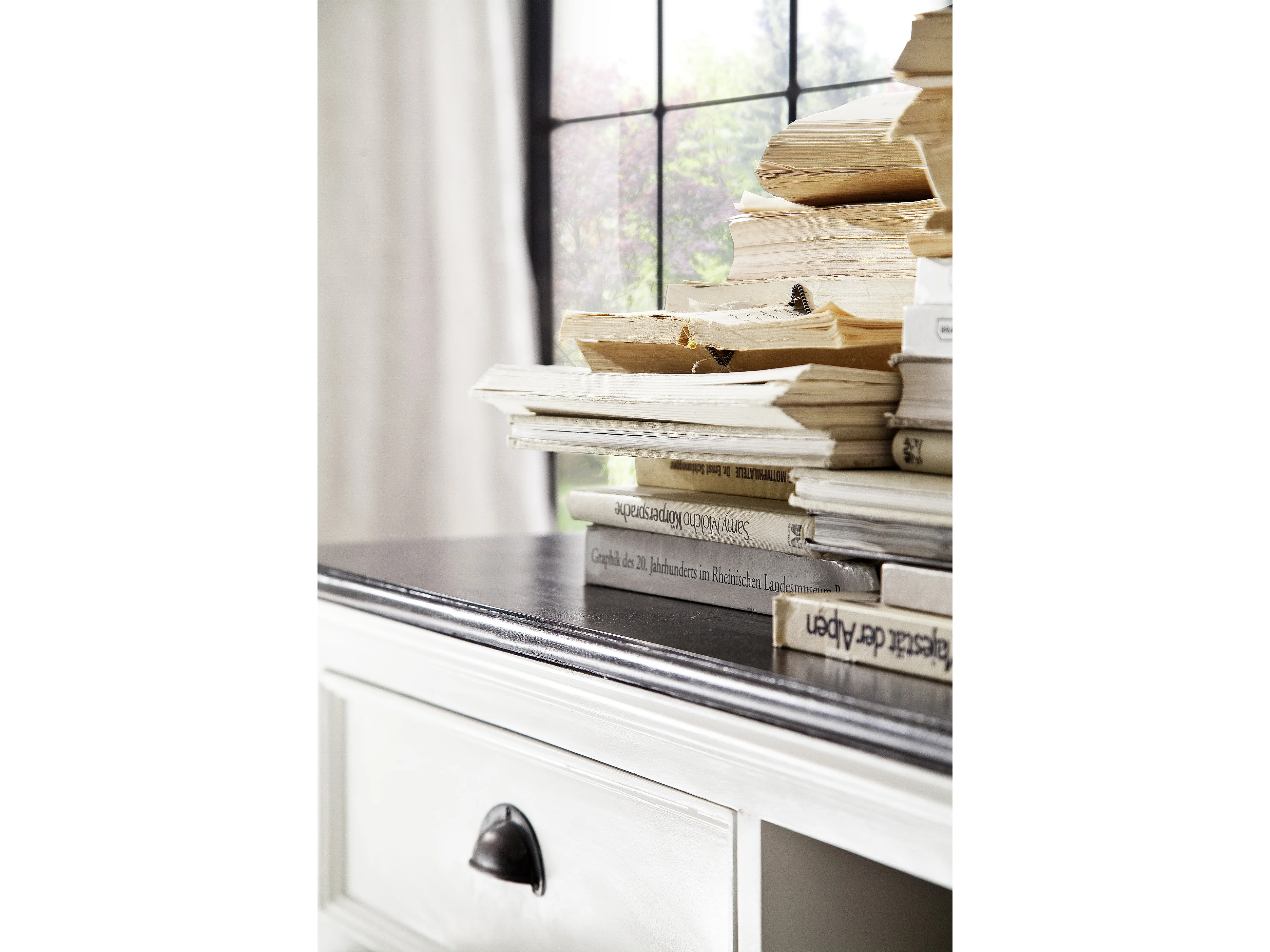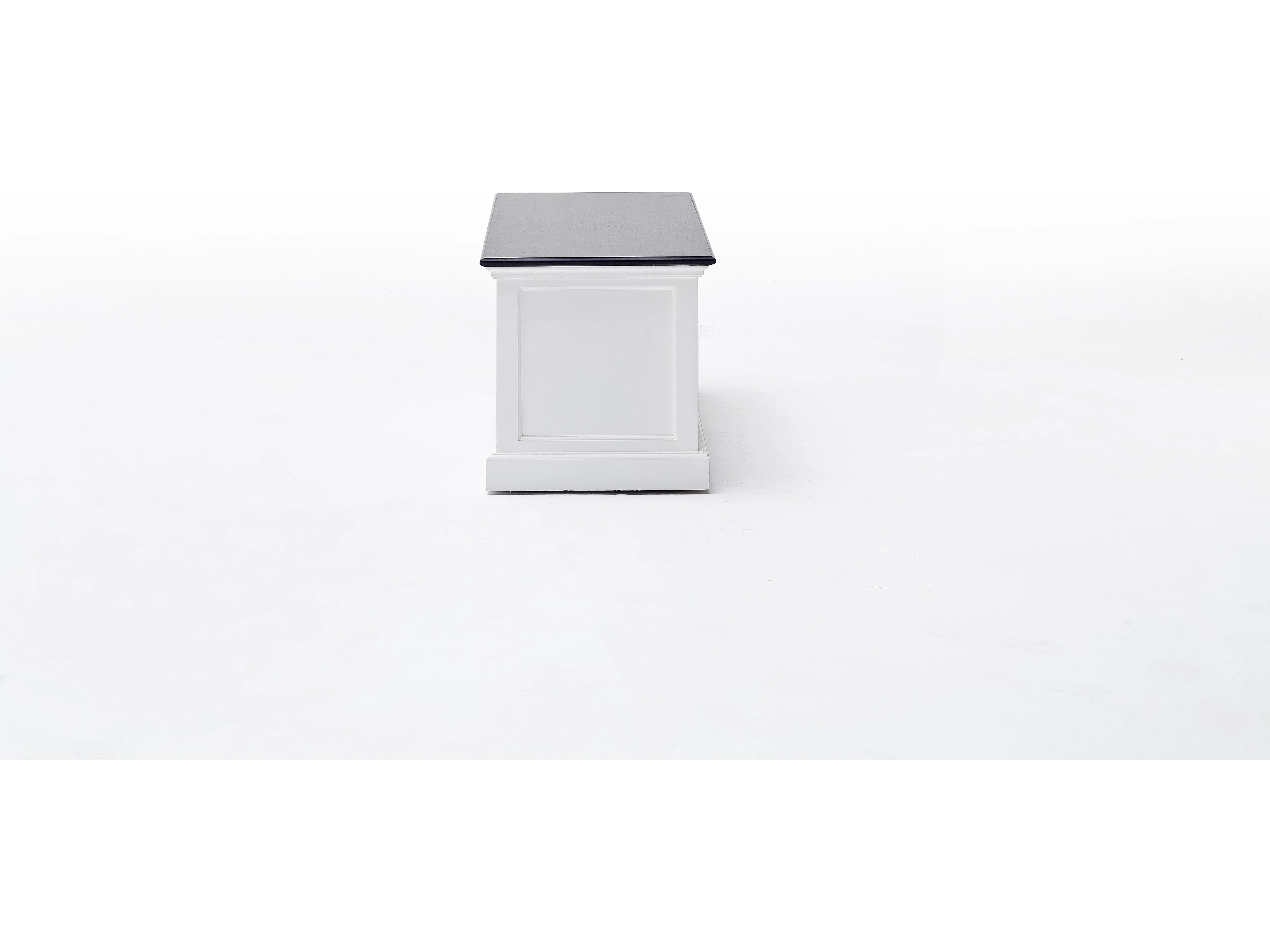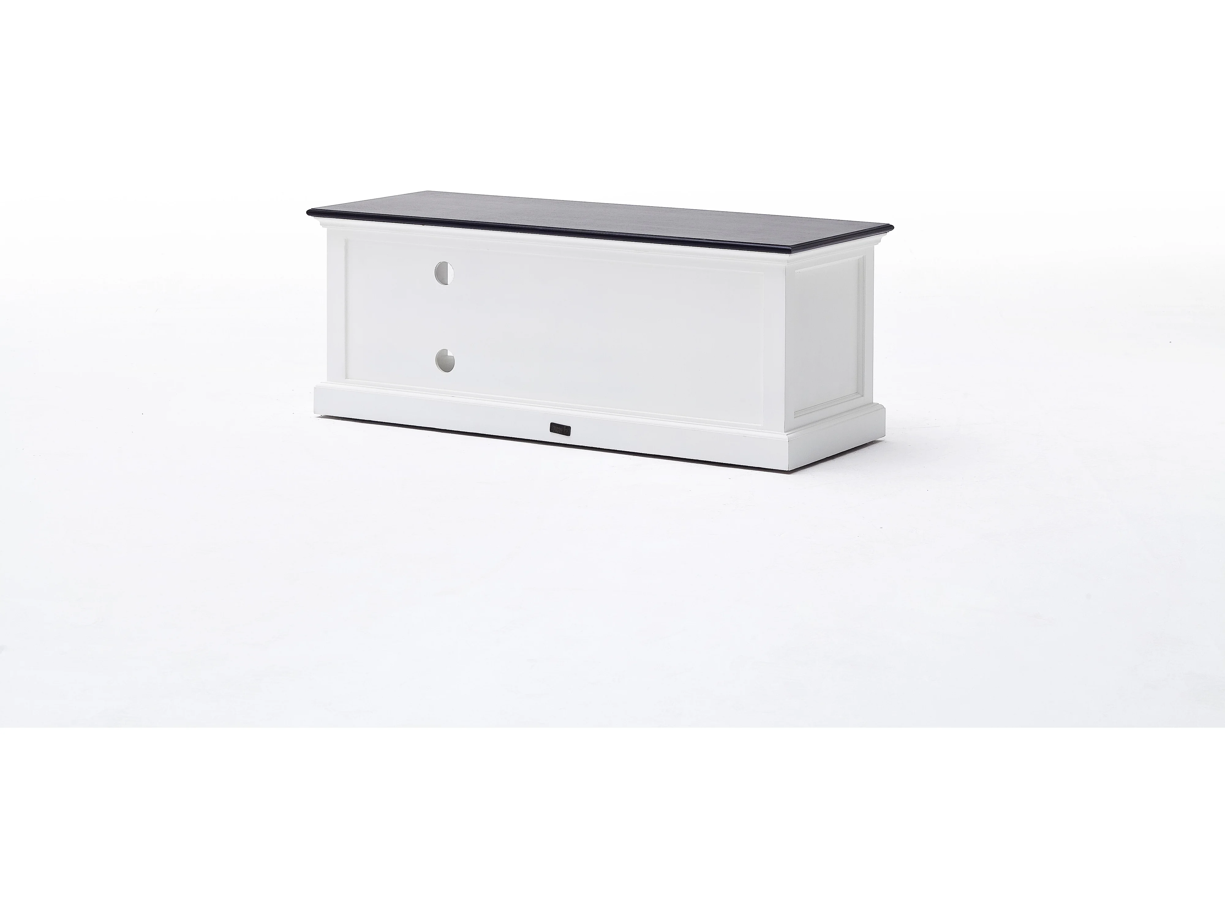 HalifaxContrast Meuble TV avec 2 tiroirs et 1 tablette de rangement blancs avec plateau supérieur noir.