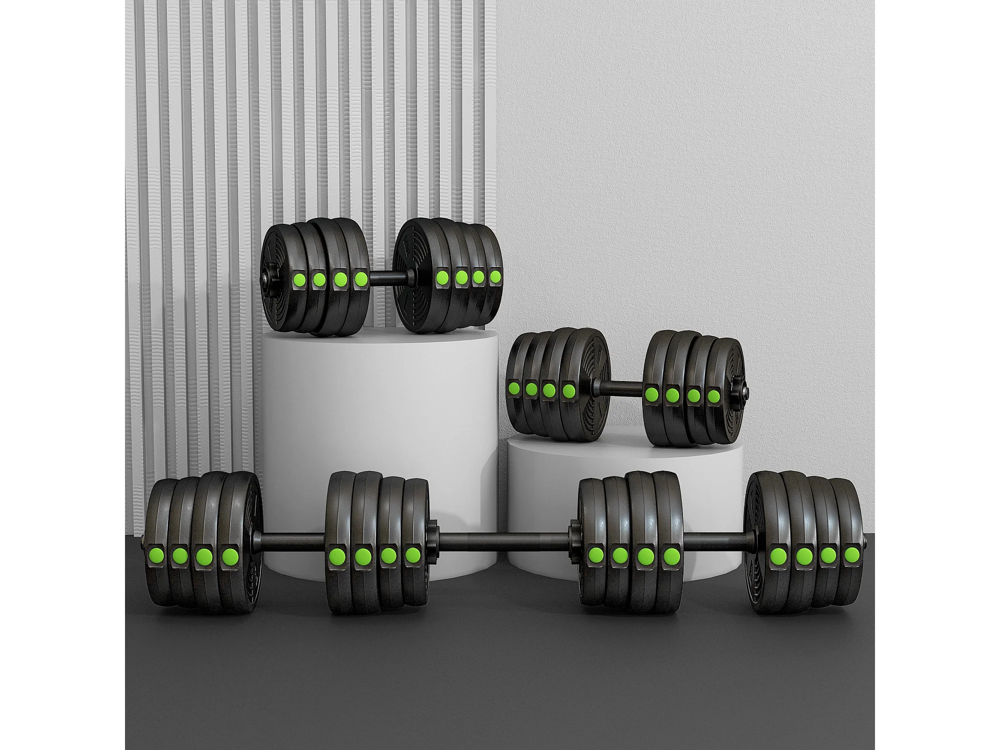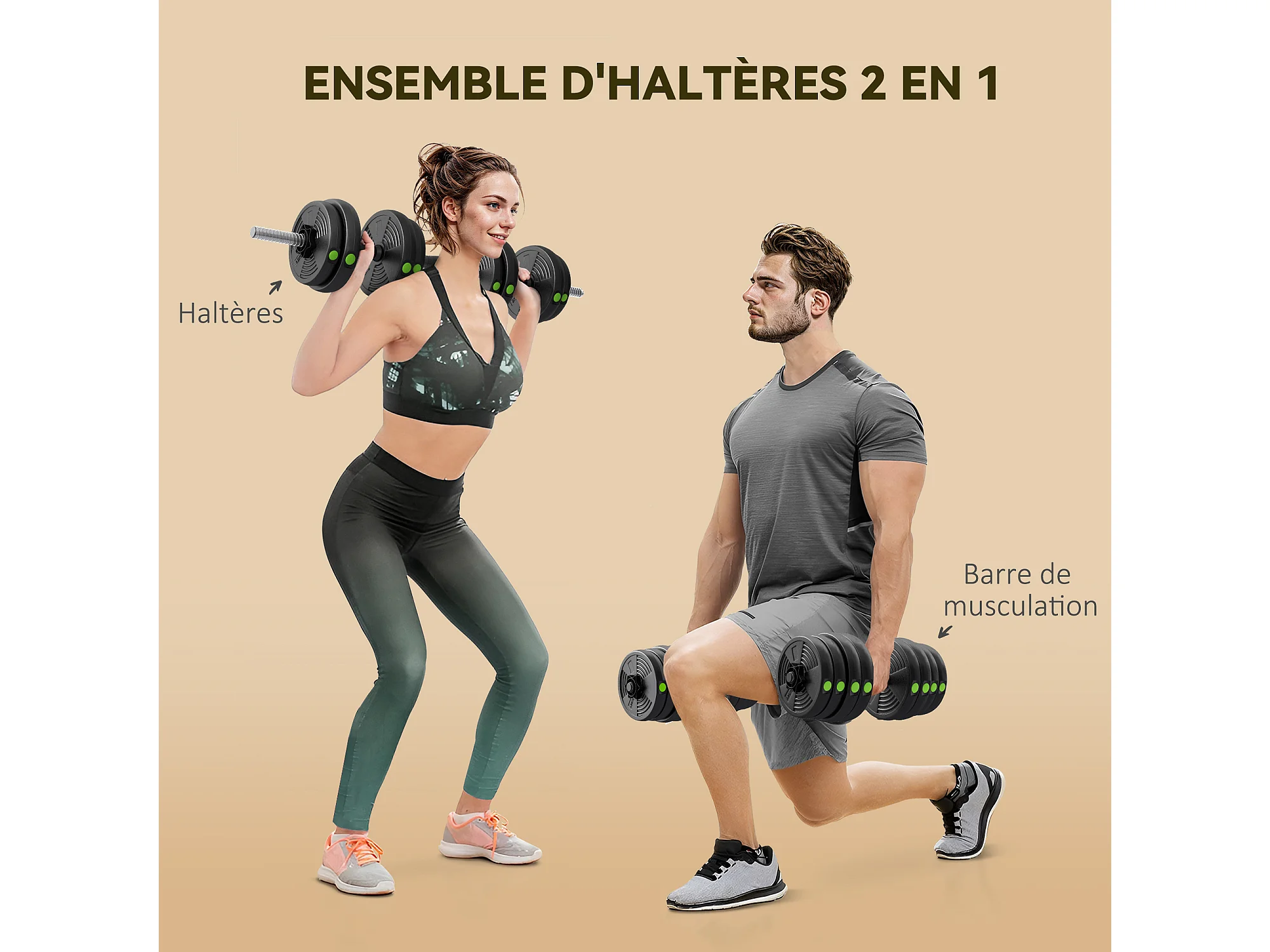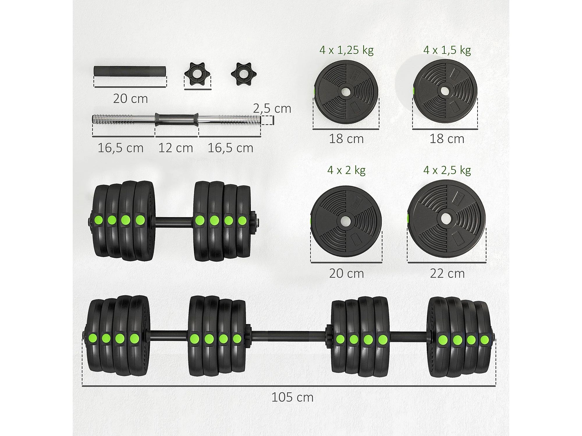 Haltères 2 en 1 réglables - haltères libres 30 Kg - barres incluses - entraînement musculaire & haltérophilie - noir vert