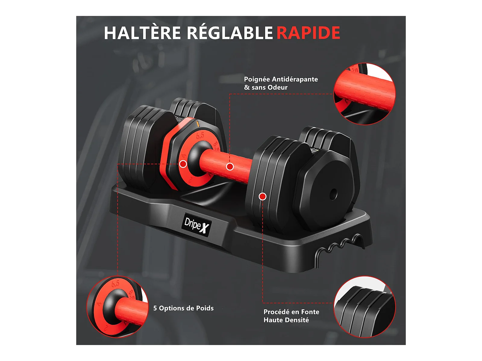 Haltères réglables 2-24,5 kg, 5/10 en 1 avec base de rangement, compact, pratique pour musculation, home gym et salle de sport
