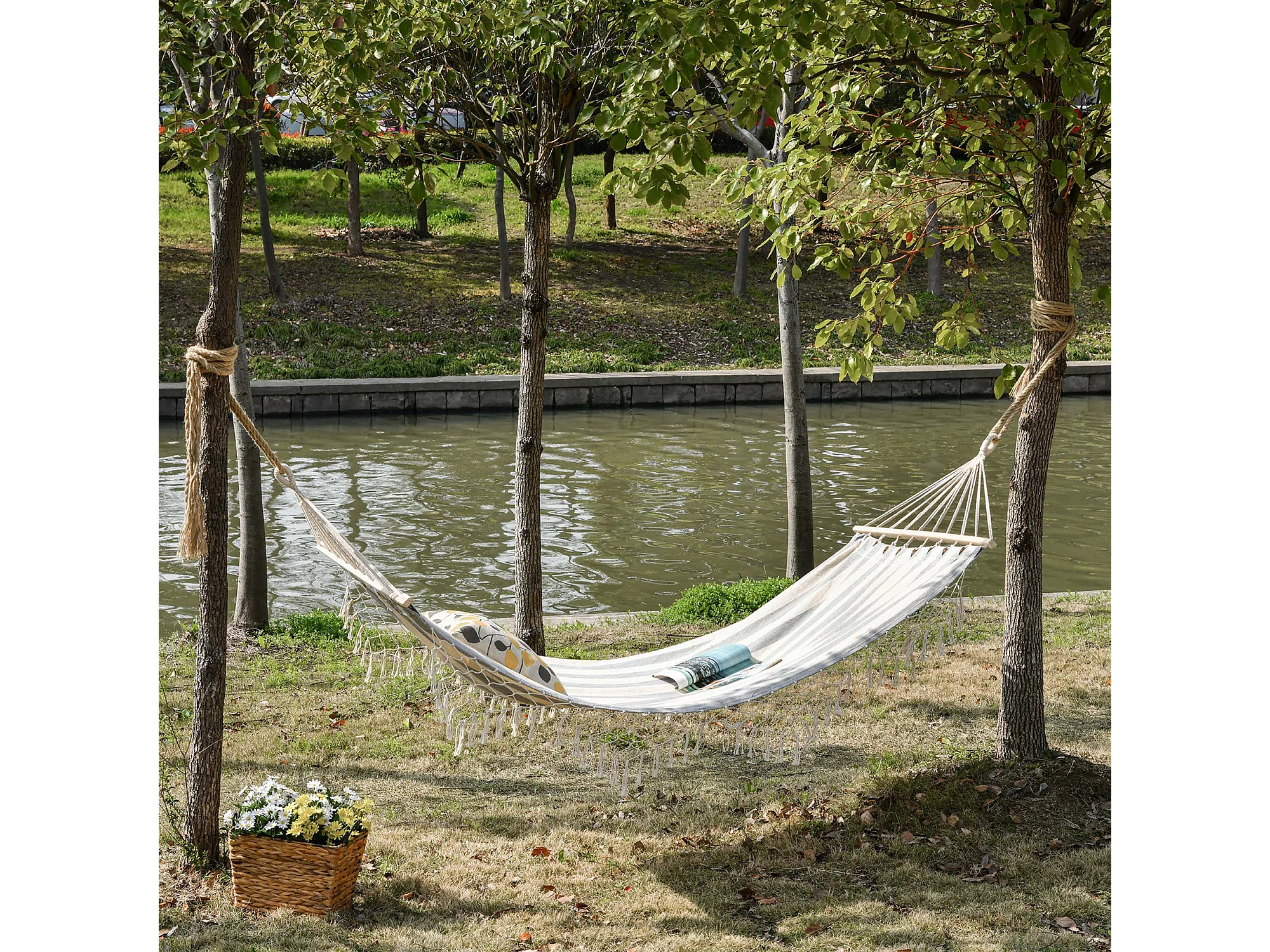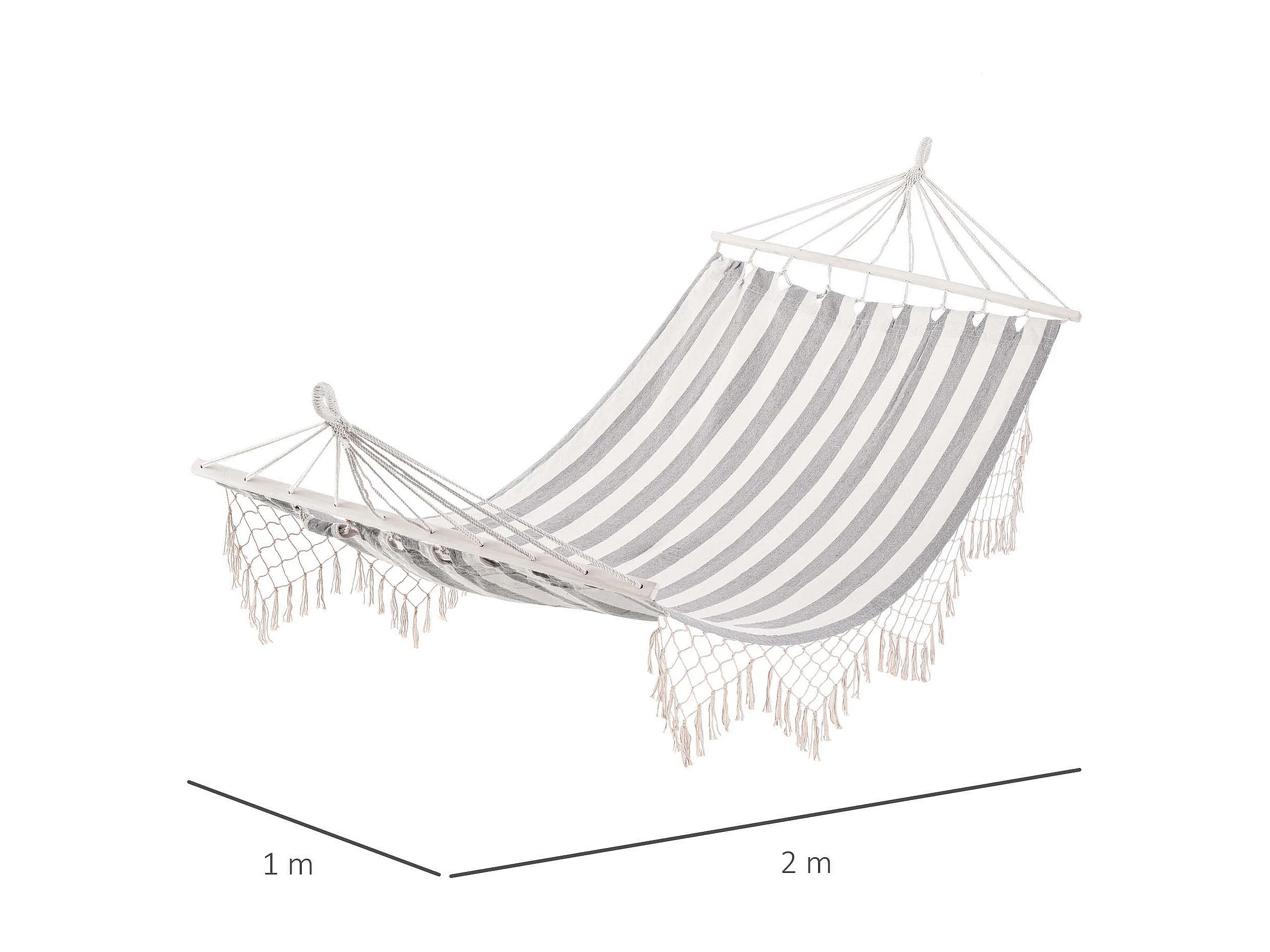 Hamac de voyage portable style hippie chic toile de hamac dim. 2L x 1l m coton polyester gris écru rayé