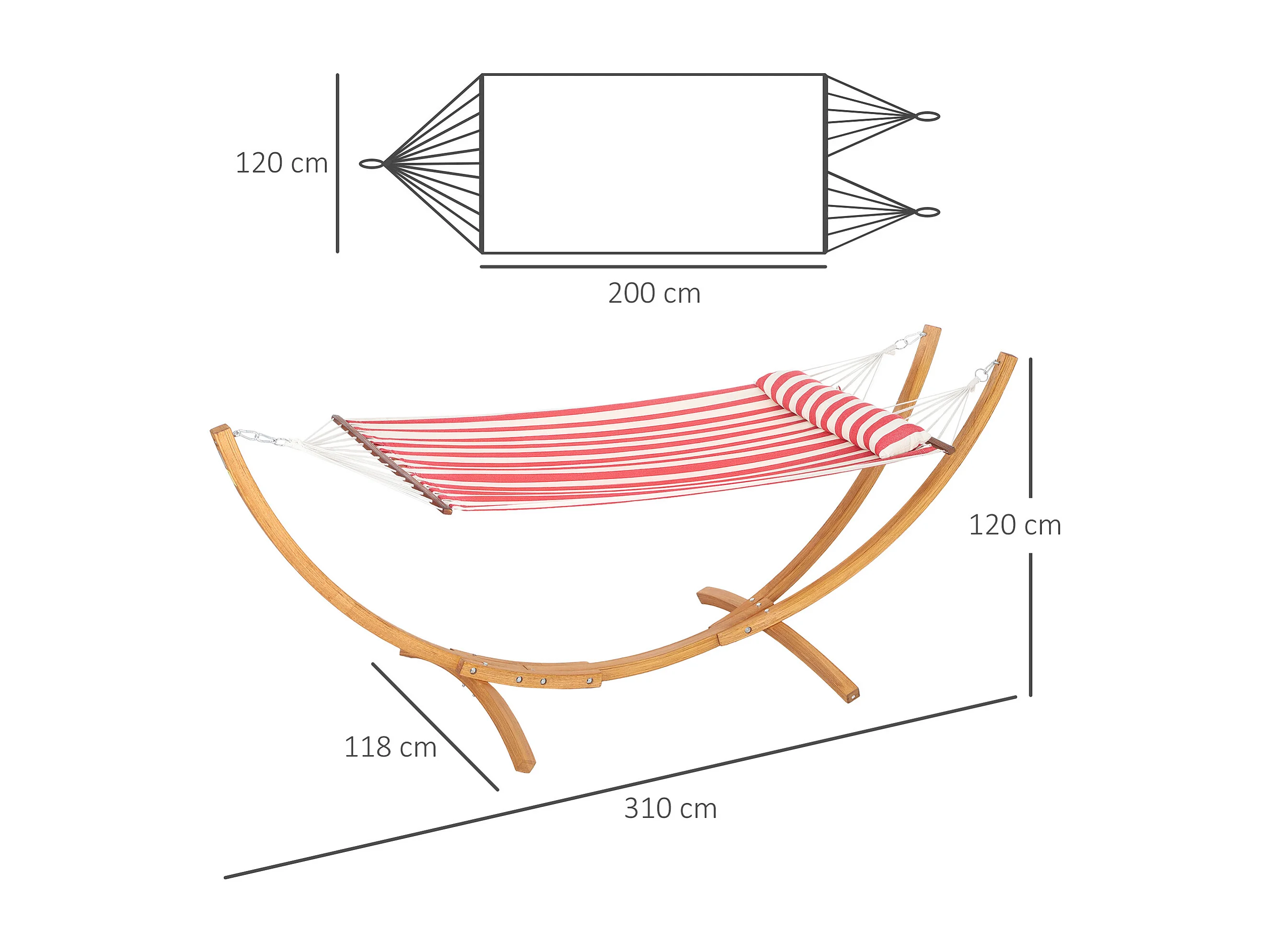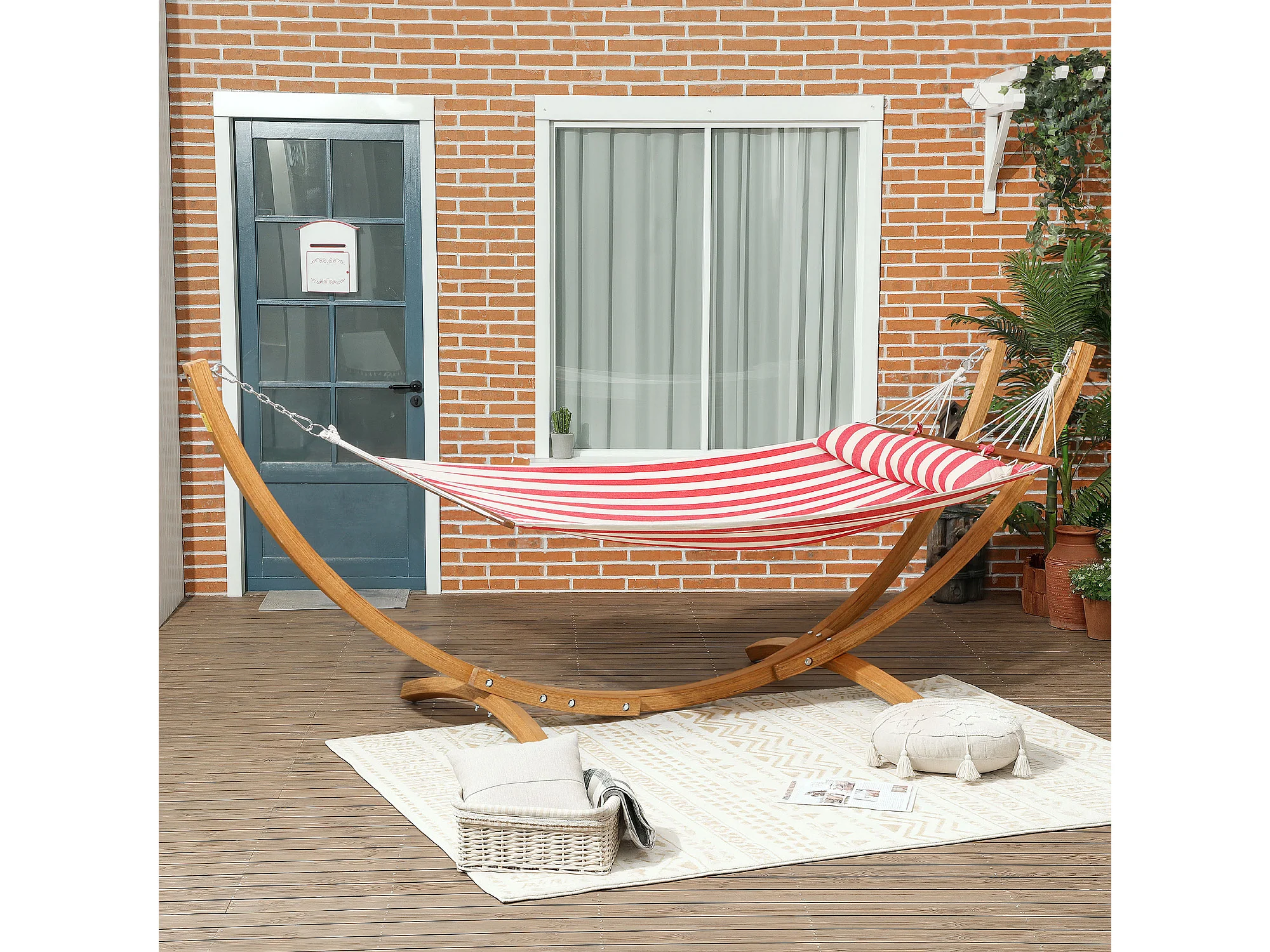 Hamac sur pied en bois - 1 place - bois teinte teck toile 100% coton rouge blanc rayée