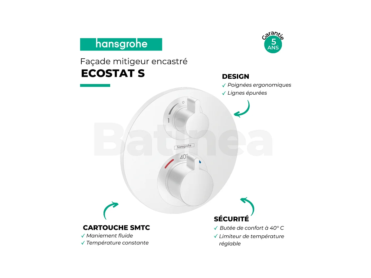 HANSGROHE Facade pour mitigeur thermostatique encastré Ecostat S avec robinet d'arrêt et inverseur blanc mat avec Corps encastré