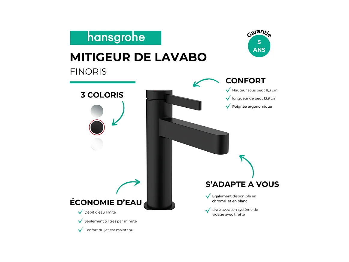 HANSGROHE Mitigeur de lavabo 110 avec tirette et vidage noir mat Finoris