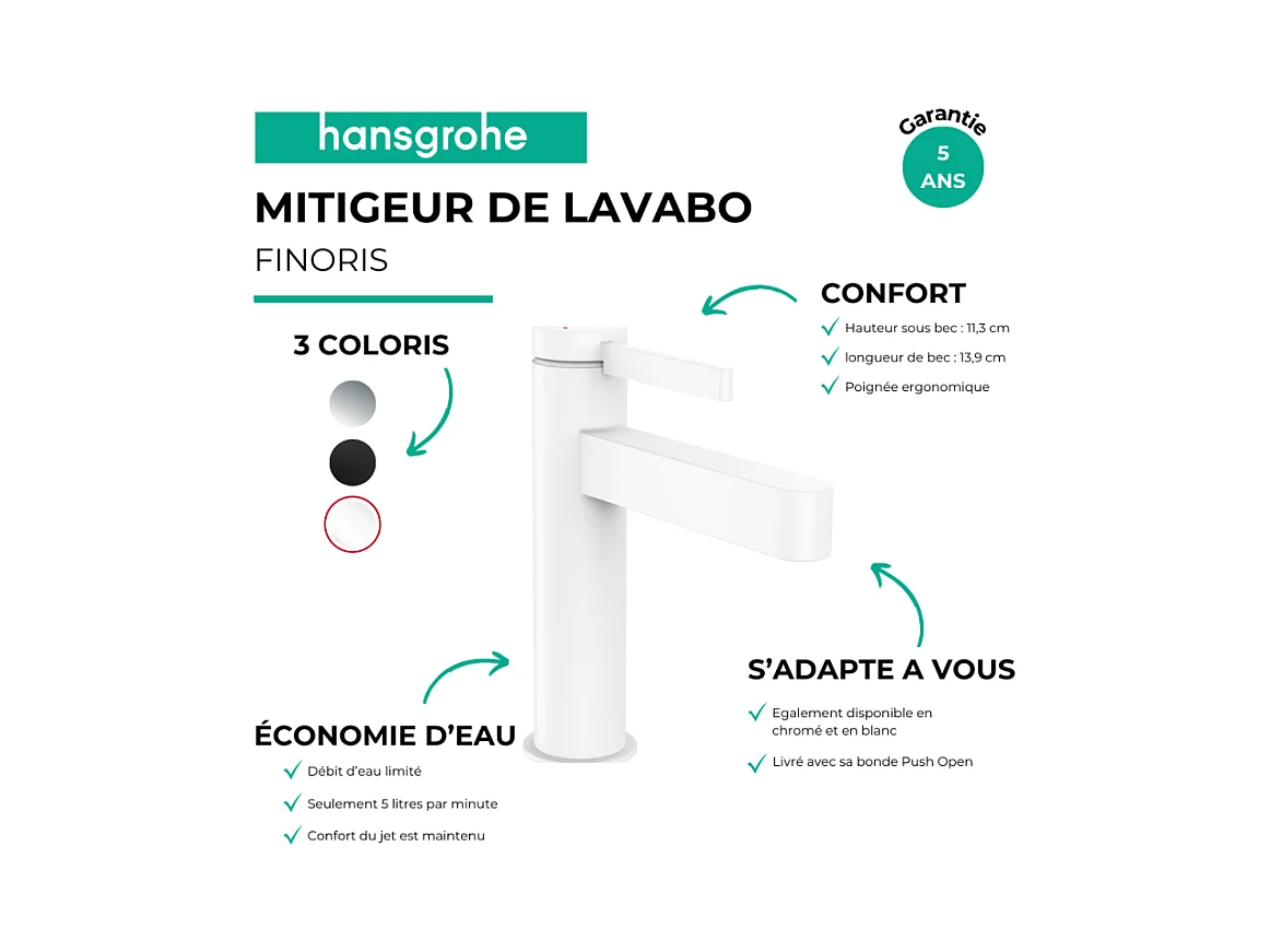 Lot de 2 mitigeurs lavabo HANSGROHE Finoris 110 avec bonde Push-Open blanc mat
